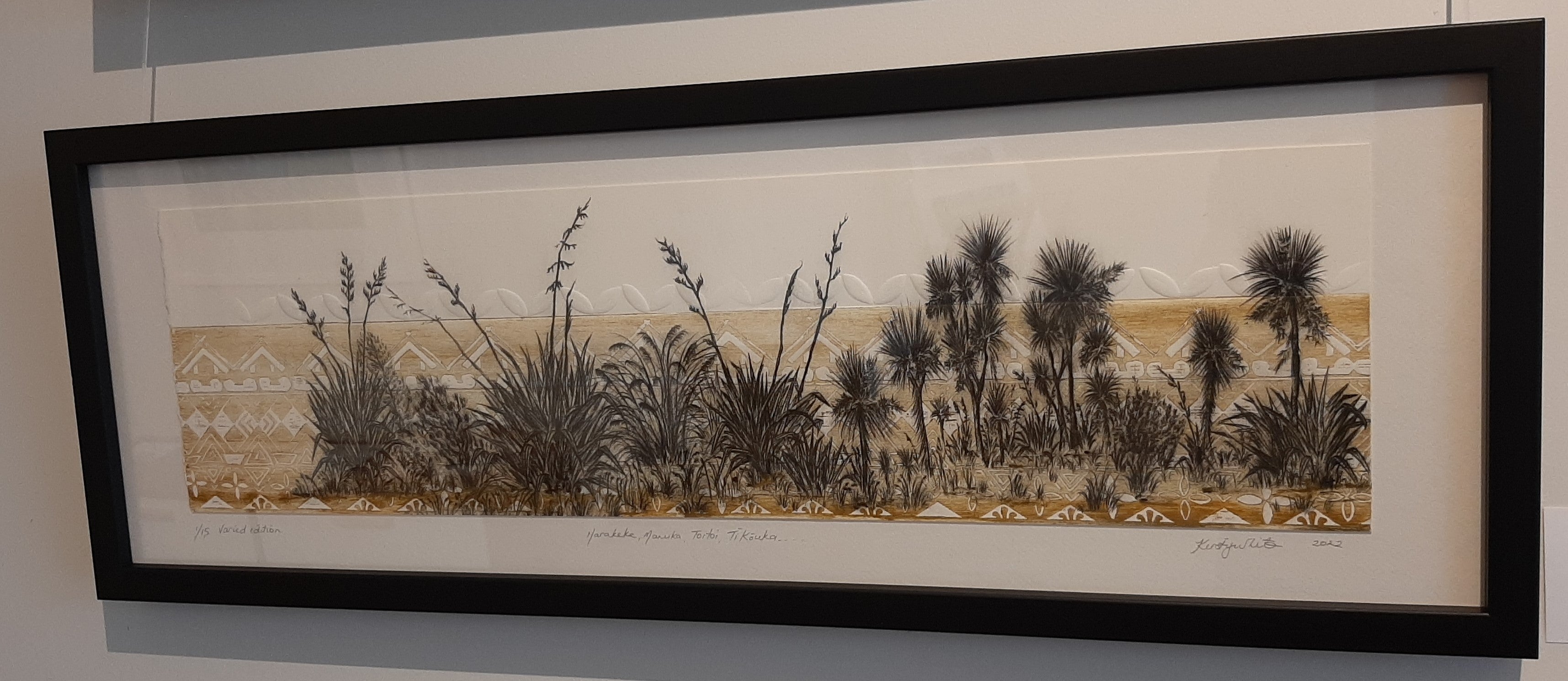 Inspired by Maori whakairo, Fijian masi cloth and Samoan tapa, Kirsty's landscapes are merged with patterning to reflect the history of a site. Mixed with the traditional etching style she uses for these landscapes, her artwork often sparks a nostalgic reaction to a favourite view.