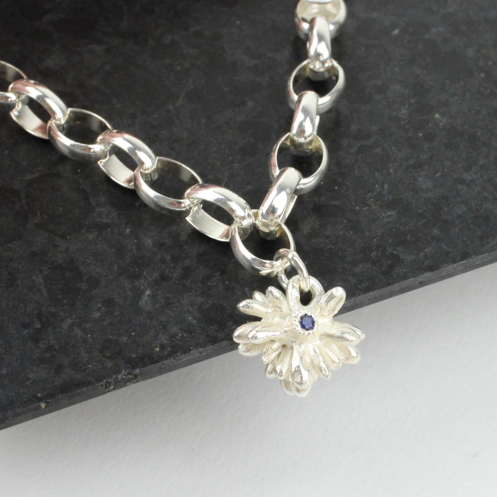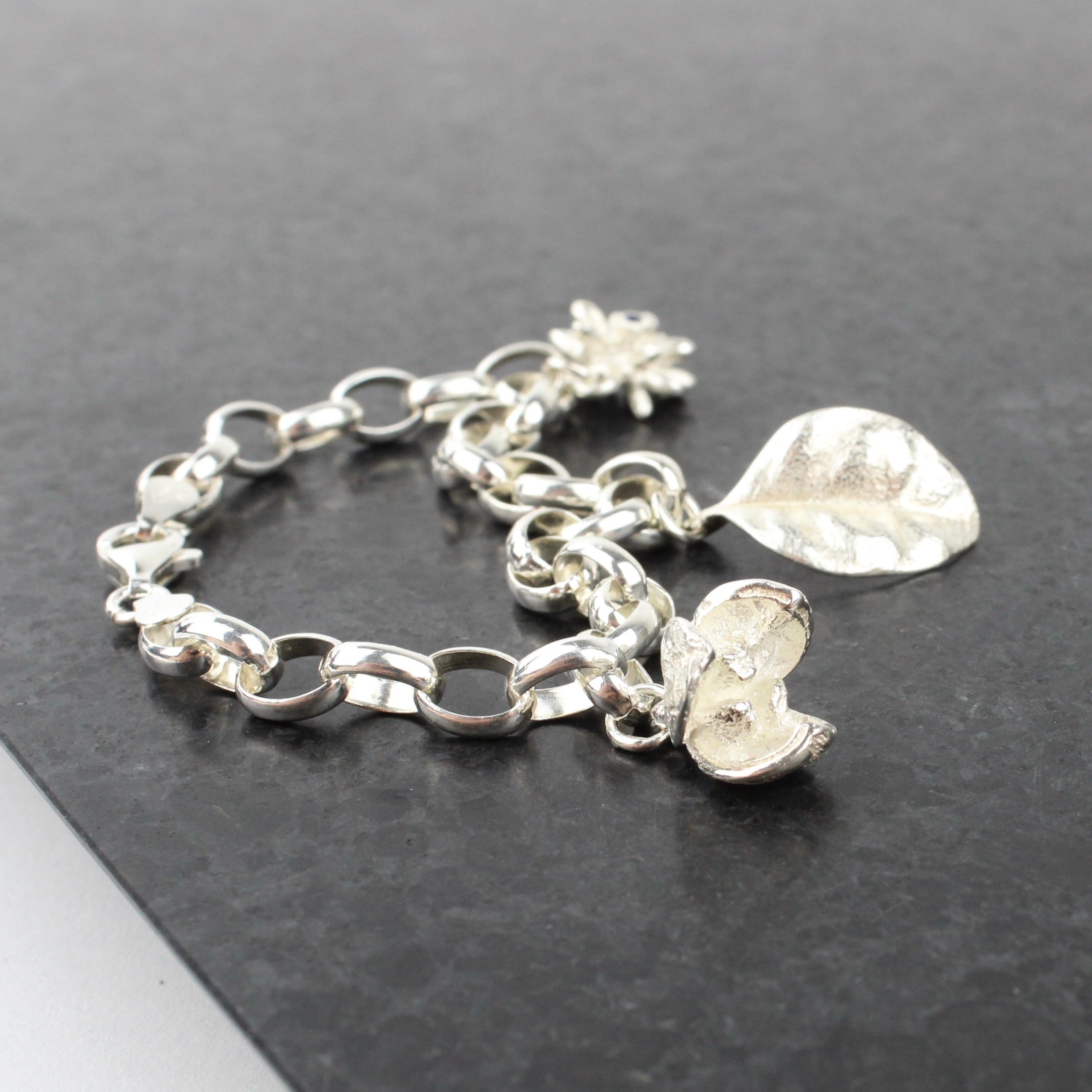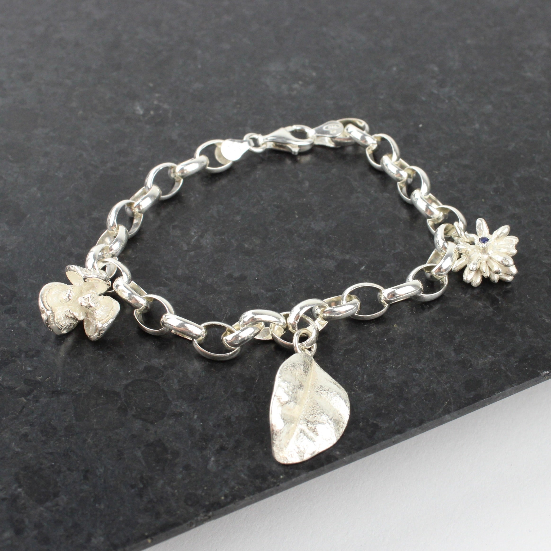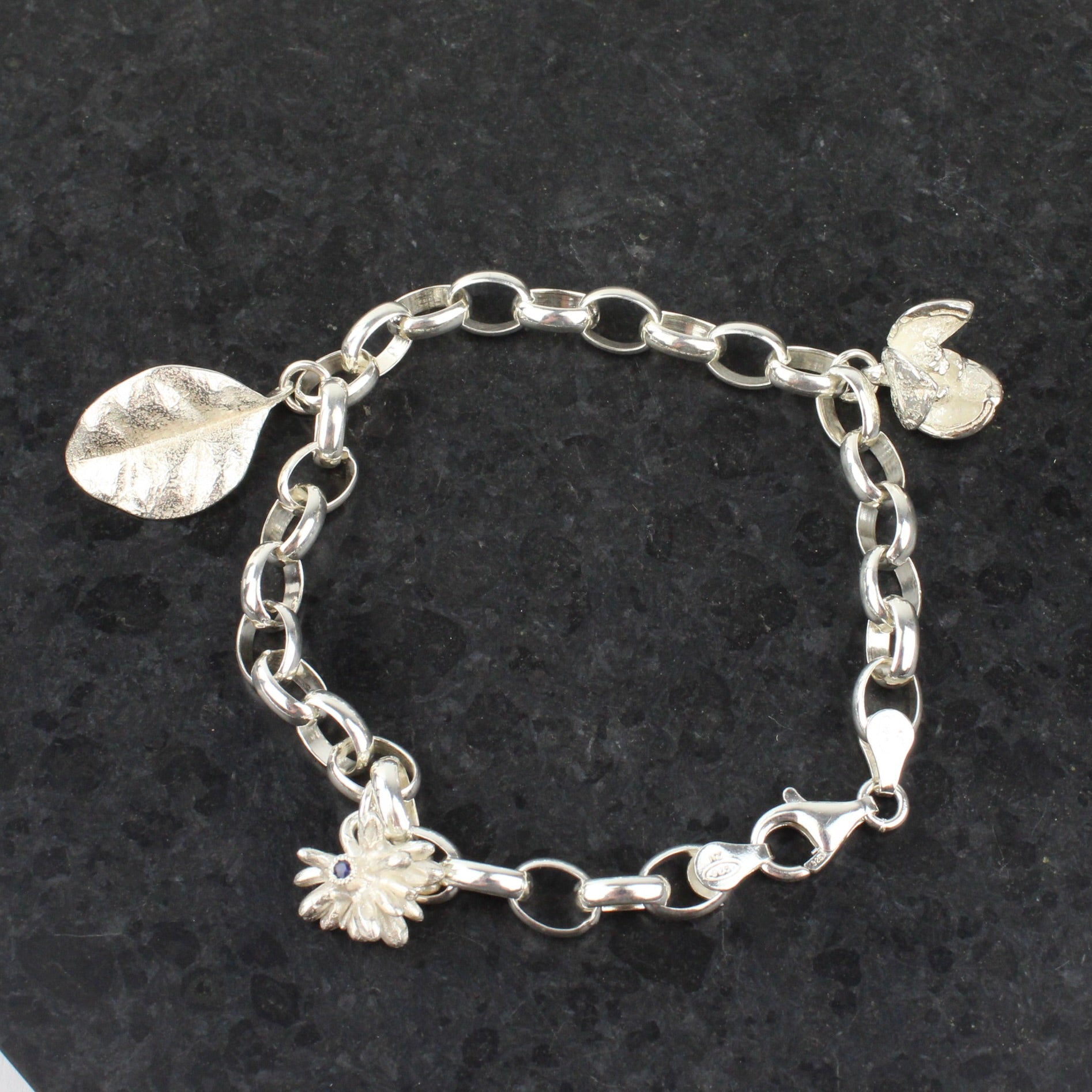 Sophie Divett's Botanical charm bracelet features three handmade, solid silver, native plant charms affixed upon an oval-belcher bracelet chain with small-sized links.