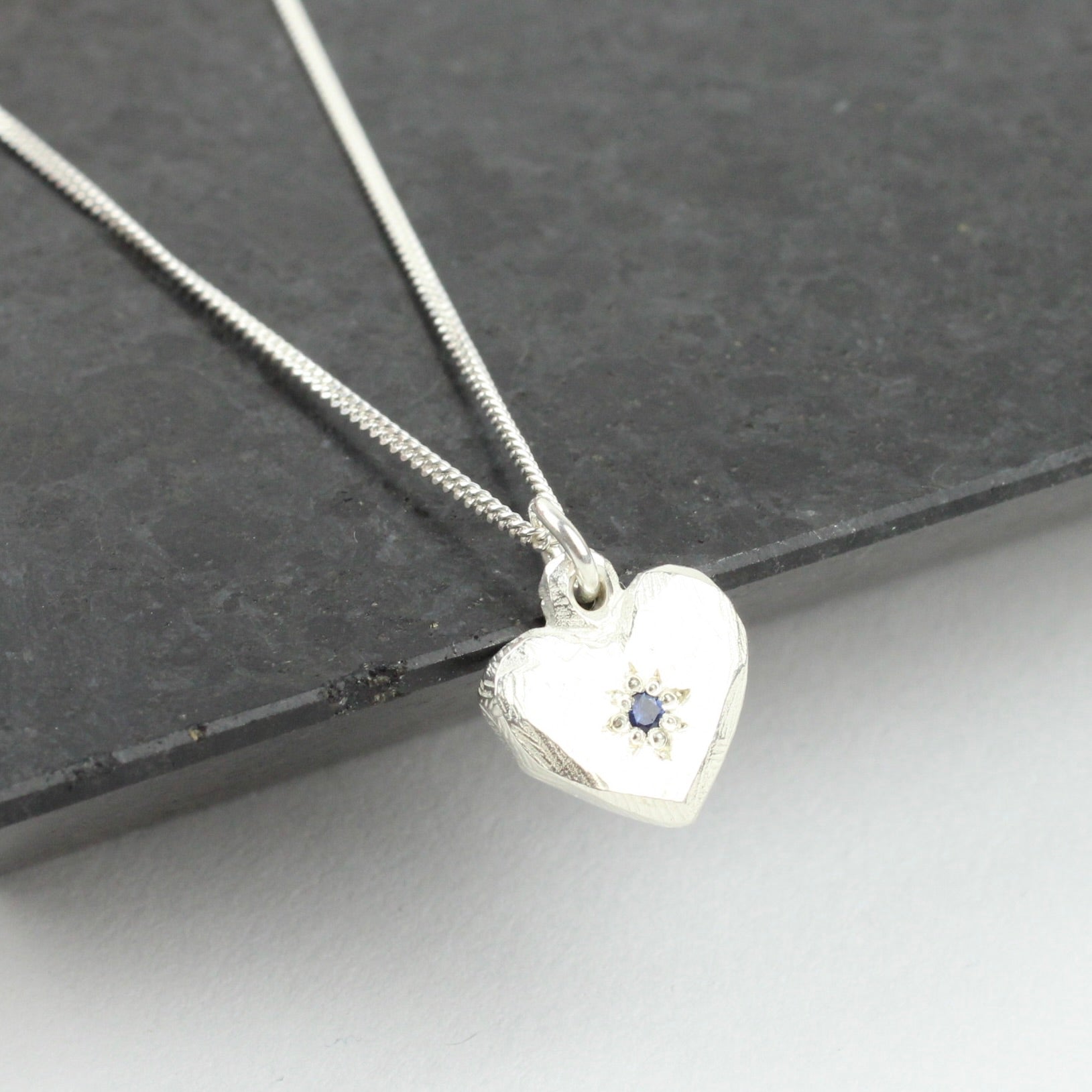 Heart pendant is hand crafted in solid sterling silver and features an orange garnet in a star-like central setting. It has subtle, organically carved, detailing around the edges.