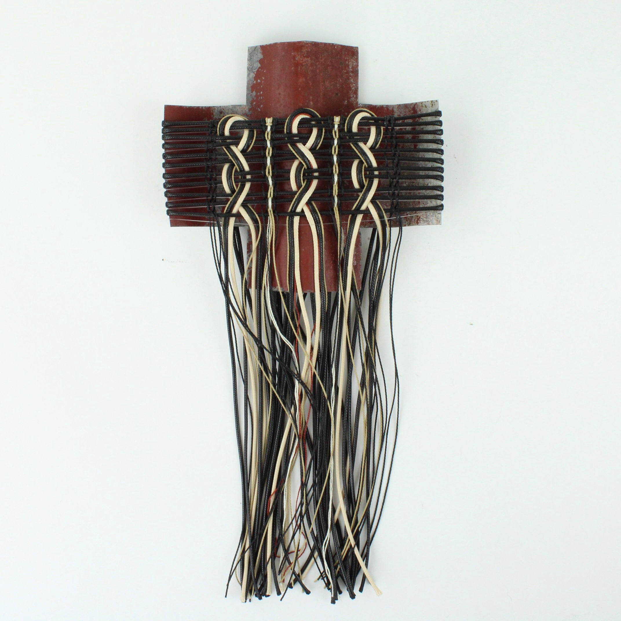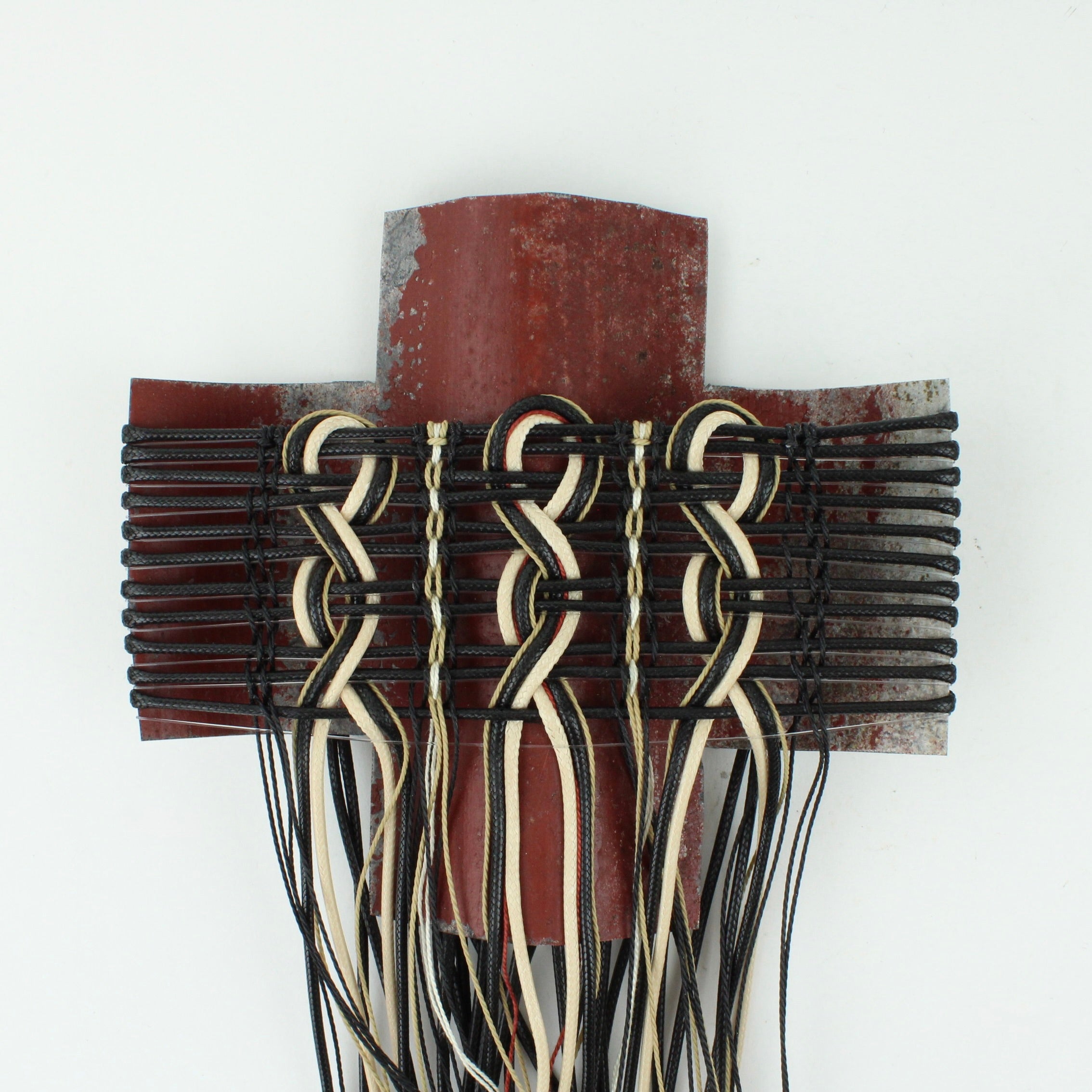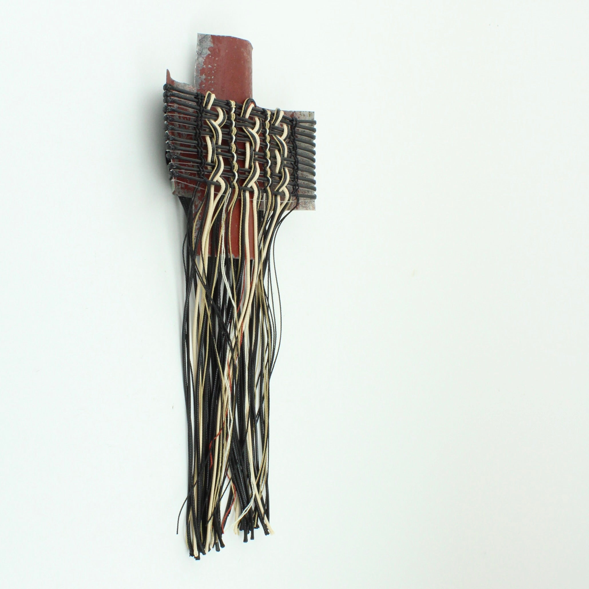 Corrugated iron with woven waxed cord, fishing line and mercerised thread
