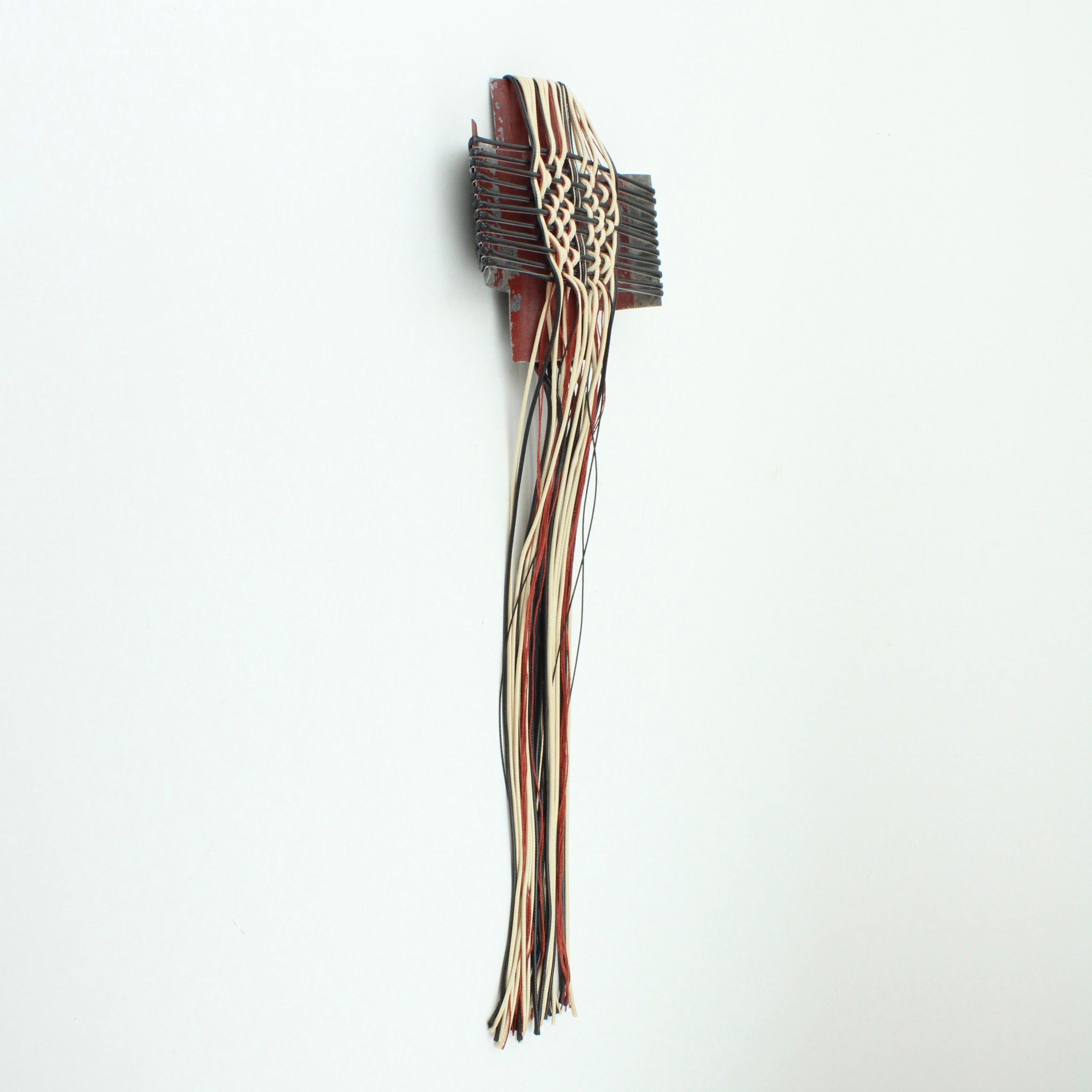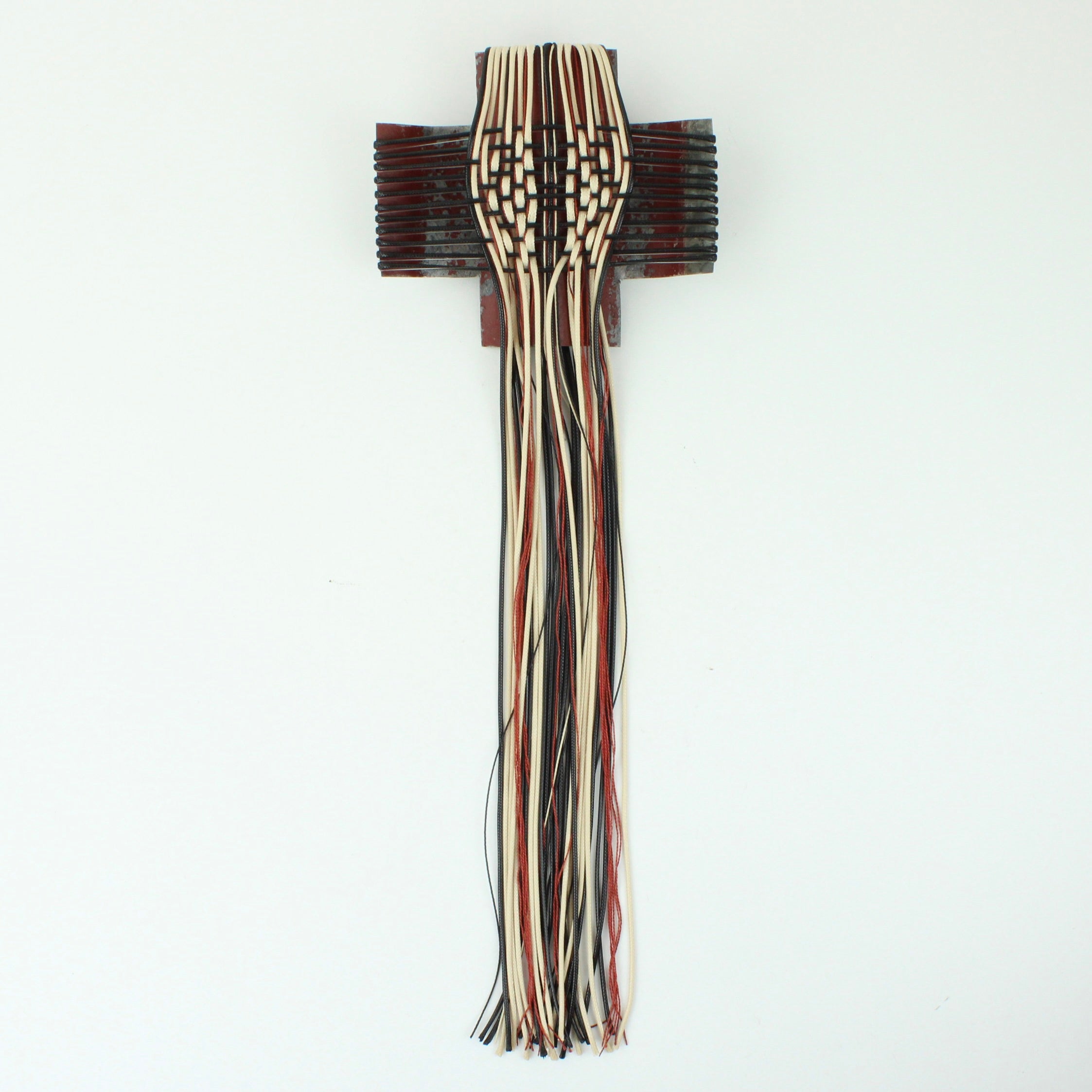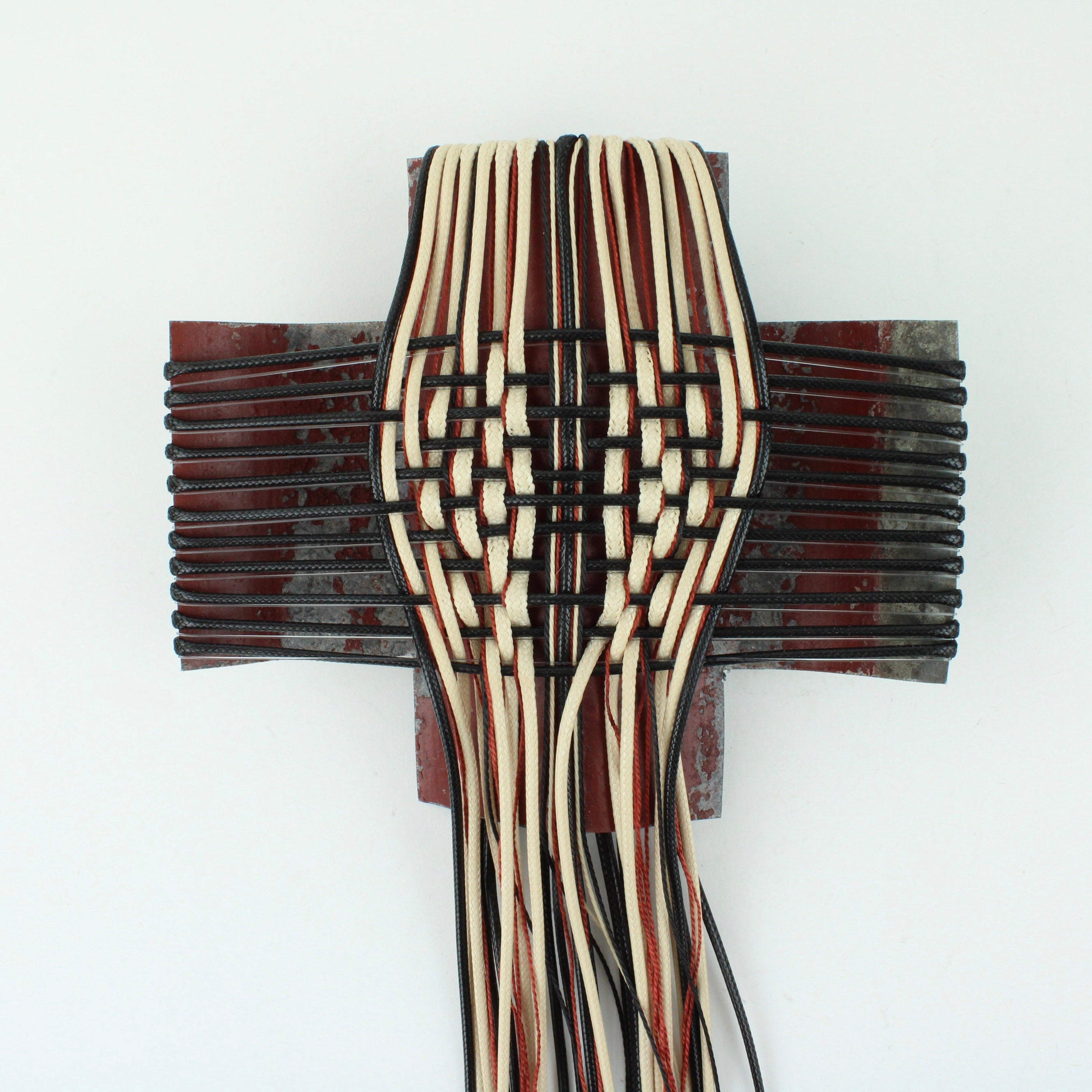 Corrugated iron with woven waxed cord, fishing line and mercerised thread