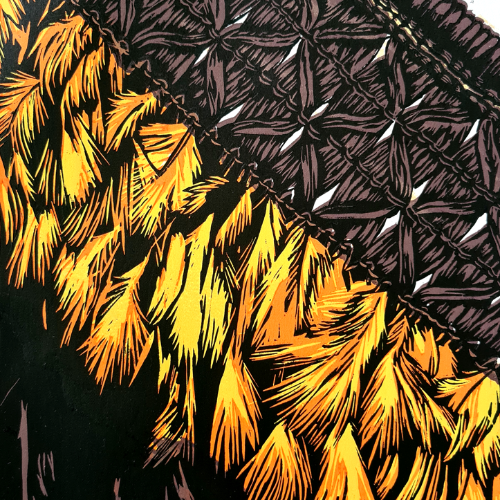 Nyle Turuwhenua’s work is strongly influenced by her connection to her Māori heritage. Developing skills as a weaver has been an important catalyst in her personal and artistic development, exploring ideas about identity and cultural heritage. Her printmaking encapsulates ideas surrounding kaitiakitanga, guardianship and connection. In Nyle’s work, birds and weaving play a key role in the act of kaitiakitanga.