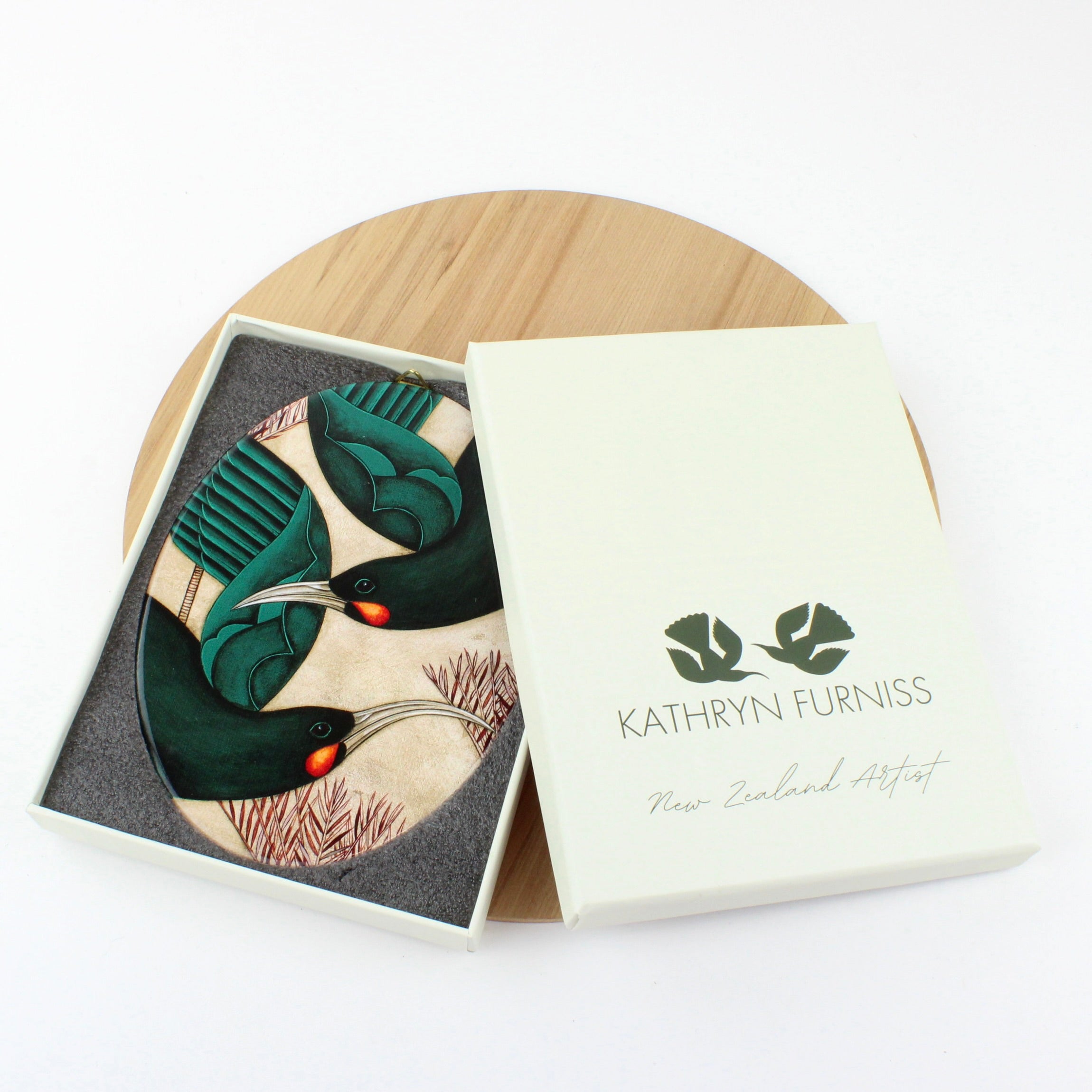 Art tile featuring the extinct male and female Huia , flying gracefully across a background of Nikau.