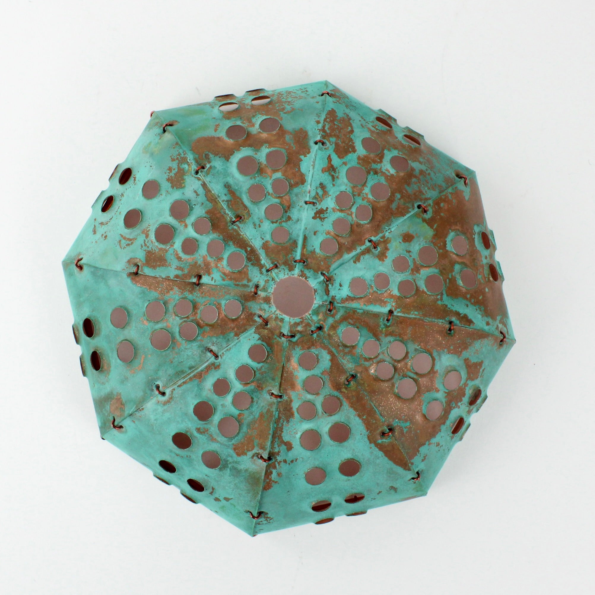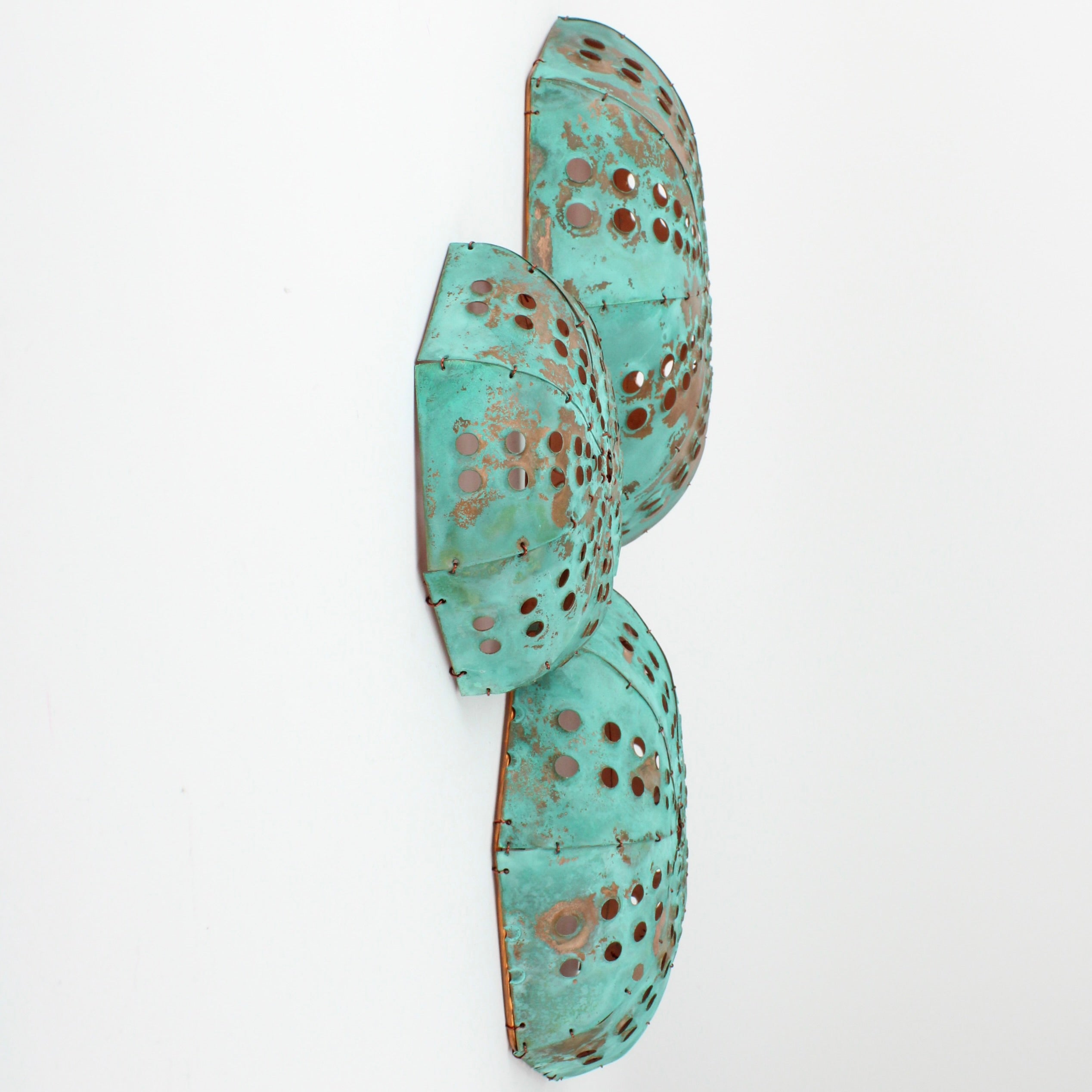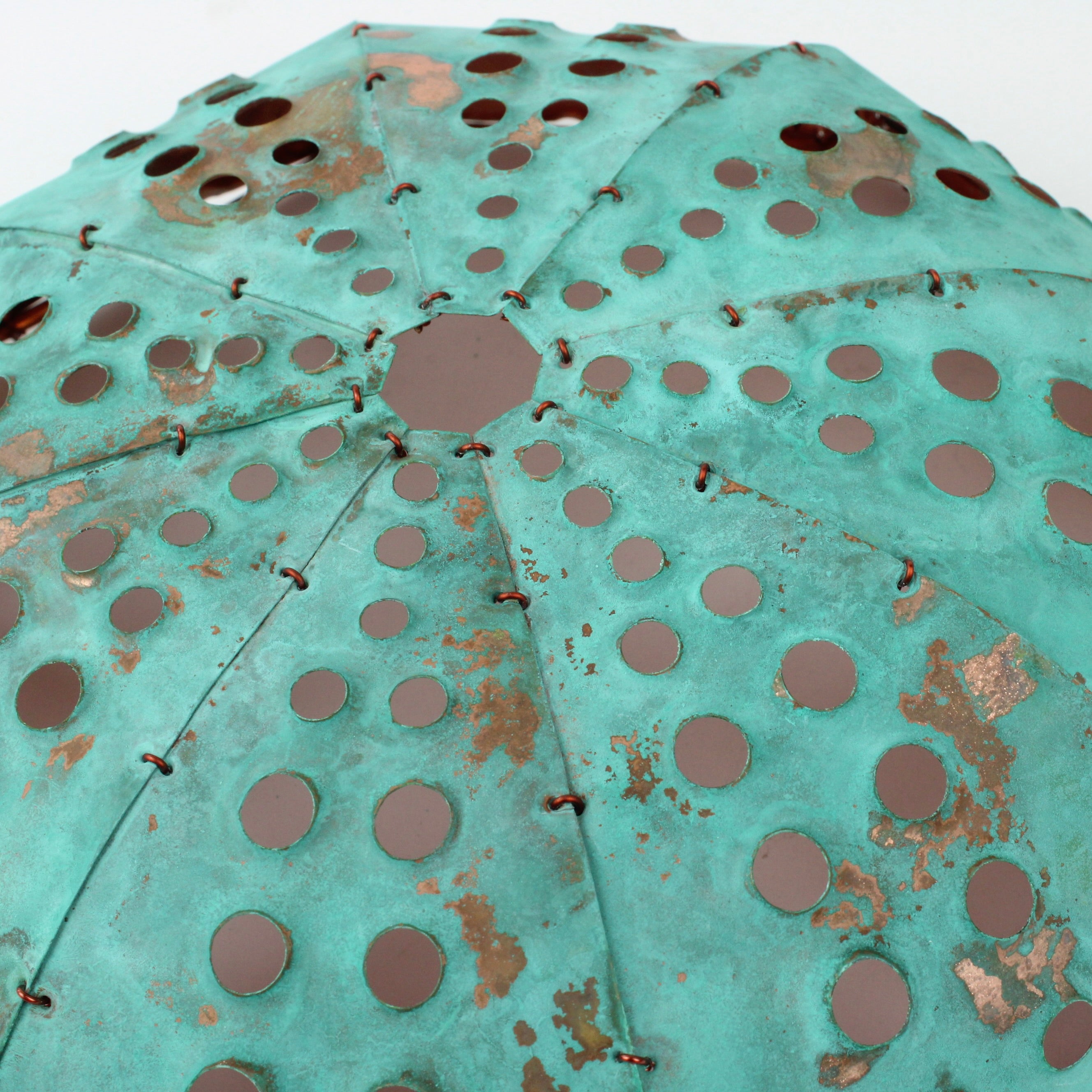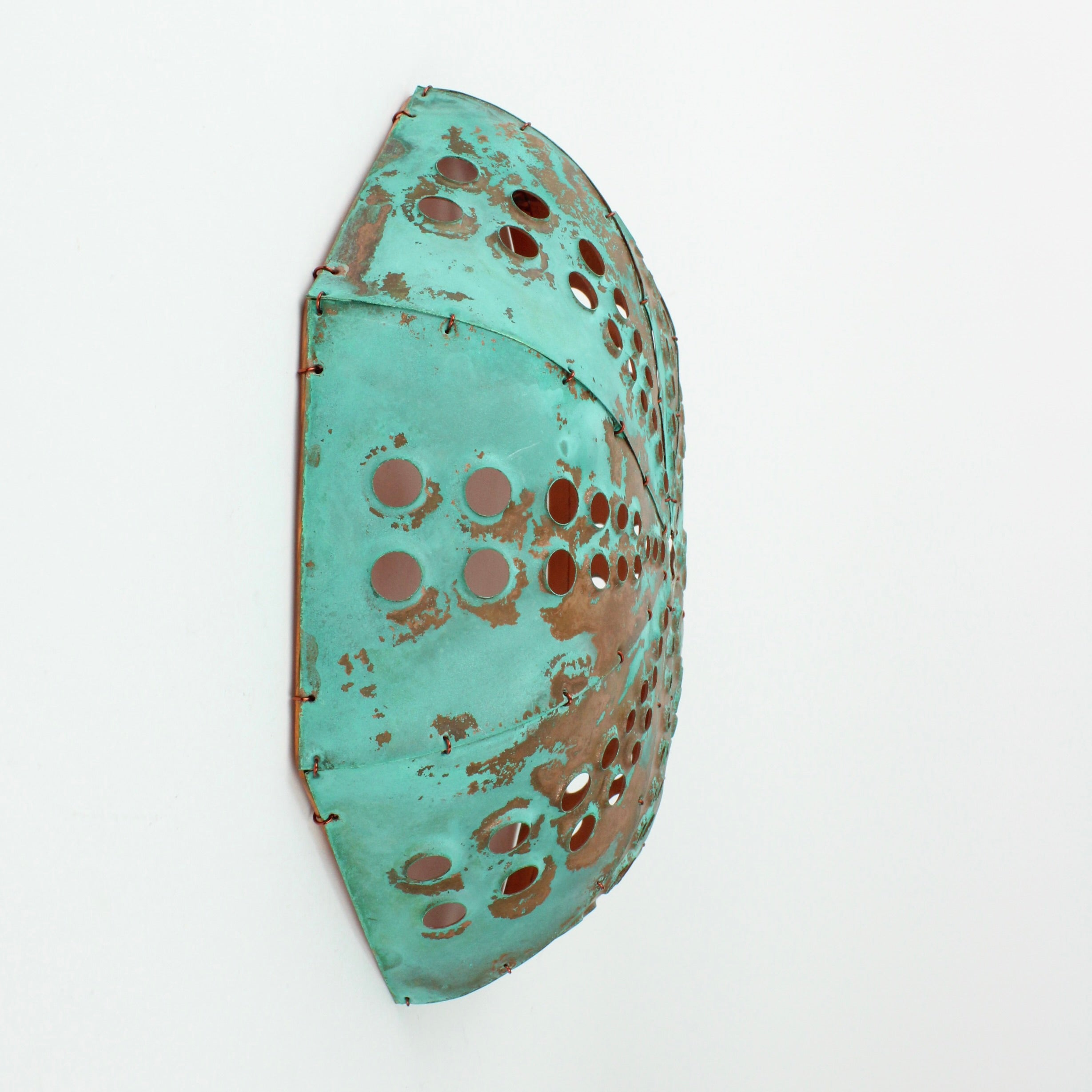 Each piece of hand sculpted copper is 'sewn' together using copper wire and coated with protective matt finish