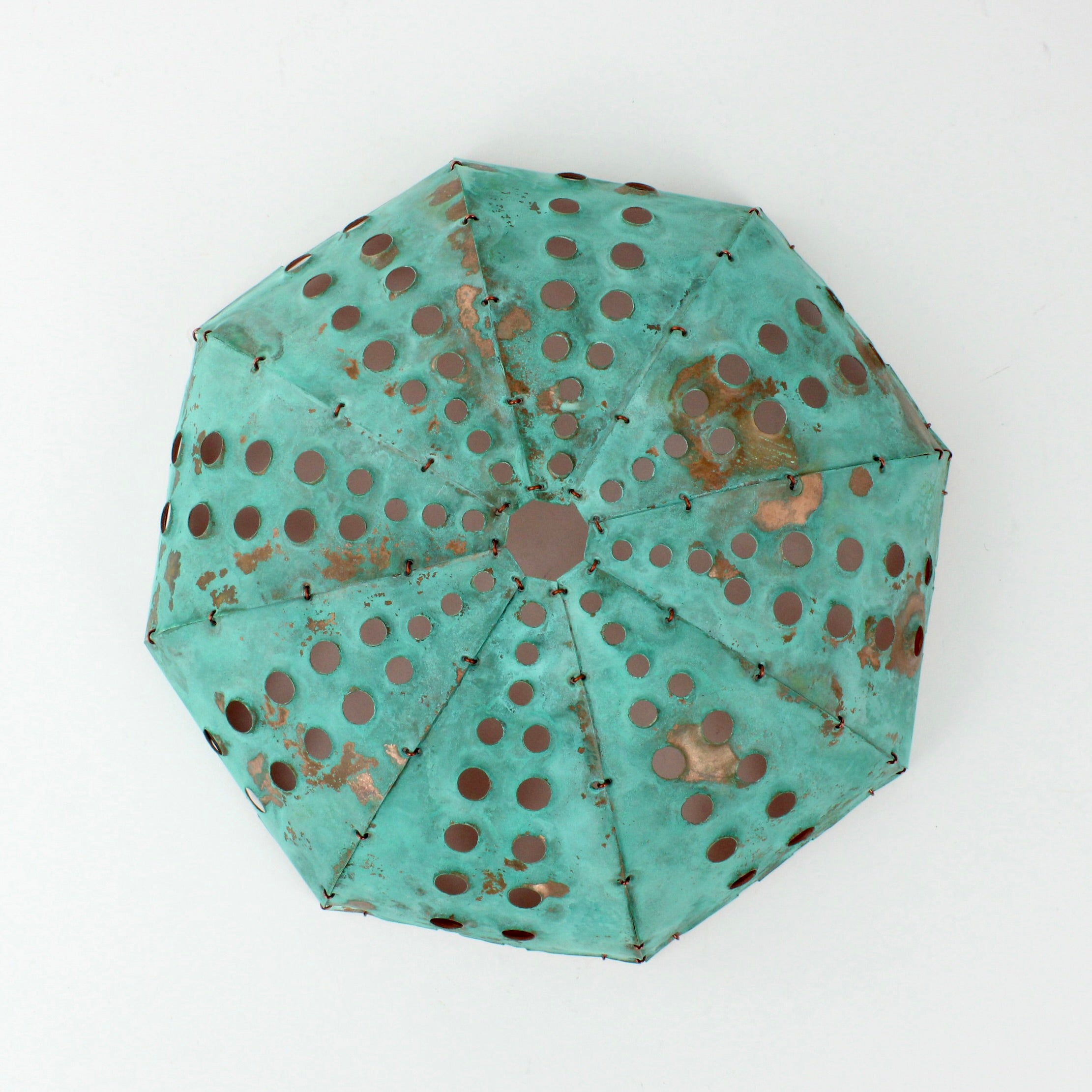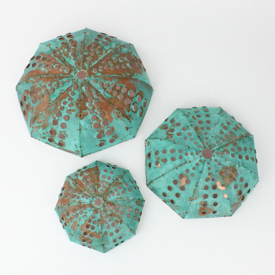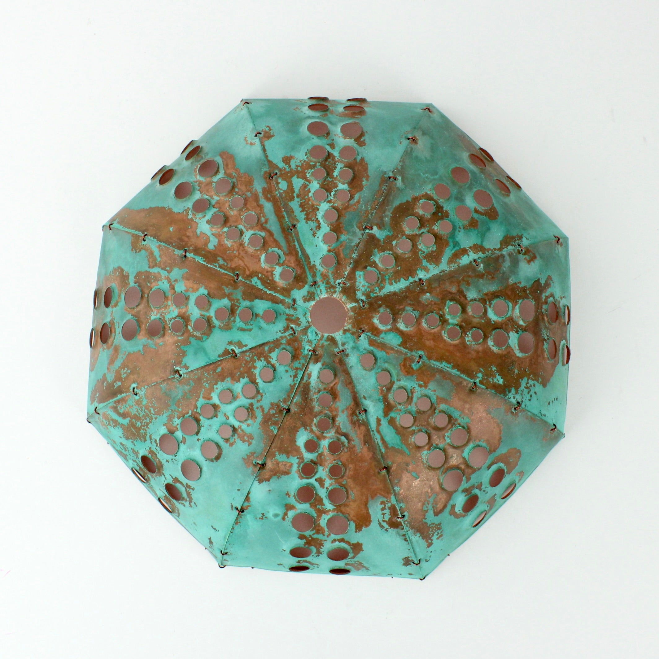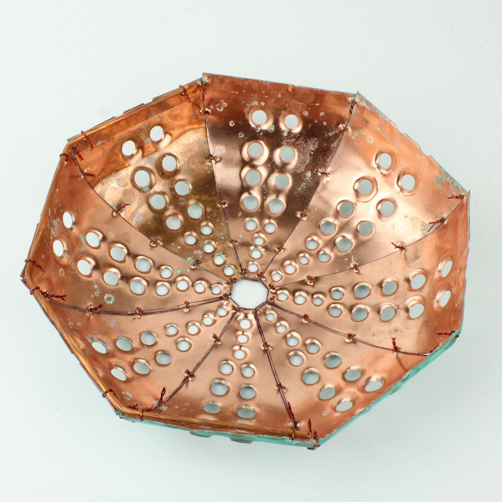 Each piece of hand sculpted copper is 'sewn' together using copper wire and coated with protective matt finish