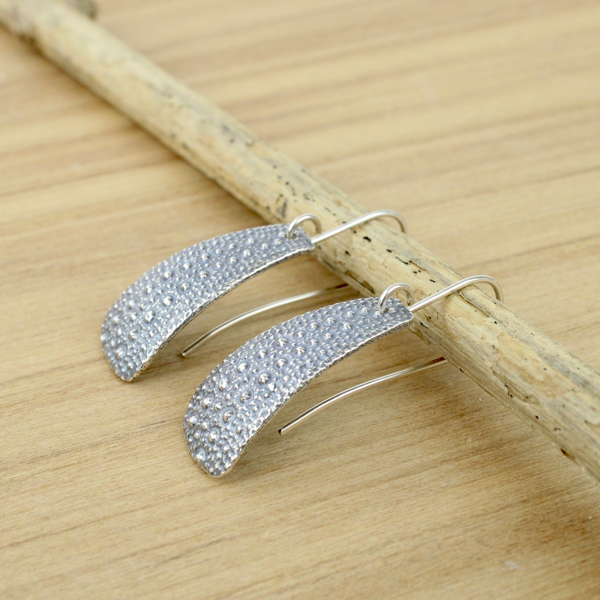 Kina Shell Curve Earrings are crafted from recycled sterling silver and cast from a fragment of a real kina shell, reflecting the beauty of New Zealand’s coastline. Subtly rounded edges echo the gentle shaping of the sea, resulting in a distinctive and elegant design that honours both craftsmanship and nature.