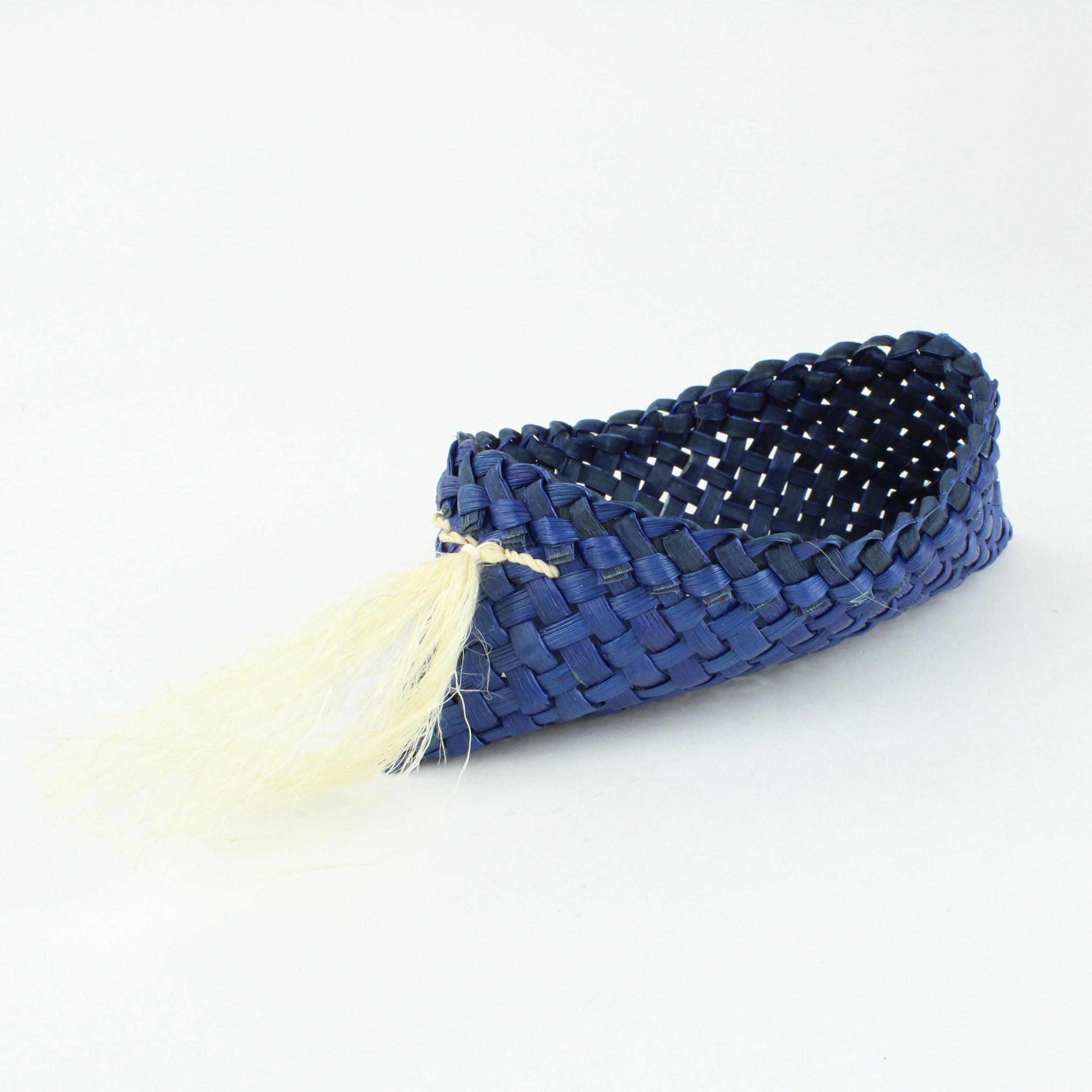 Woven harakeke using the takitahi pattern (one over, one under) with muka decoration. 36 whenu (strand)