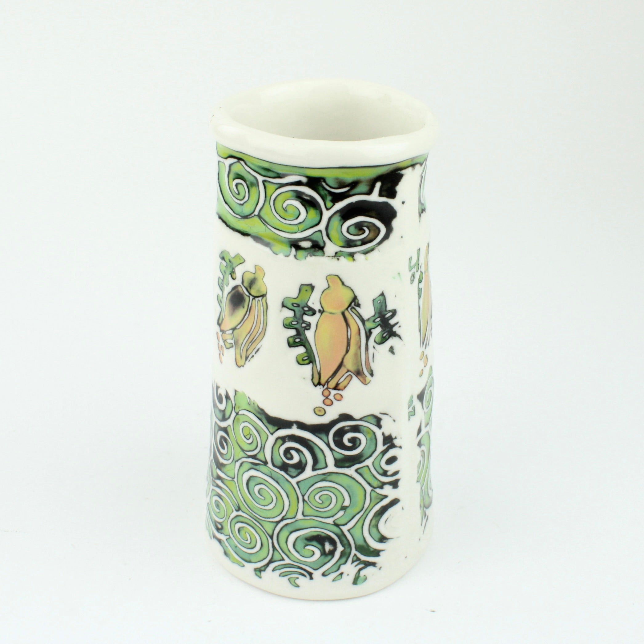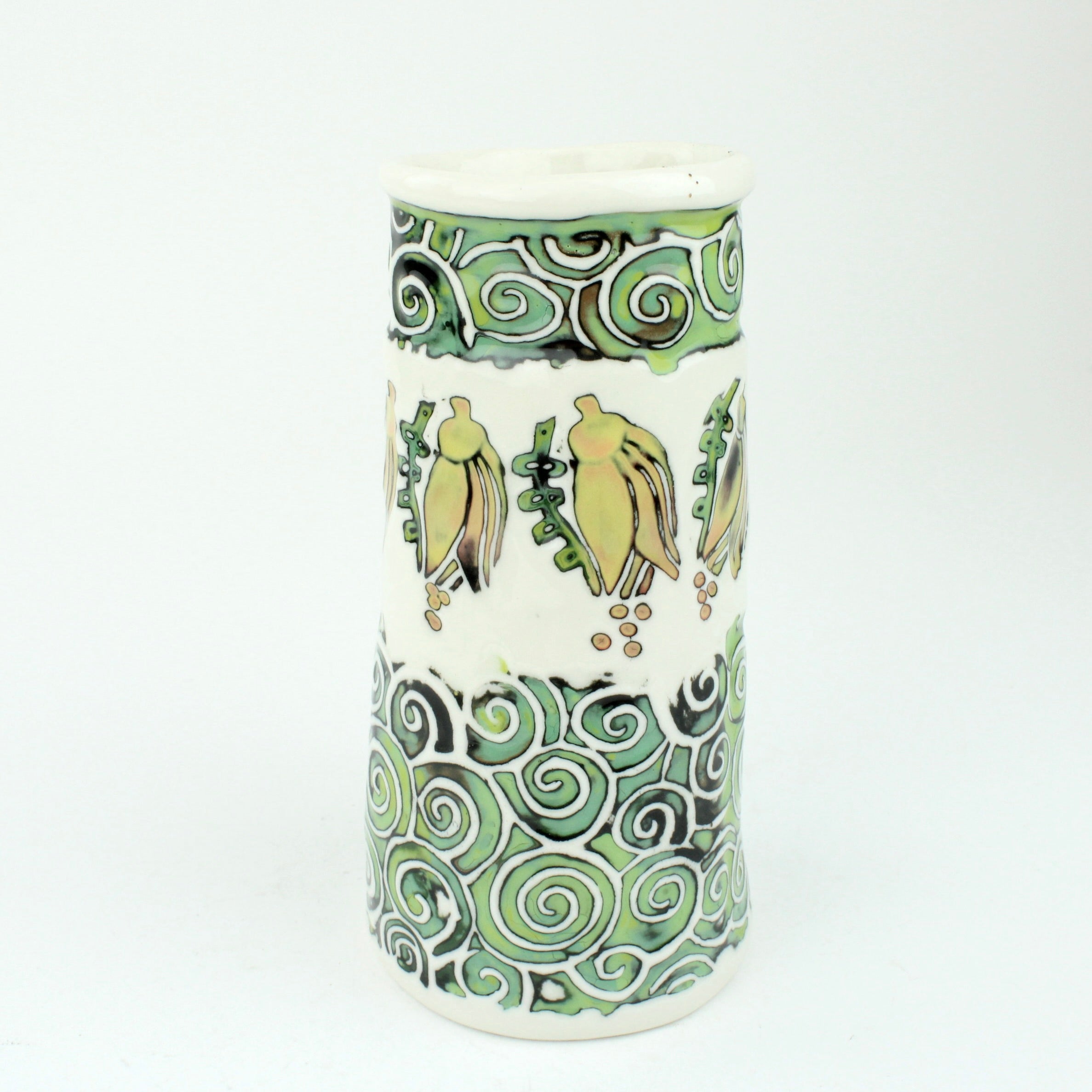 Jo Beckett is a full time clay artist graduating with a Diploma in Craft and Design majoring in Clay in 1992. She works from her home studio creating functional domestic ware, garden art and sculptural pieces. Her work celebrates the native flora and fauna of New Zealand; you will see the New Zealand Pohutukawa and Kowhai on her kete and vases along with the native Tuī, Piwakawaka and Kereru birds on her wall pods and tiles. Her surface decoration often combines bright colours and designs are inspiration taken from her garden studio window.