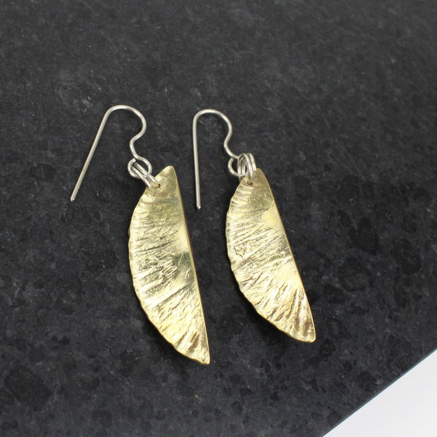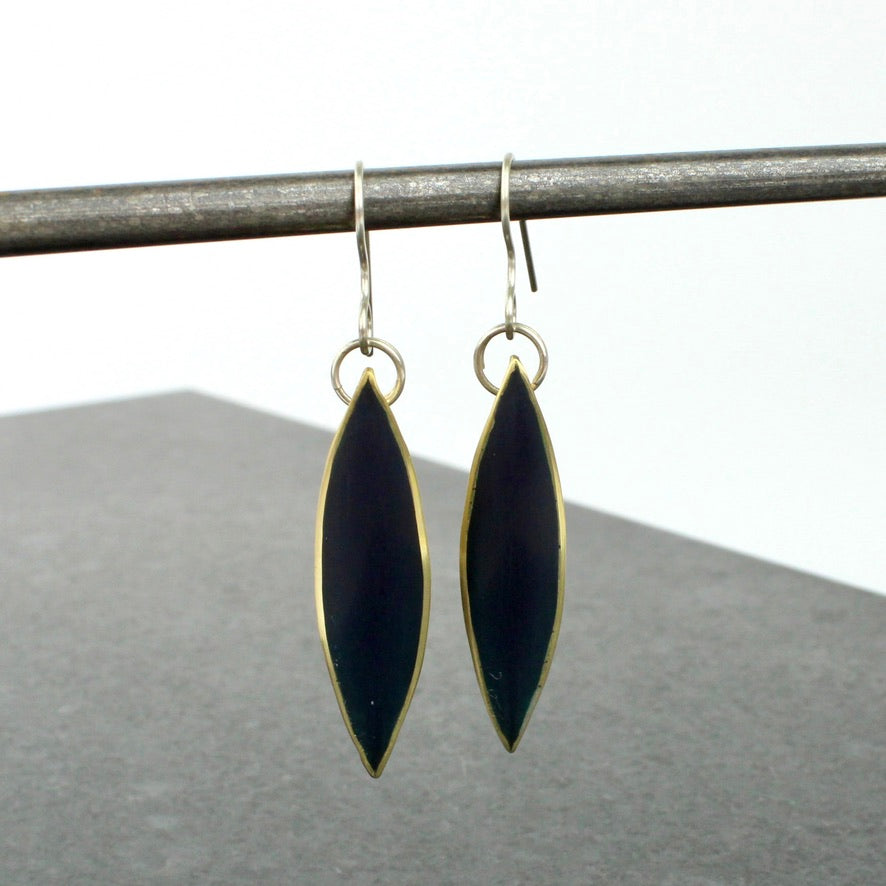 Hand beaten brass filed with resin on sterling silver hooks