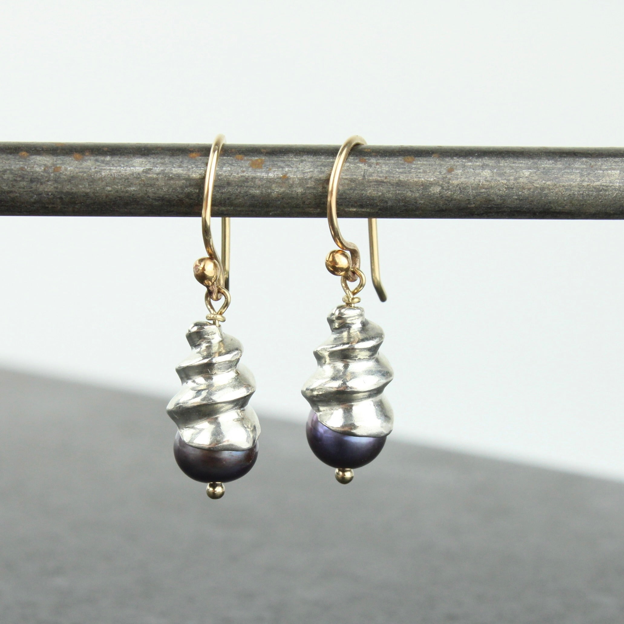 Sterling silver caps hold peacock freshwater pearls, and hang from 14k rolled gold ear hooks.