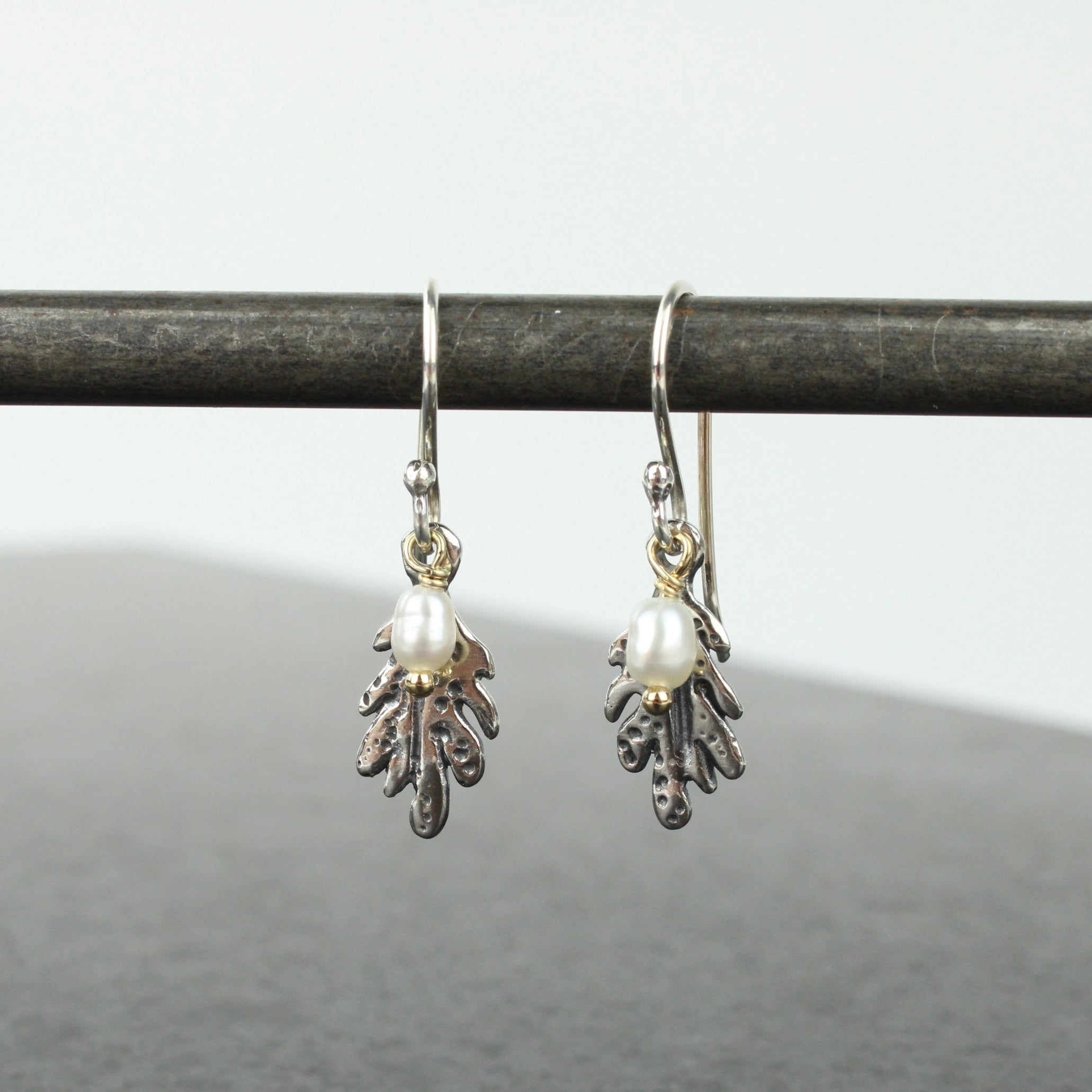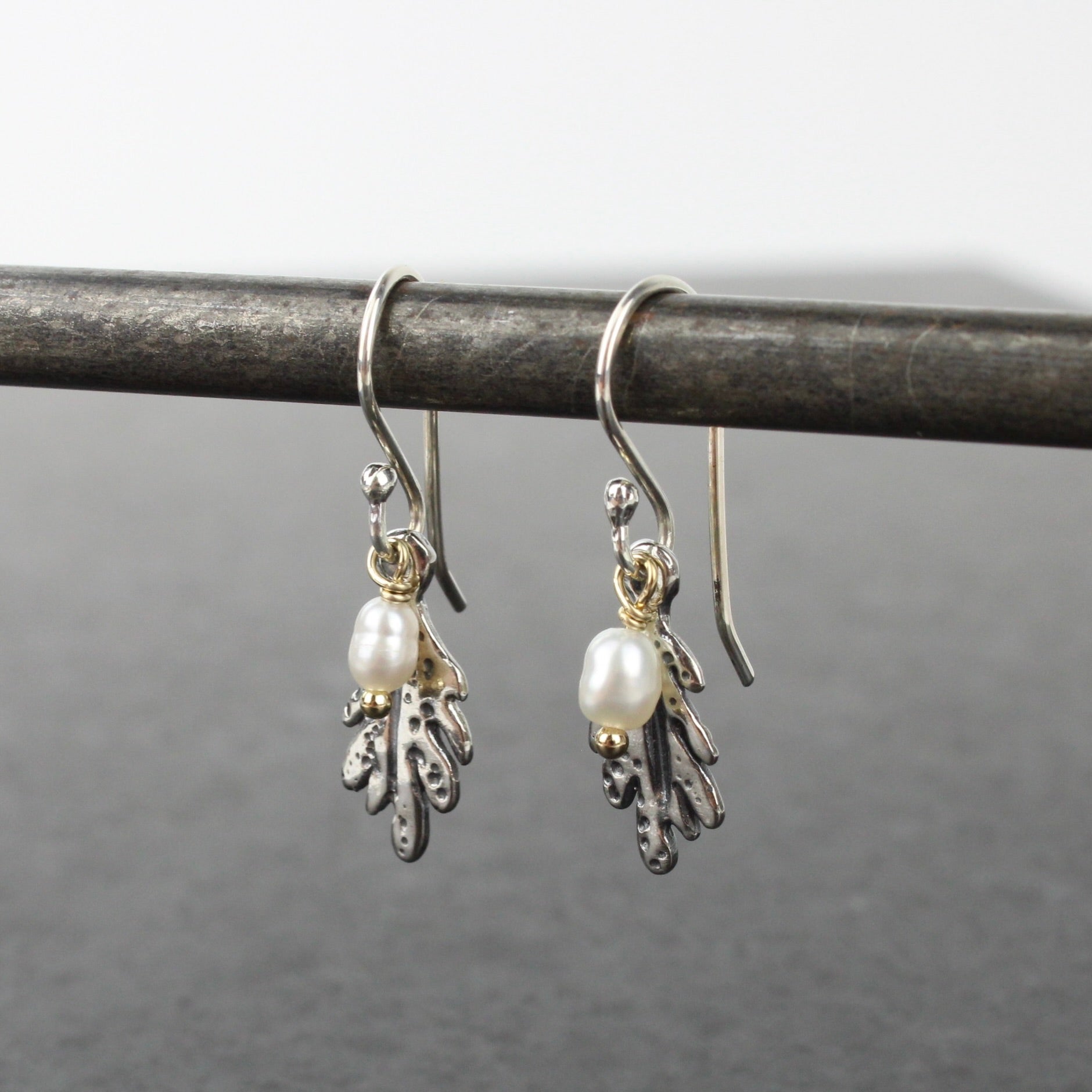 Pretty leaves and white freshwater pearls drop from sterling silver hooks.