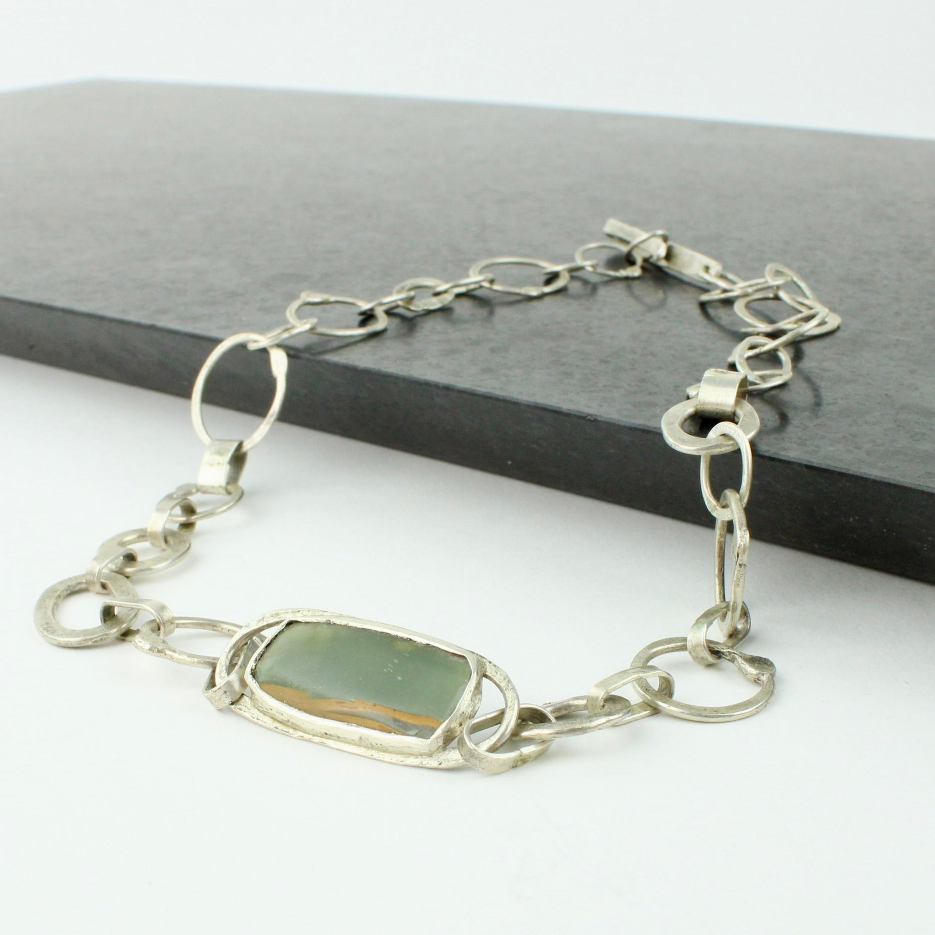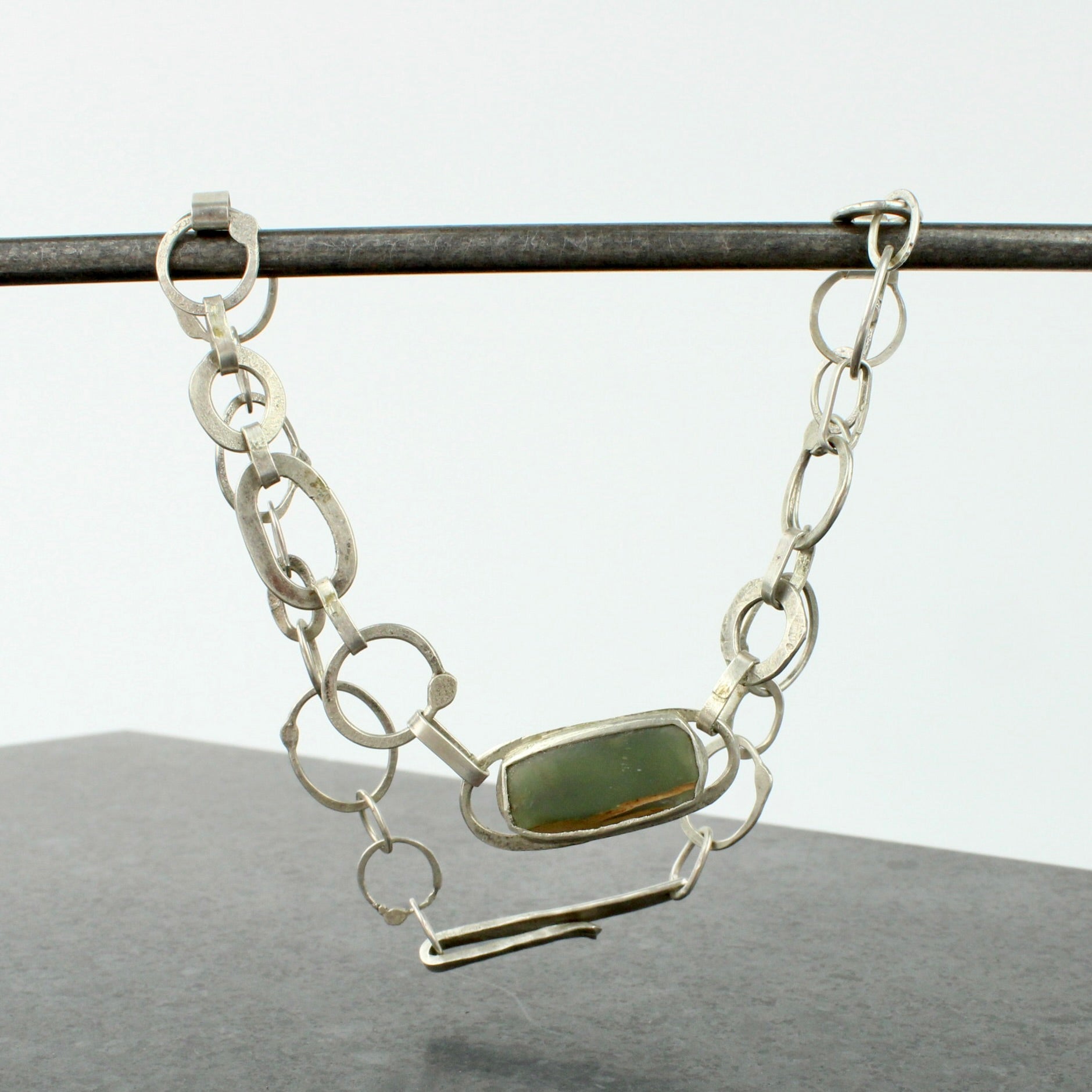 Home/All Artworks/Wide links necklace with greentsone