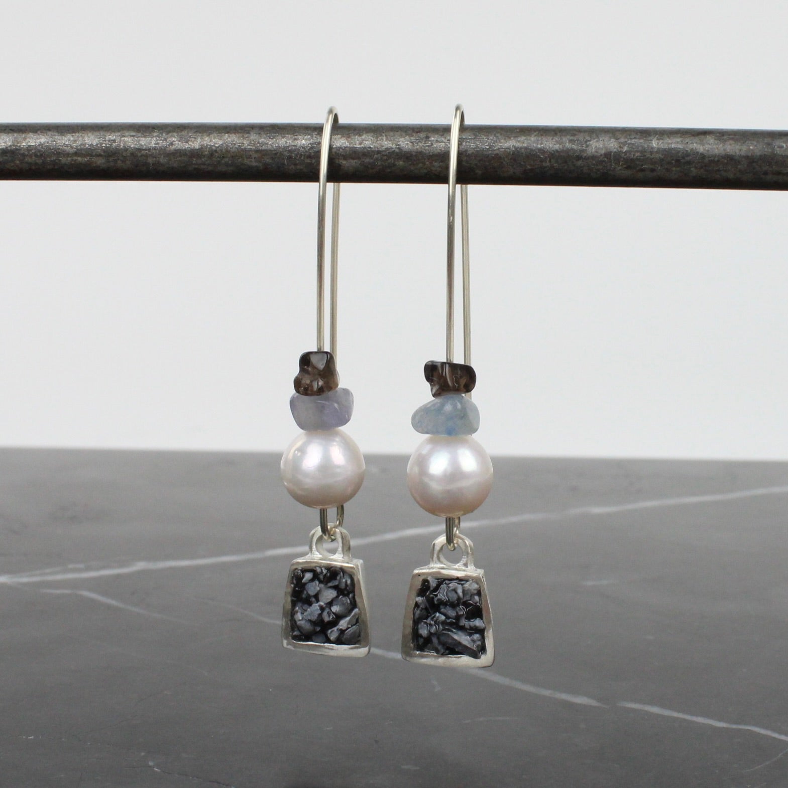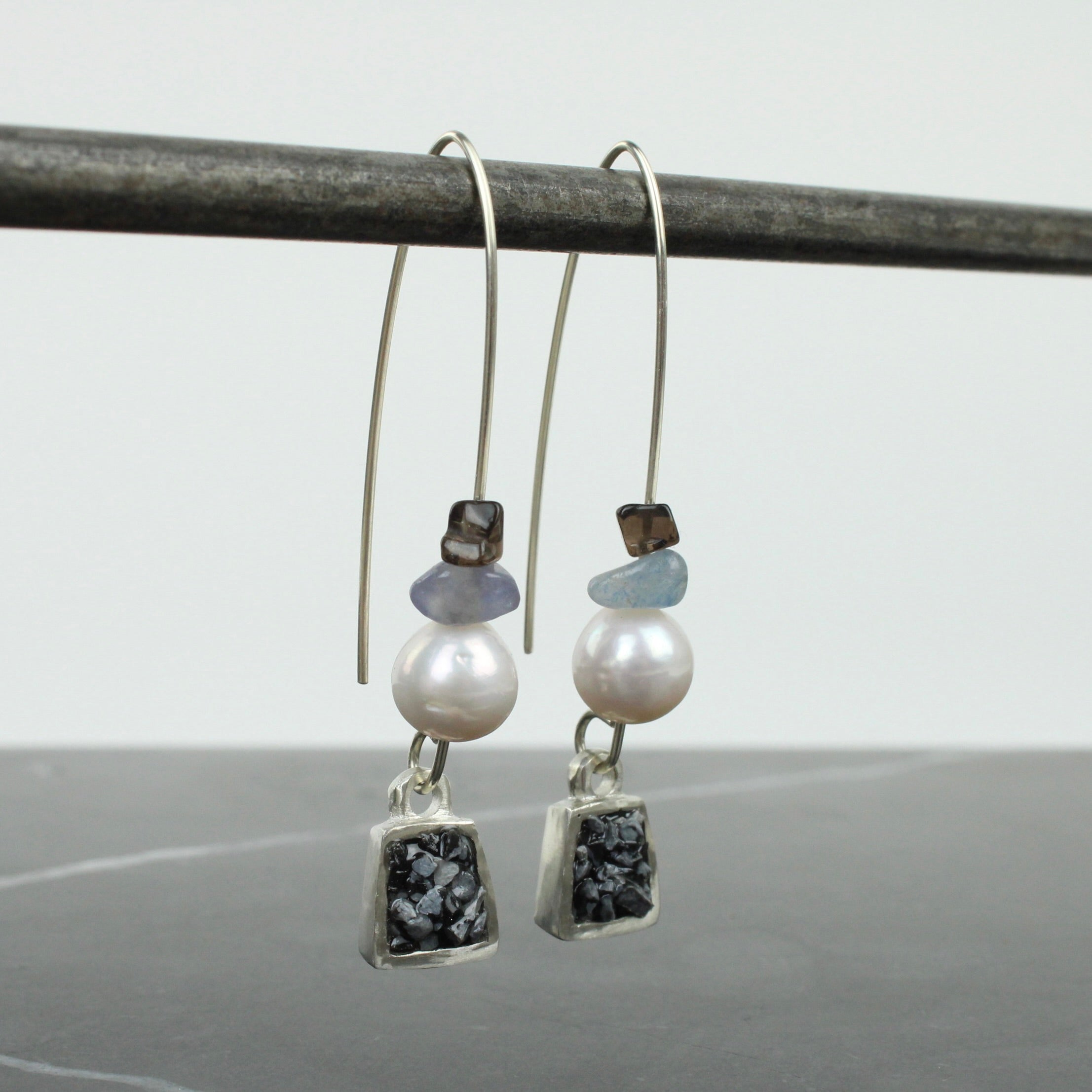 Sterling silver, crushed snowflake obsidian (black) with freshwater pearls and smokey quartz and blue adventurine beads