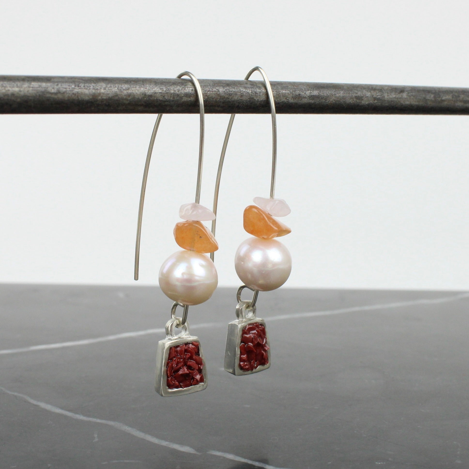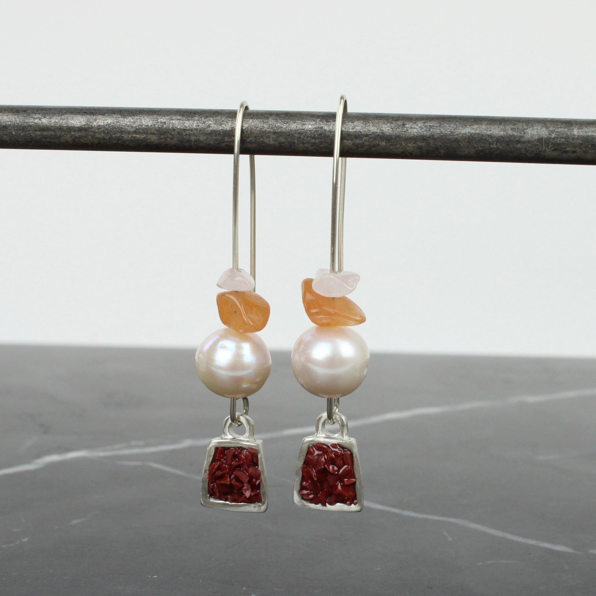 Sterling silver, crushed red jasper with freshwater pearls and pink quartz and red adventurine beads