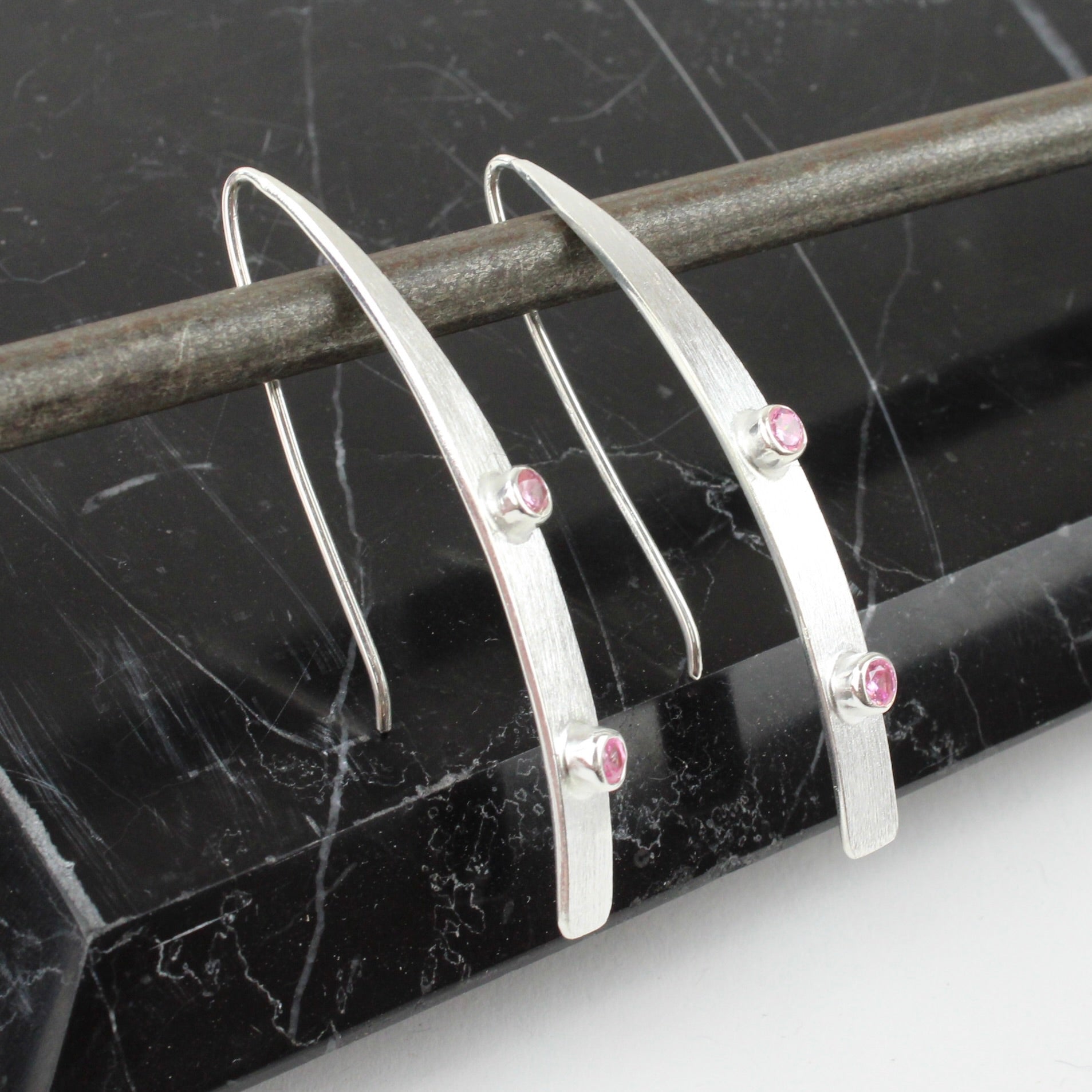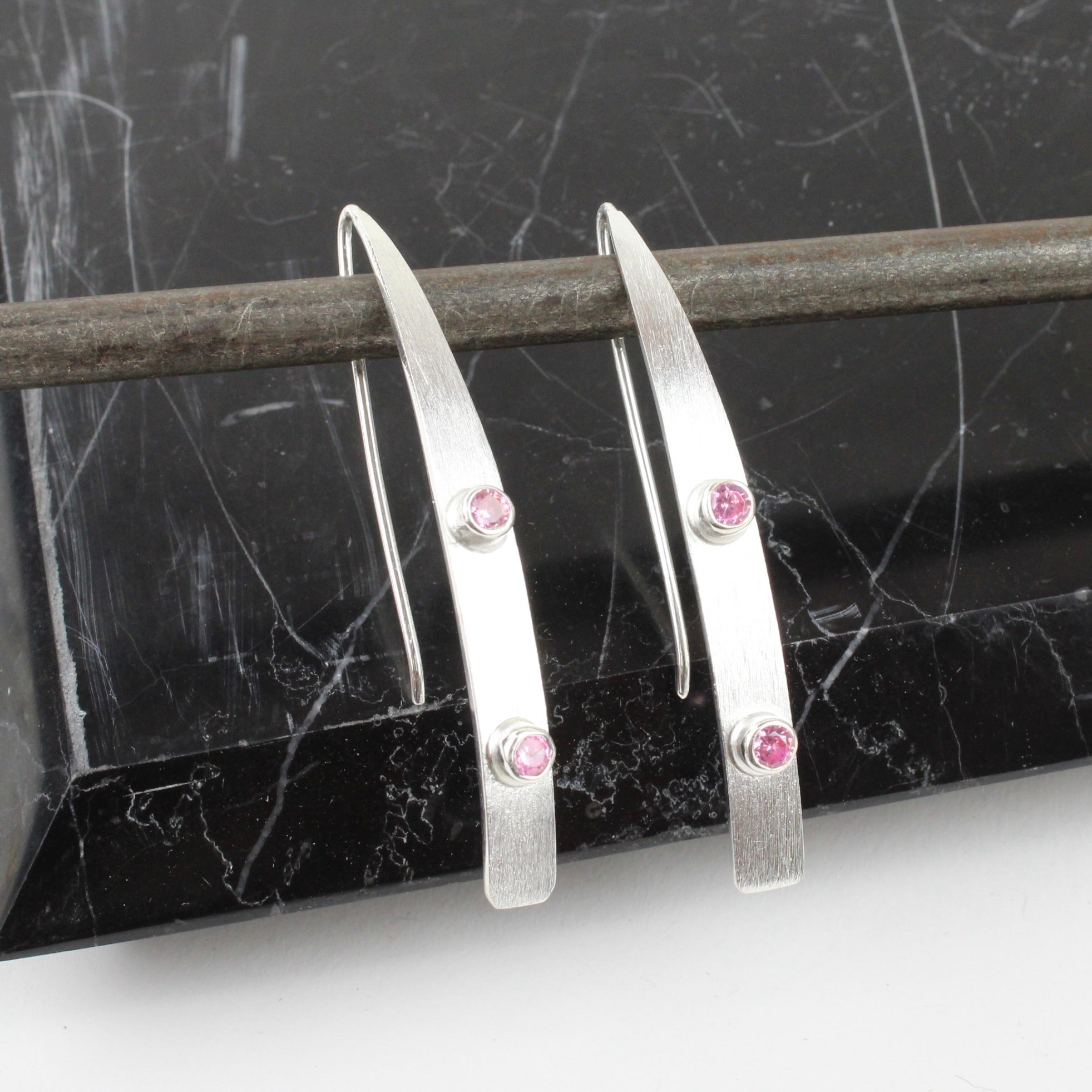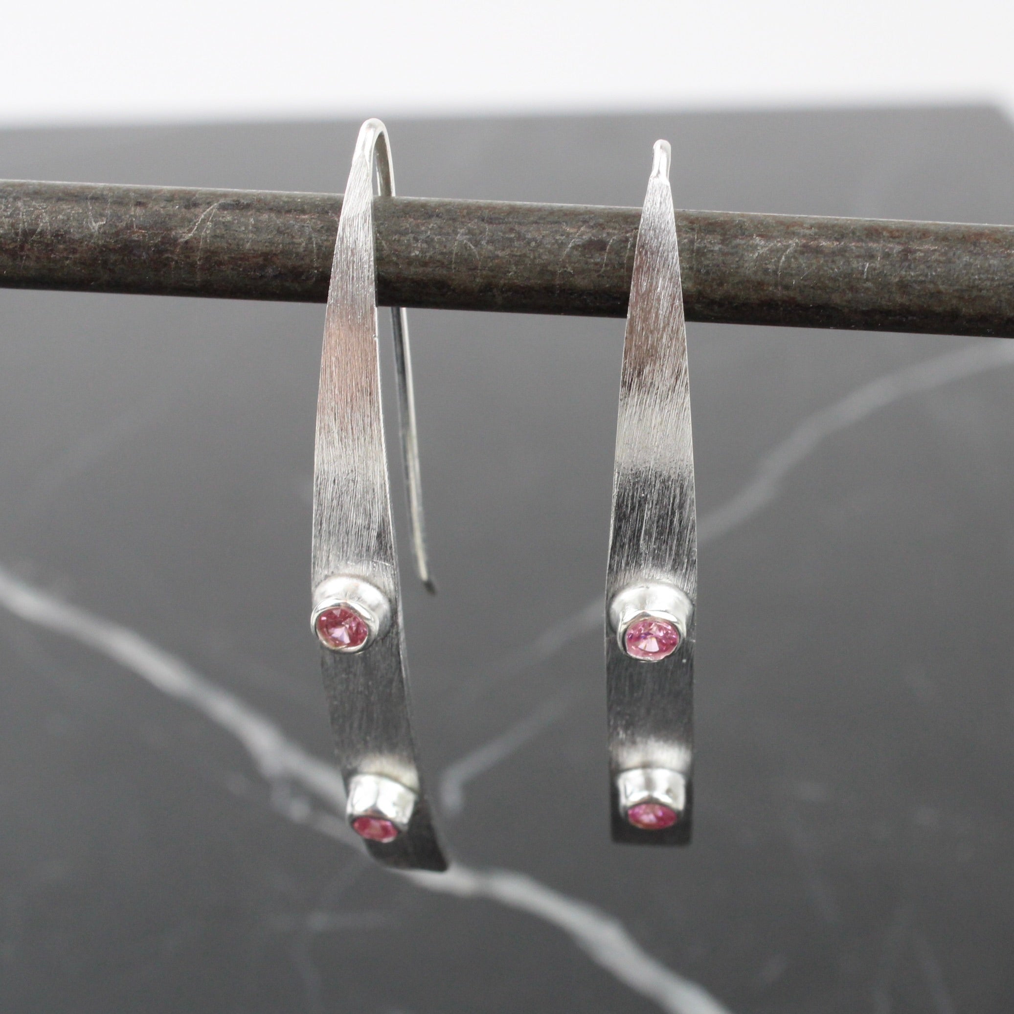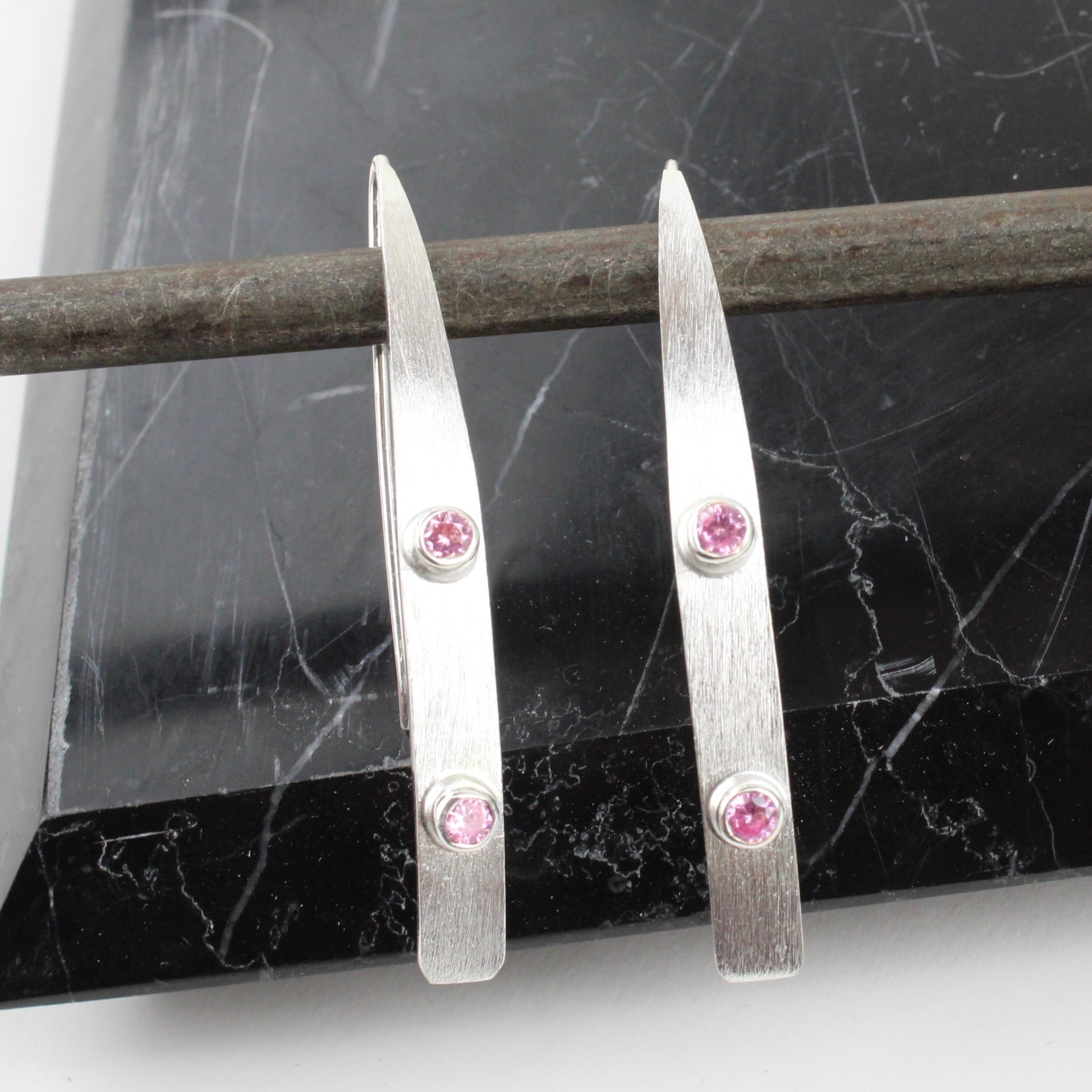Sterling silver long earrings set with two rose quartz in each earring