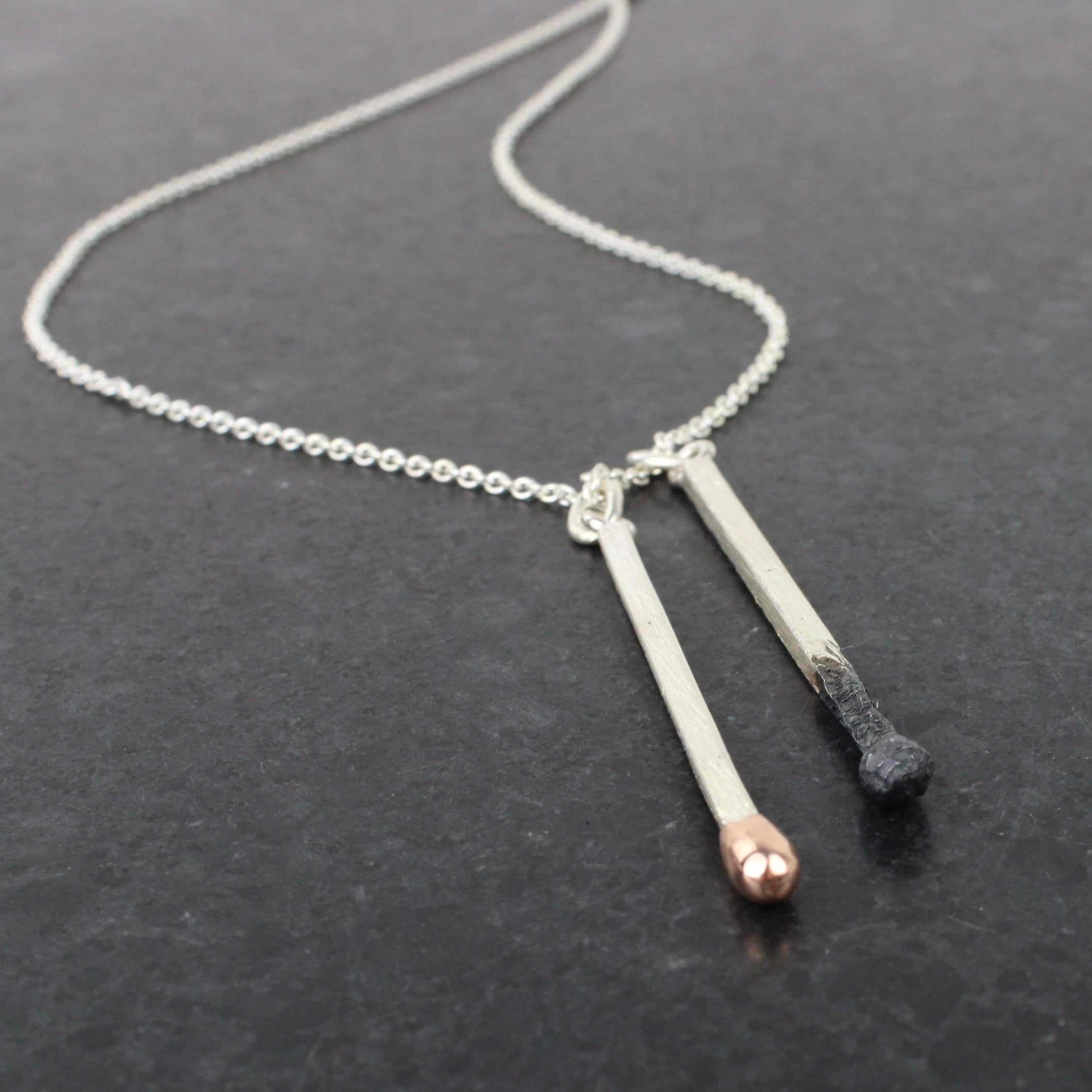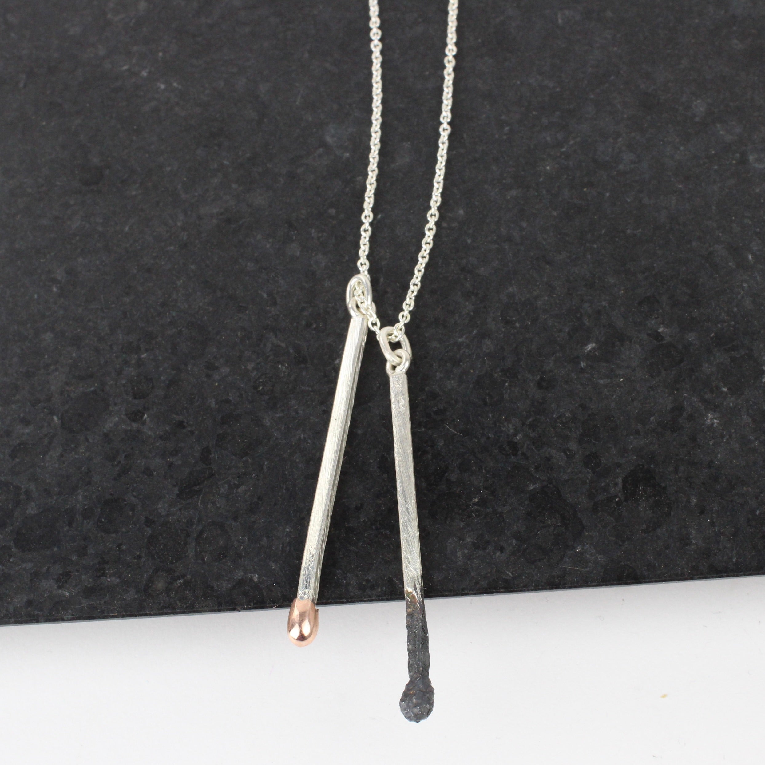 Two seperate 55mm sterling silver matches, one with oxidised end and the other with a 9ct gold end on a 750mm silver chain