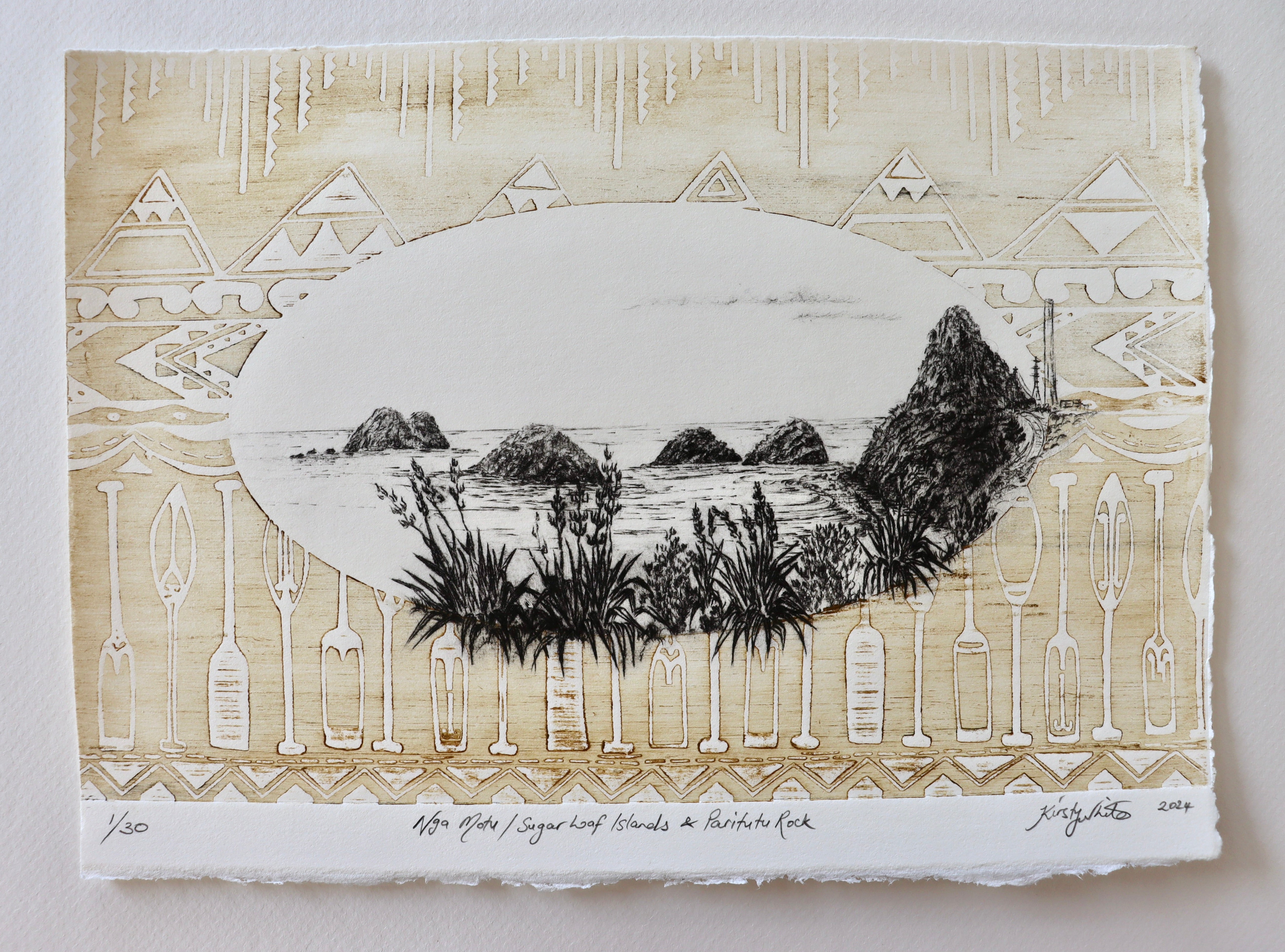 Inspired by Maori whakairo, Fijian masi cloth and Samoan tapa, Kirsty's landscapes are merged with patterning to reflect the history of a site. Mixed with the traditional etching style she uses for these landscapes, her artwork often sparks a nostalgic reaction to a favourite view.