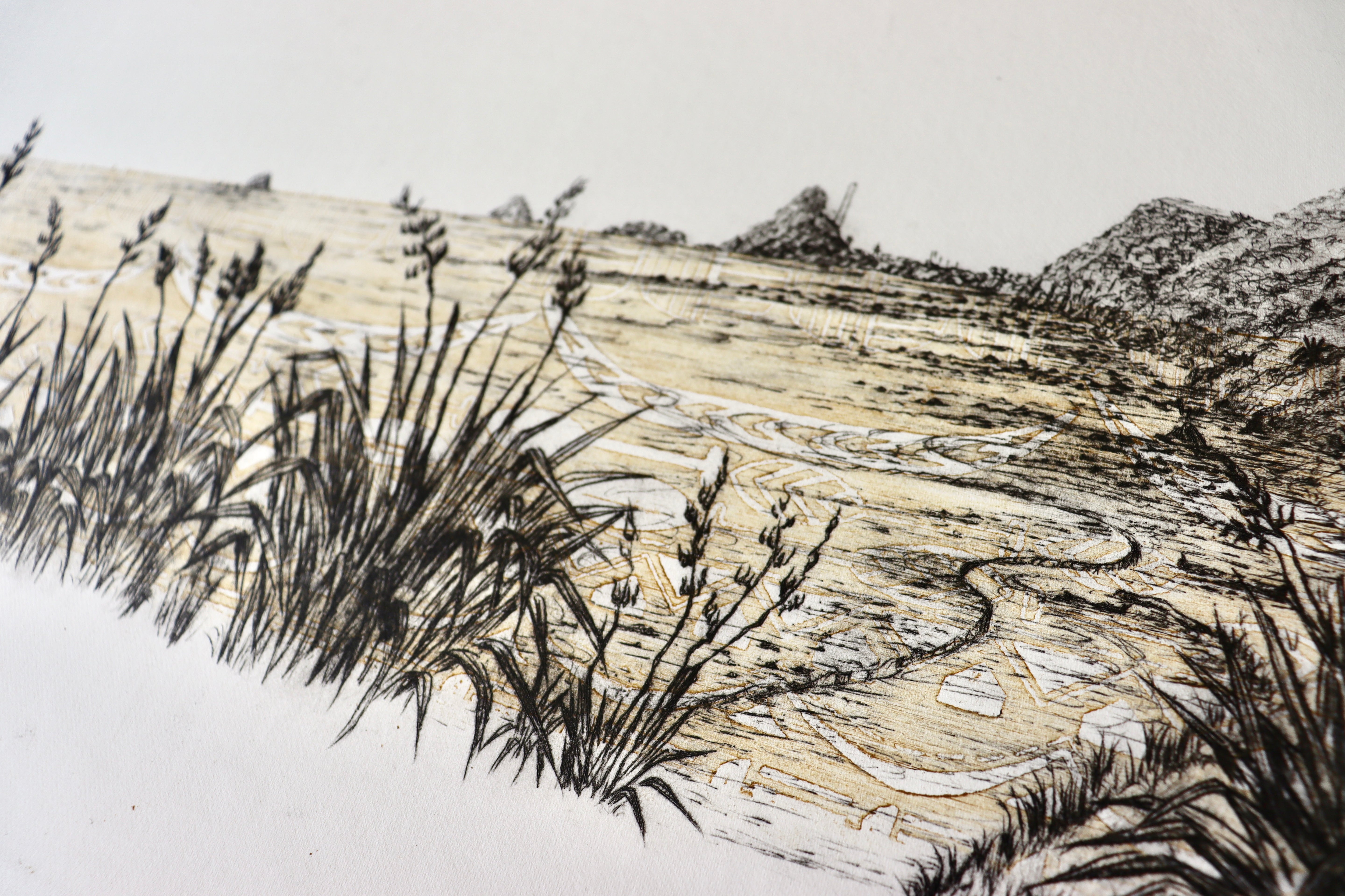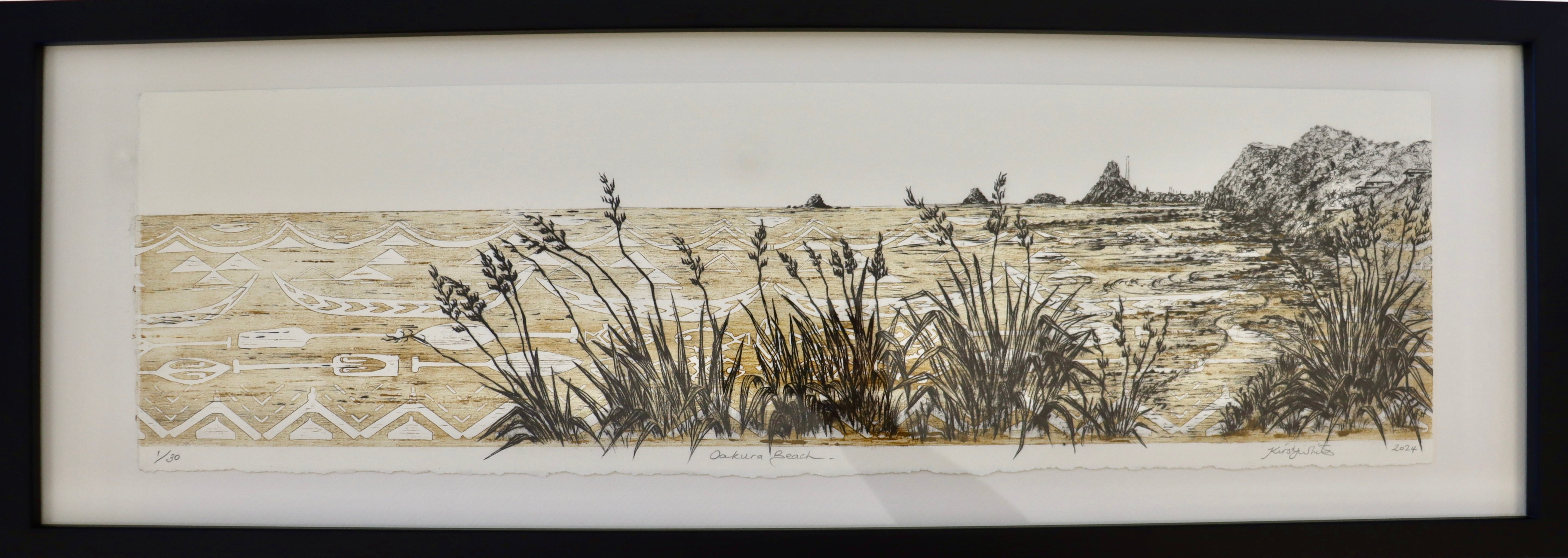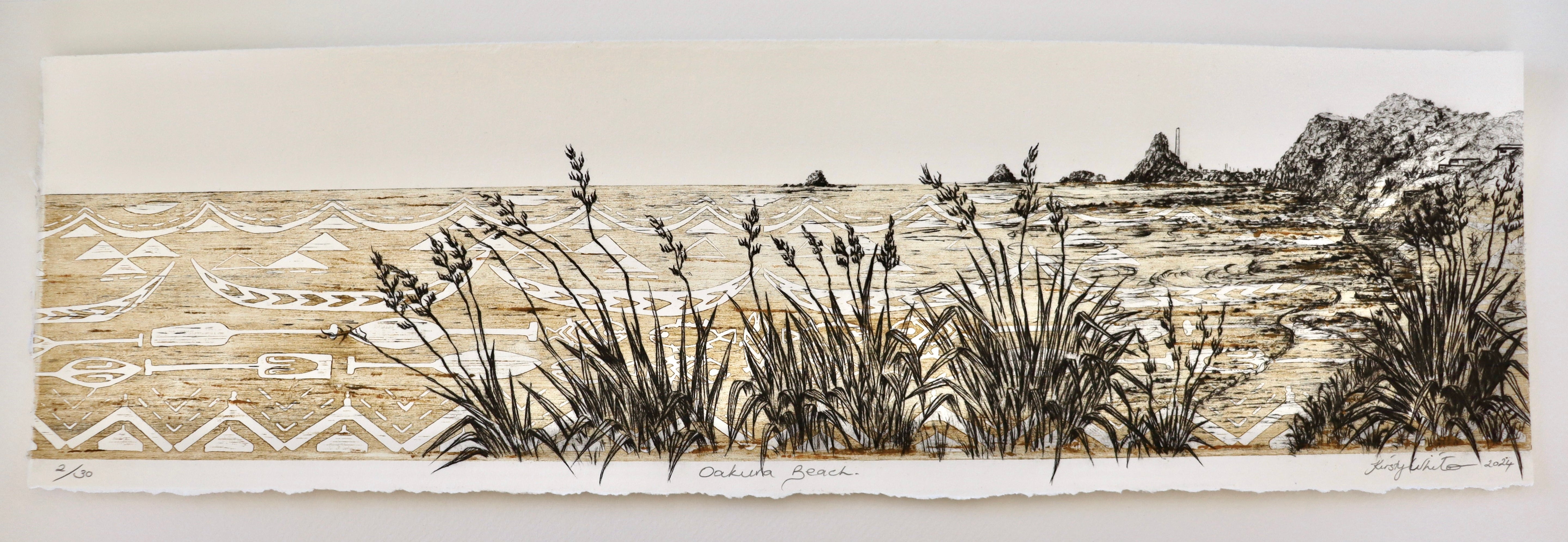Inspired by Maori whakairo, Fijian masi cloth and Samoan tapa, Kirsty's landscapes are merged with patterning to reflect the history of a site. Mixed with the traditional etching style she uses for these landscapes, her artwork often sparks a nostalgic reaction to a favourite view.