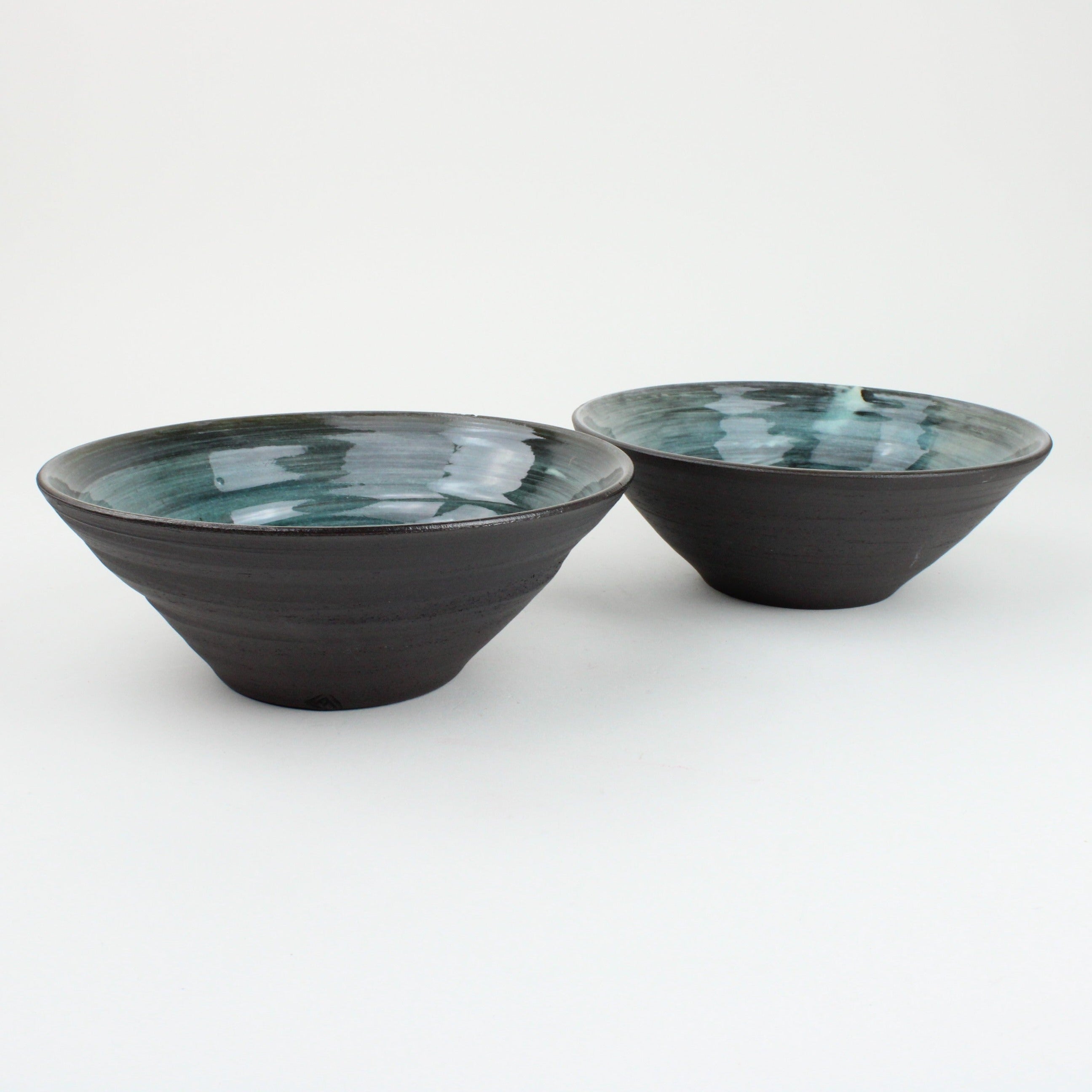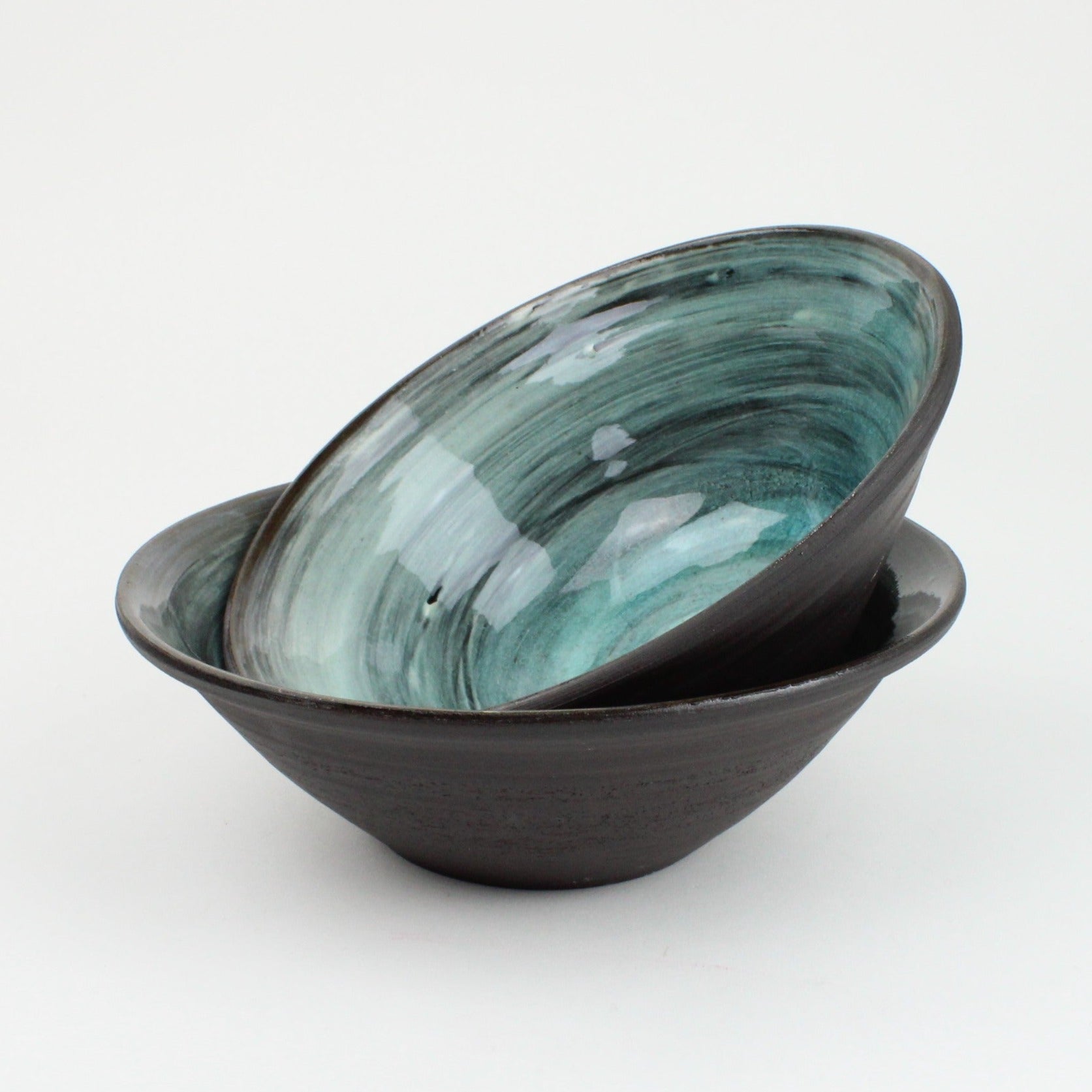 Throwing pots with black stoneware has been a way for Aímee to enjoy the contrast of the black slightly gritty clay with the smooth coloured glaze surface.