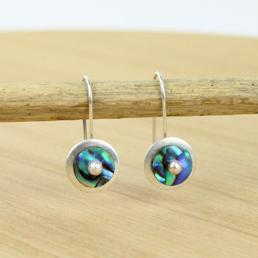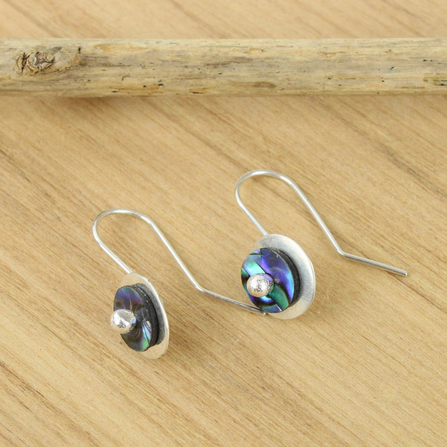Lightweight, simple earrings made from discs of laminated New Zealand Pāua shell (Abalone) with recycled sterling silver disc and handmade hooks