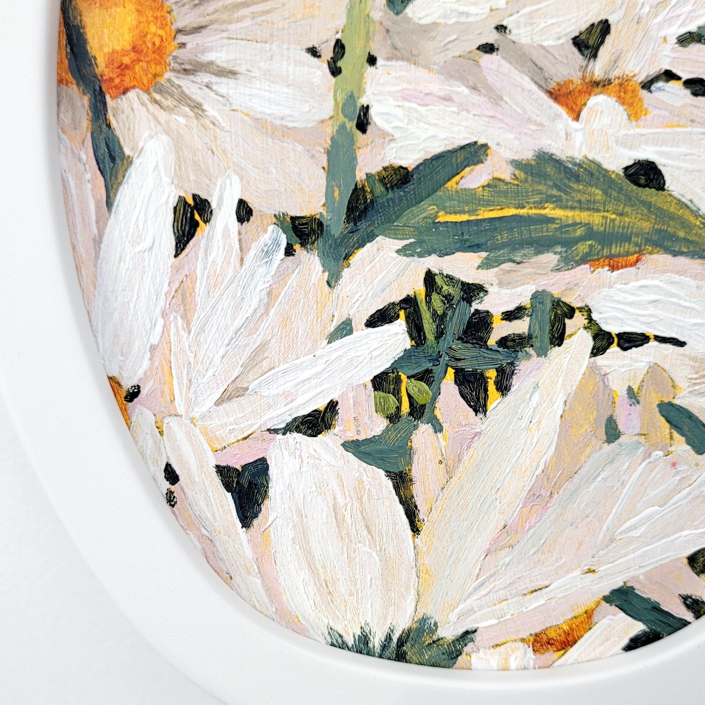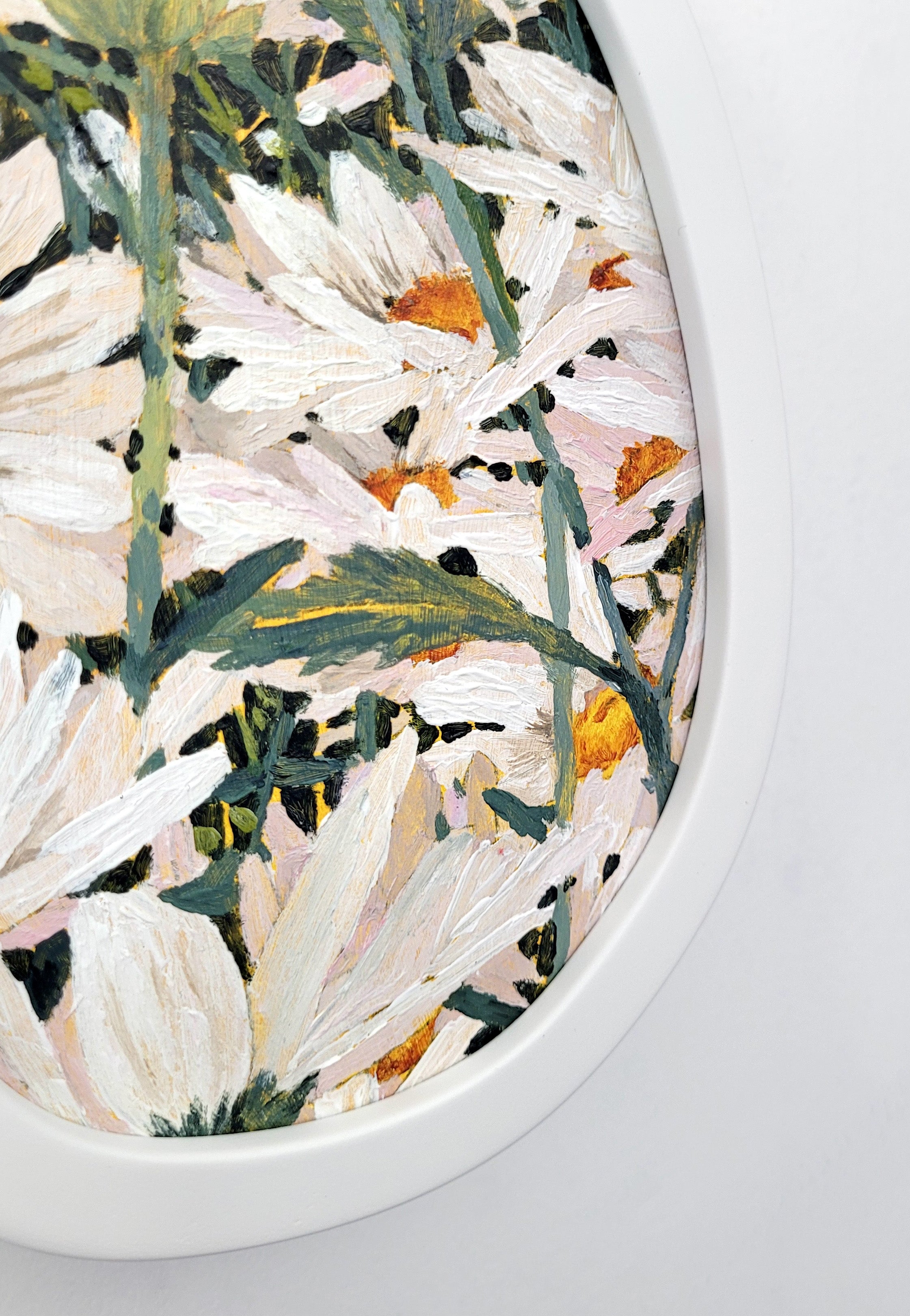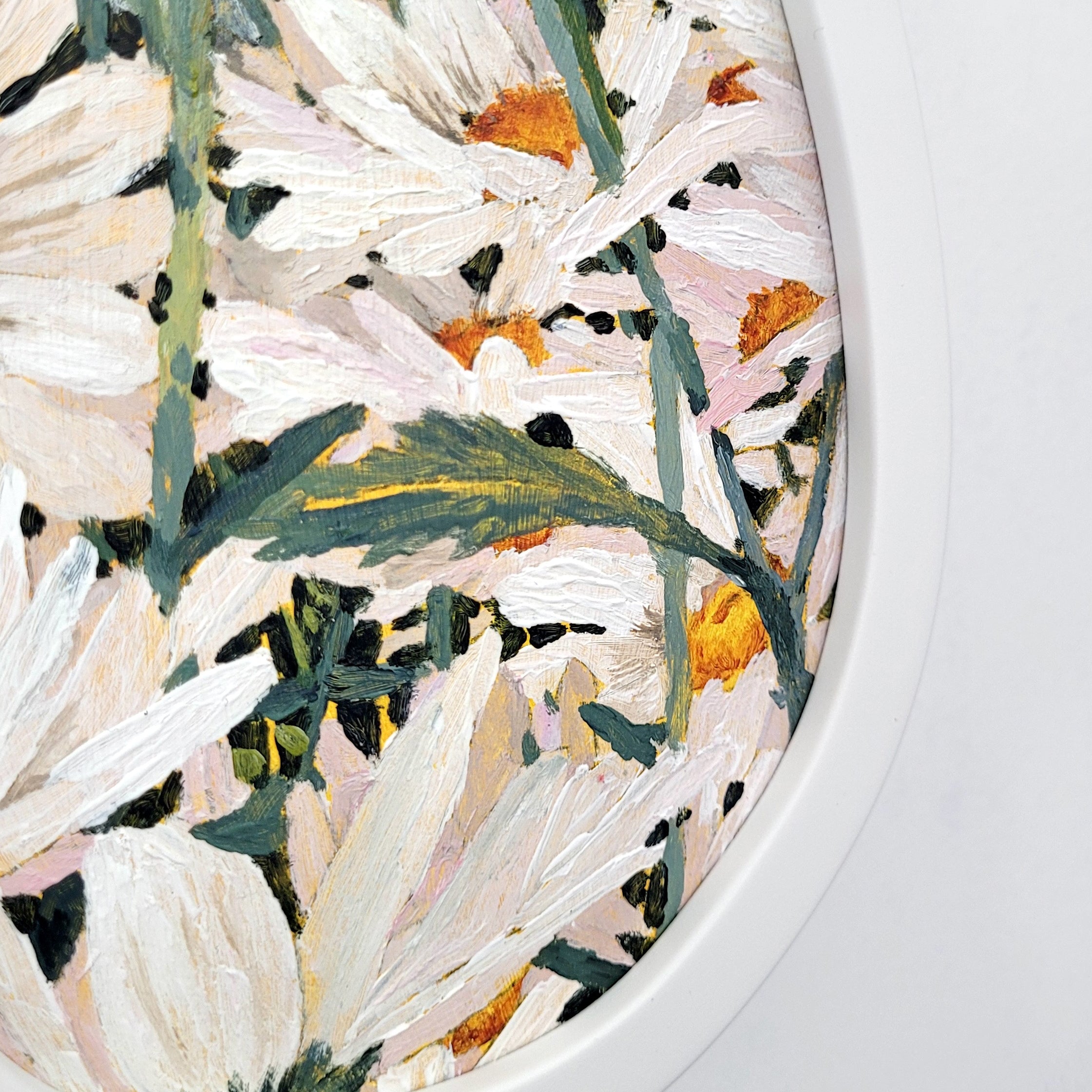 She has a particular interest in the treatment of the backgrounds of her work, with base colours often showing through, and colour blocking between stalks and blooms is always a feature of her work.