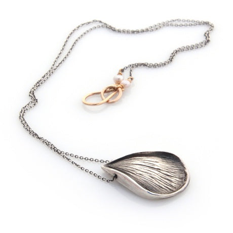 A reversible oxidised silver rose petal falls from a delicate sterling silver chain, with secret white pearl accent.