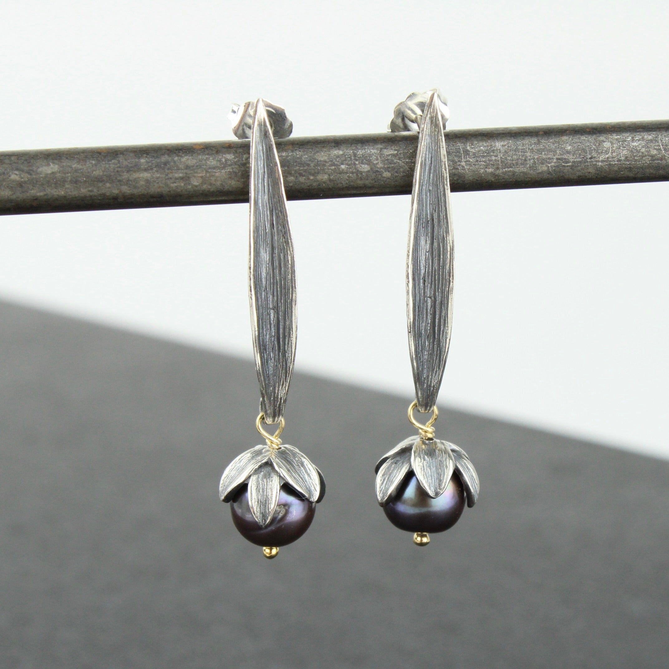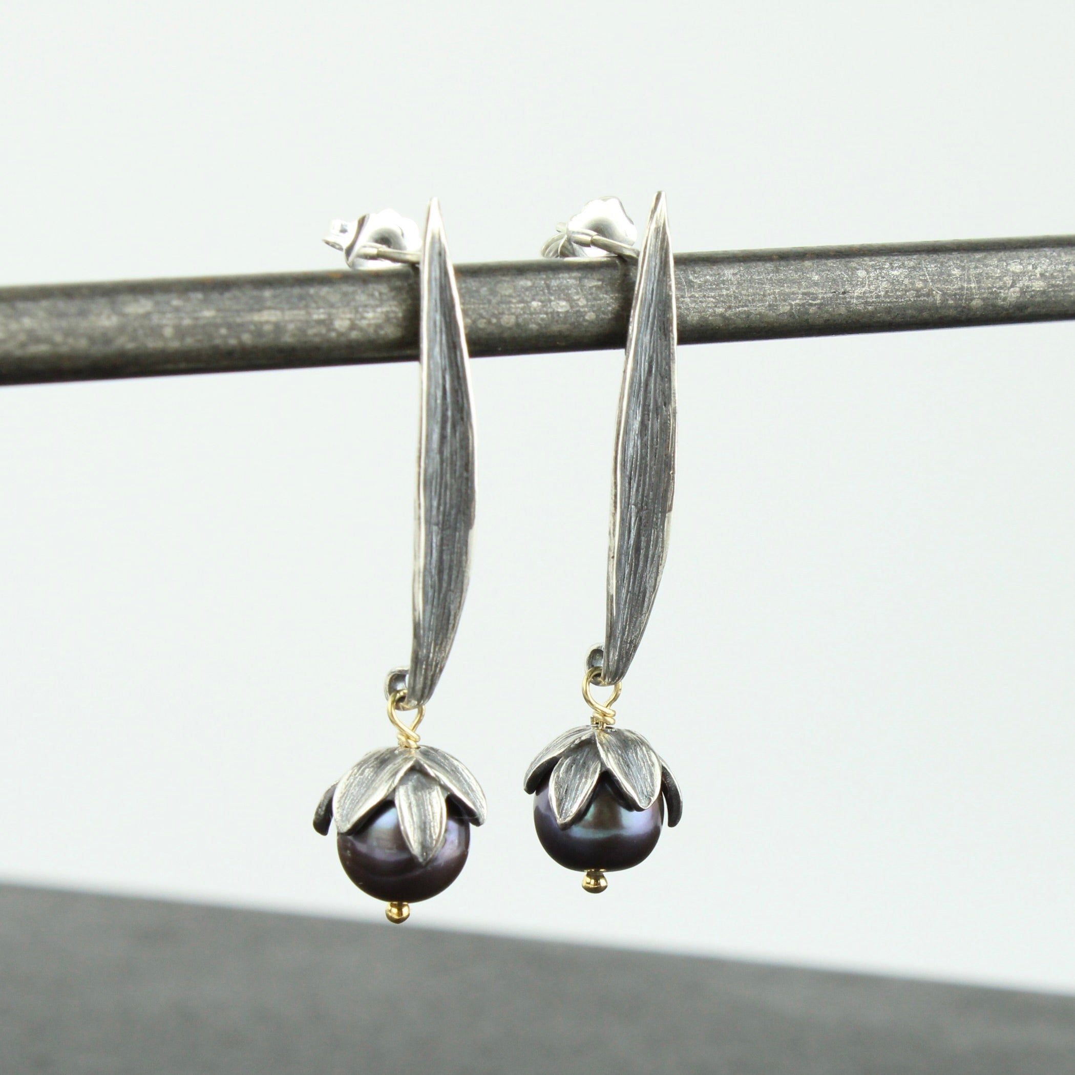 Blossom caps made by New Zealand jeweller, Louise Douglas, hold a luminous white pearl and fall from stylised grass stud tops to create an elegant look.