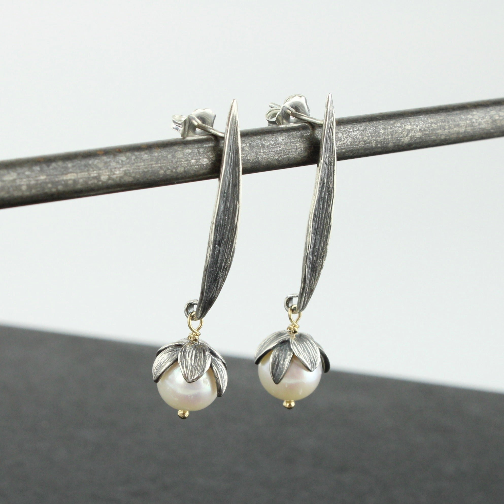 Blossom caps made by New Zealand jeweller, Louise Douglas, hold a luminous white pearl and fall from stylised grass stud tops to create an elegant look.