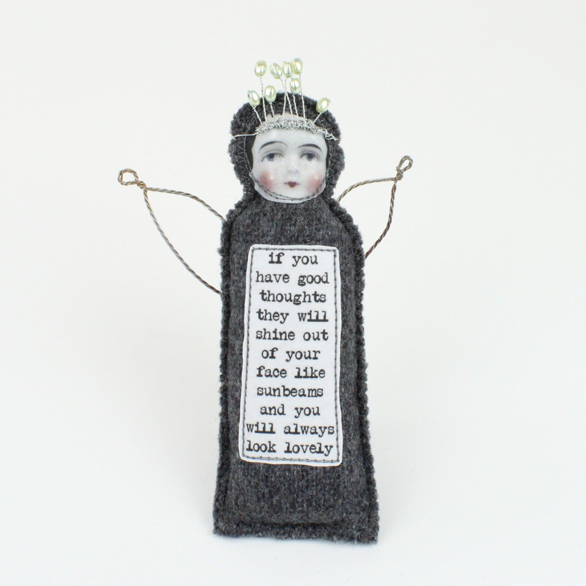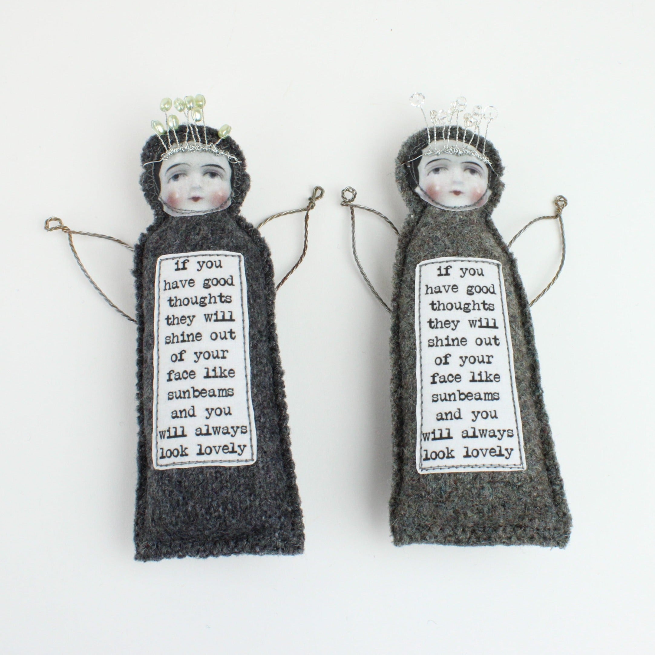 Queenies are small dollies made almost entirely from recycled materials and no two are the same. They are not perfect and neat, nor are they meant to be. They are perfectly imperfect, with a slightly wonky wing or messy beady crown. They can sit on a table or hang on the wall.