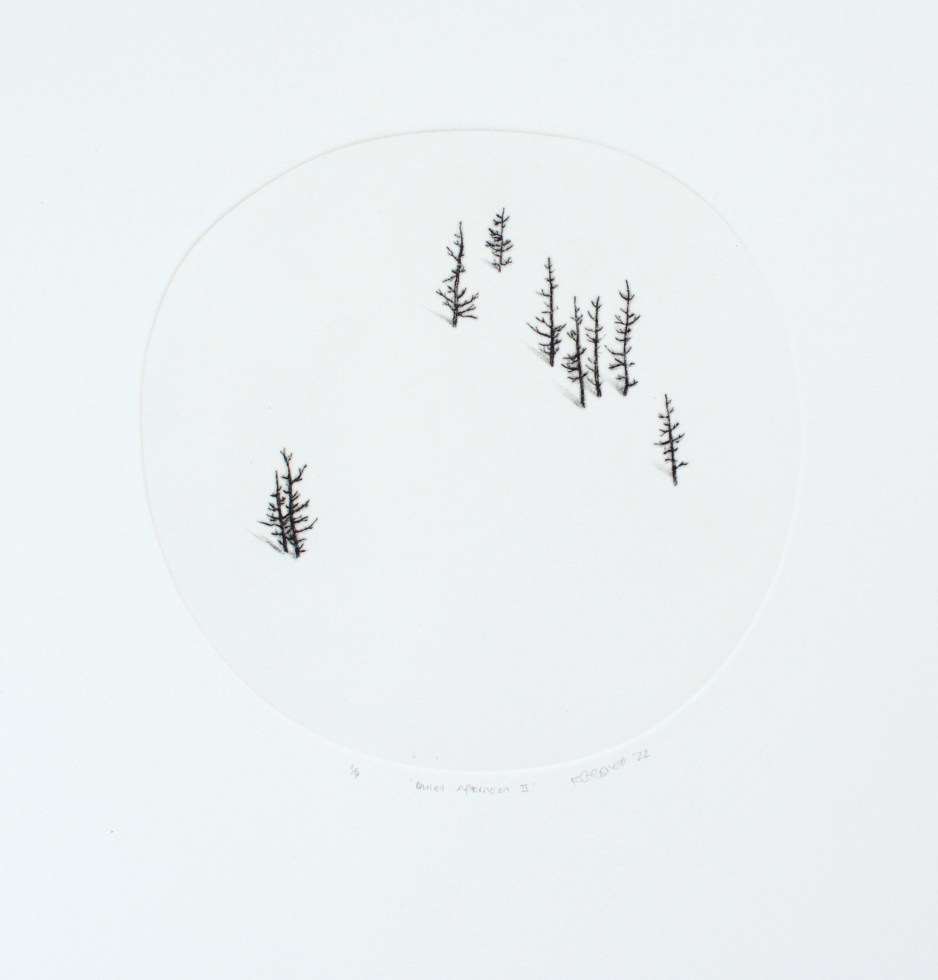 Kyla’s delicate work explores the physical impact of the elements on the environment as well as the consequences of human occupation of the land. Working mainly in mezzotint and drypoint, she strives to find a sense of stillness and a quiet celebration of nature. Her work is firmly grounded in a sense of place.