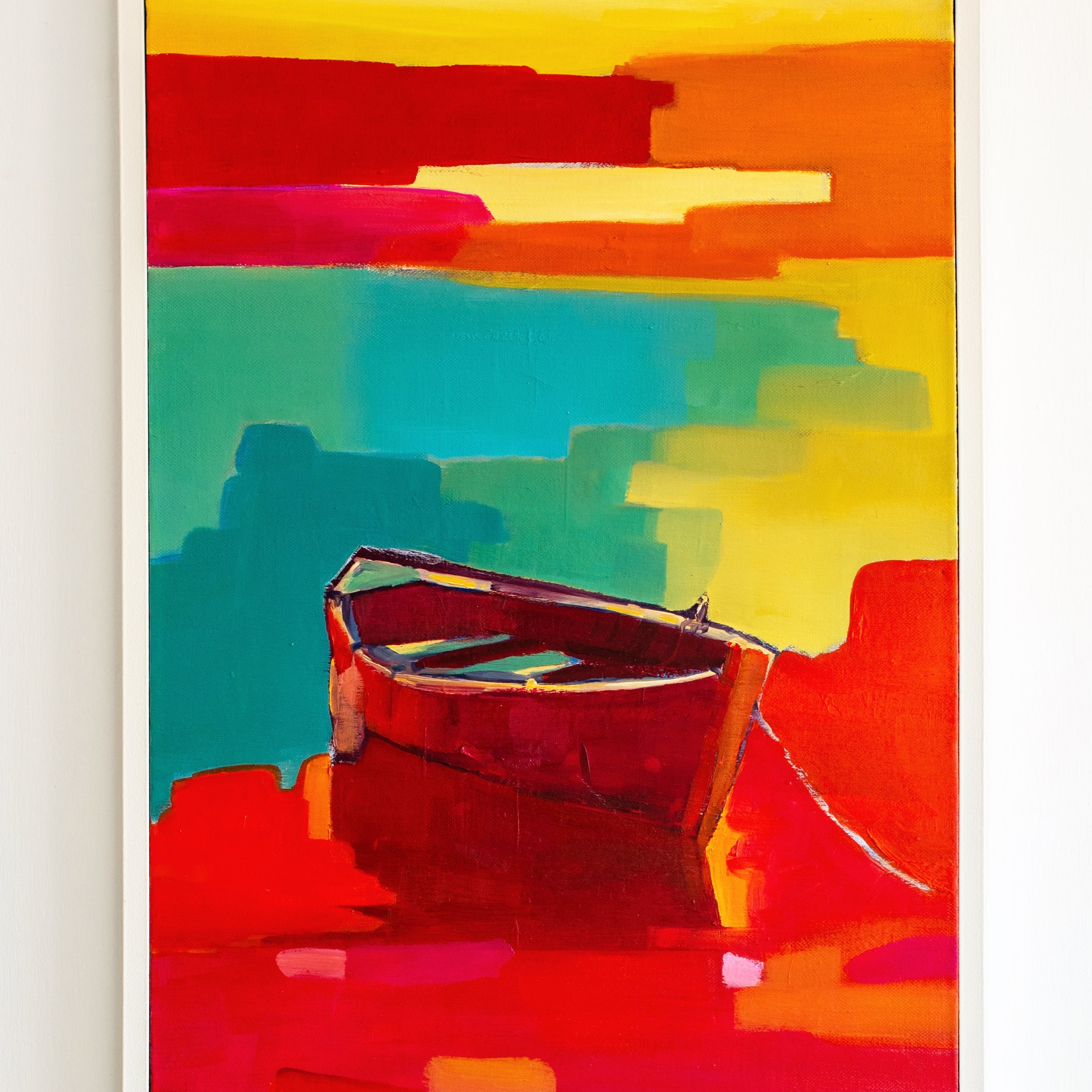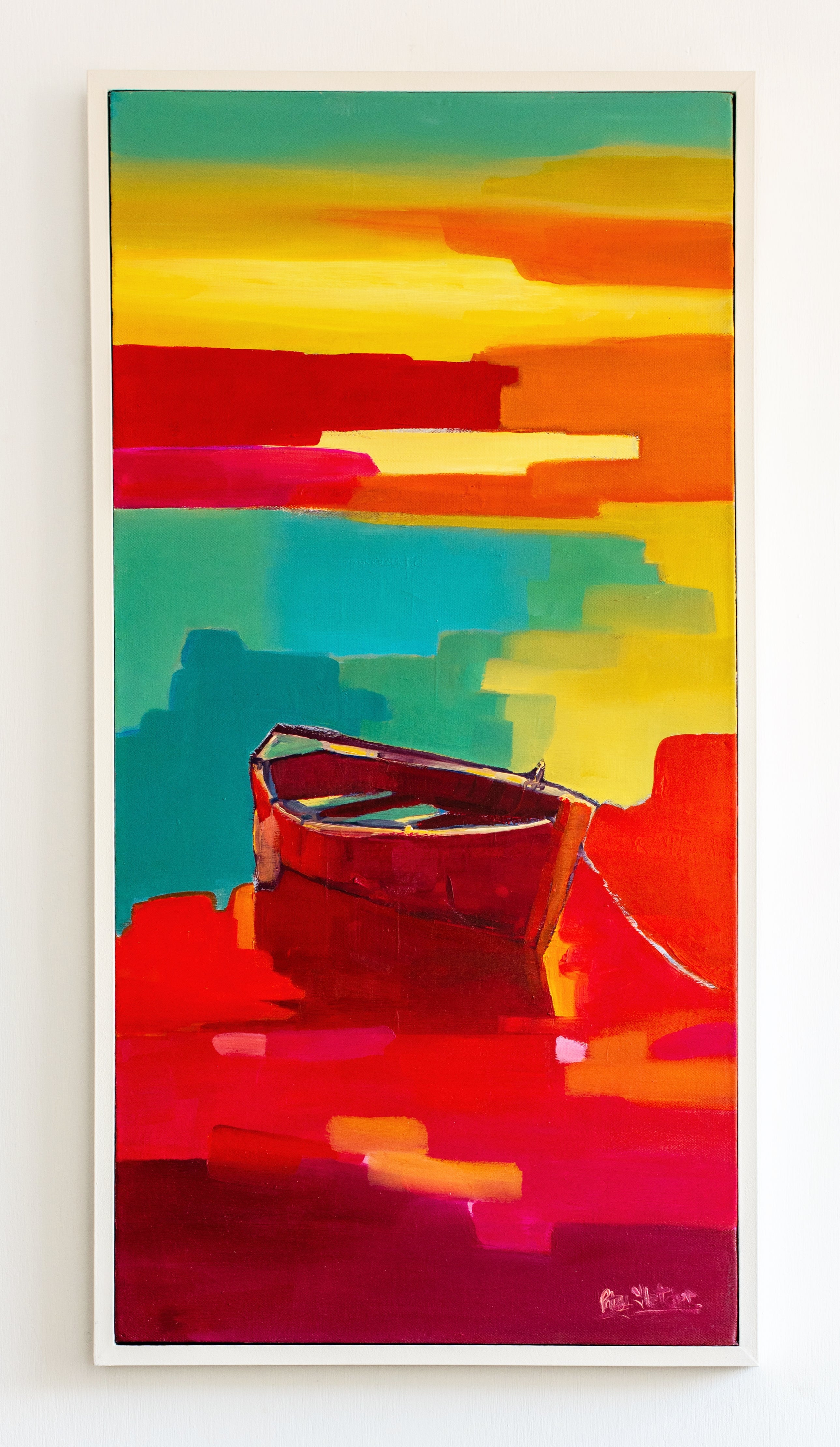 Colour and light always feature strongly in my work. Constant delight is found in ever changing landscapes, whether it be cascading sunsets admired during beach strolls or the scintillating dance of light upon the waters edge. These daily visuals are forever inspiring. Throw a boat into the scene, and a bold sculptural form appears, creating rich shadows and colourful patterns – once ordinary craft become vibrant confident models.