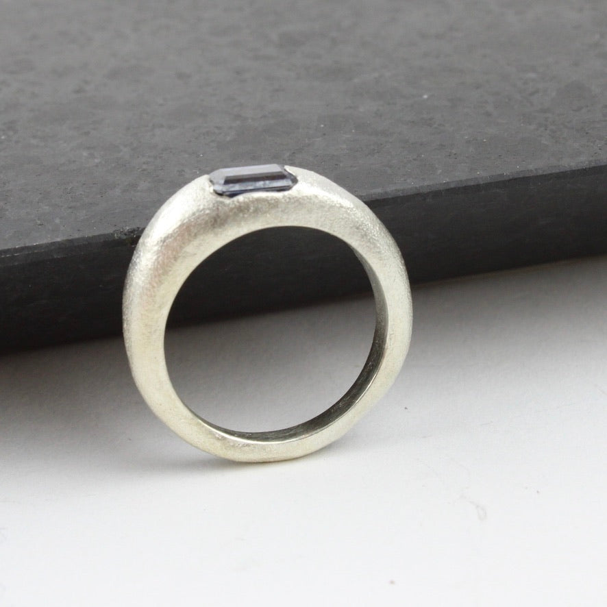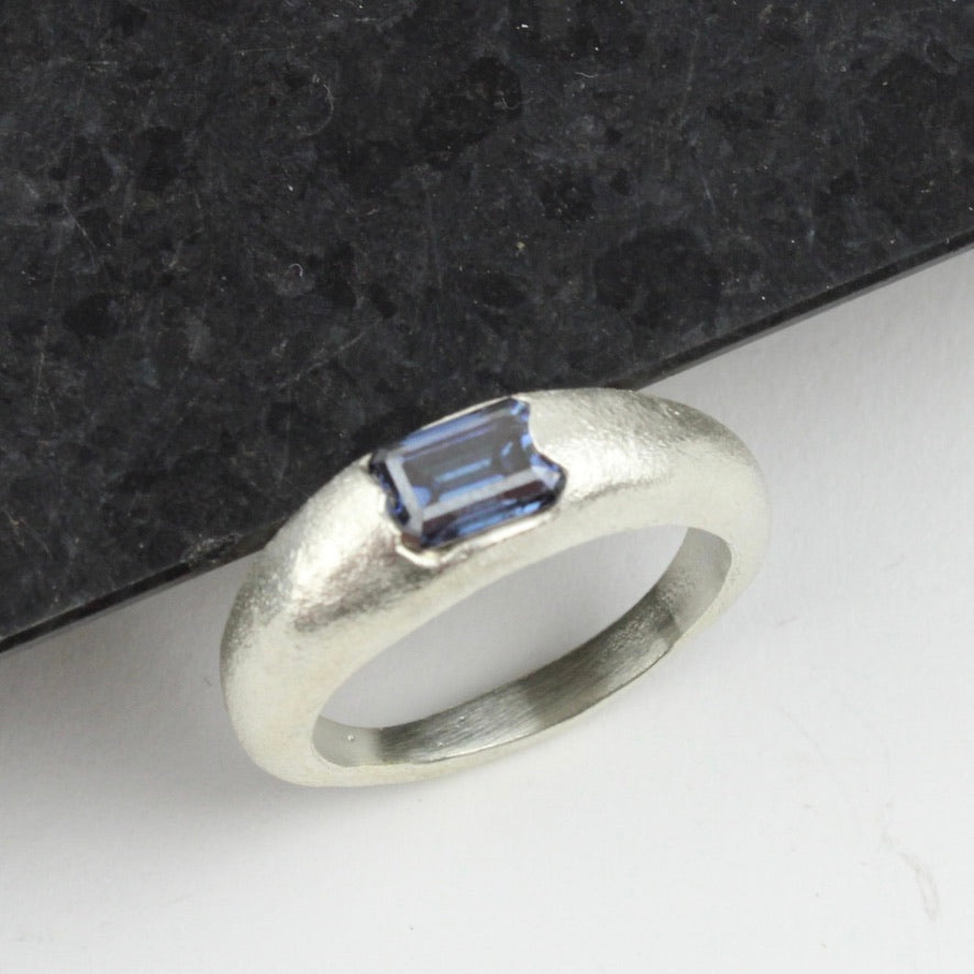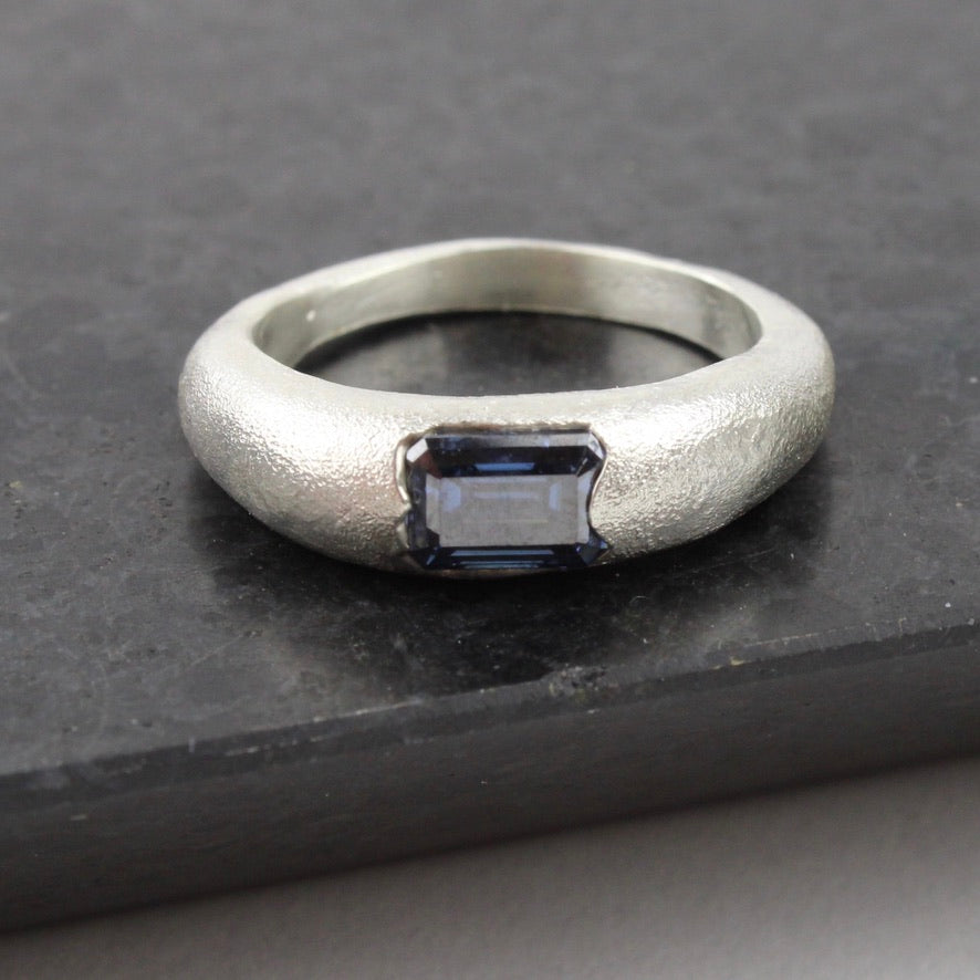 Silver band with blue moissanite