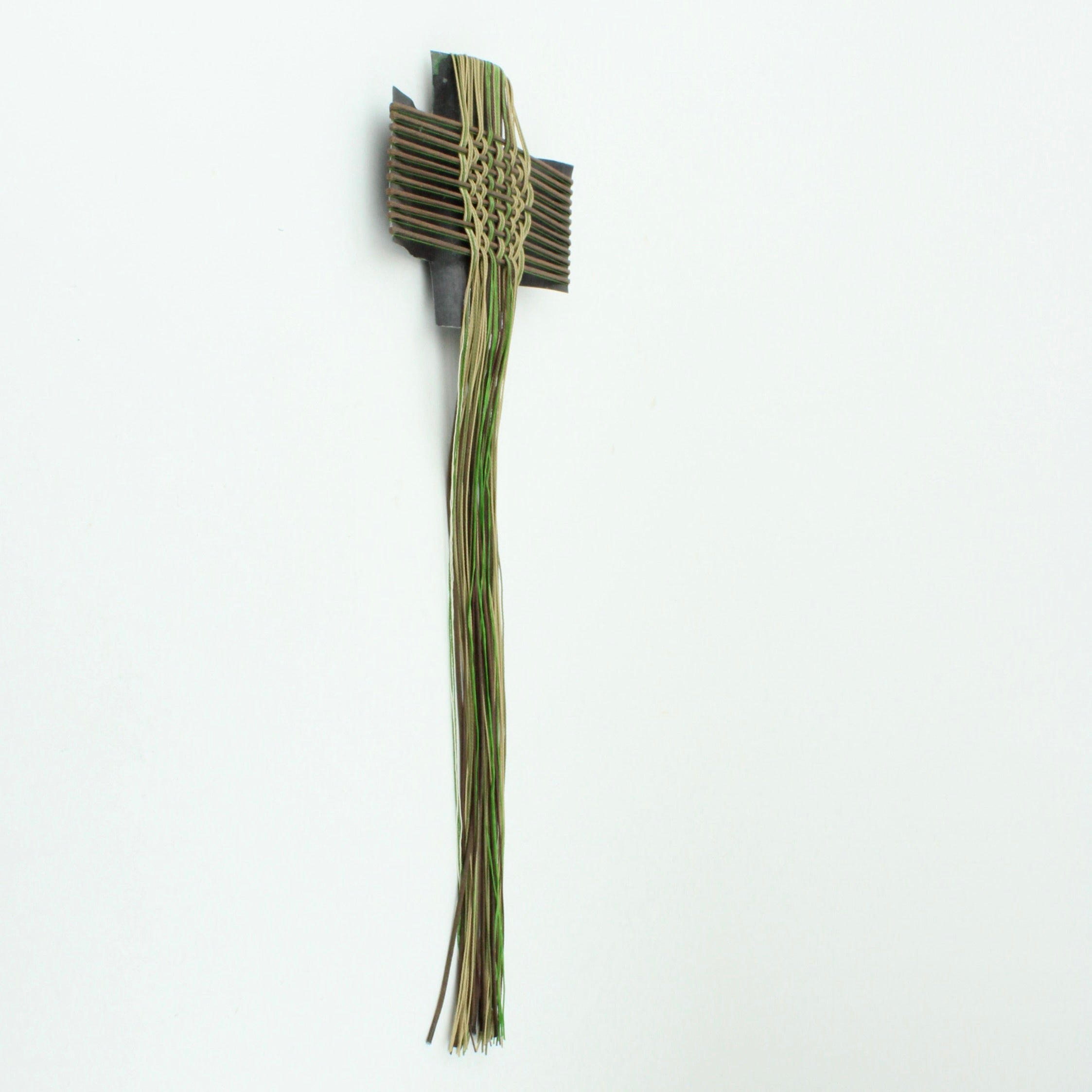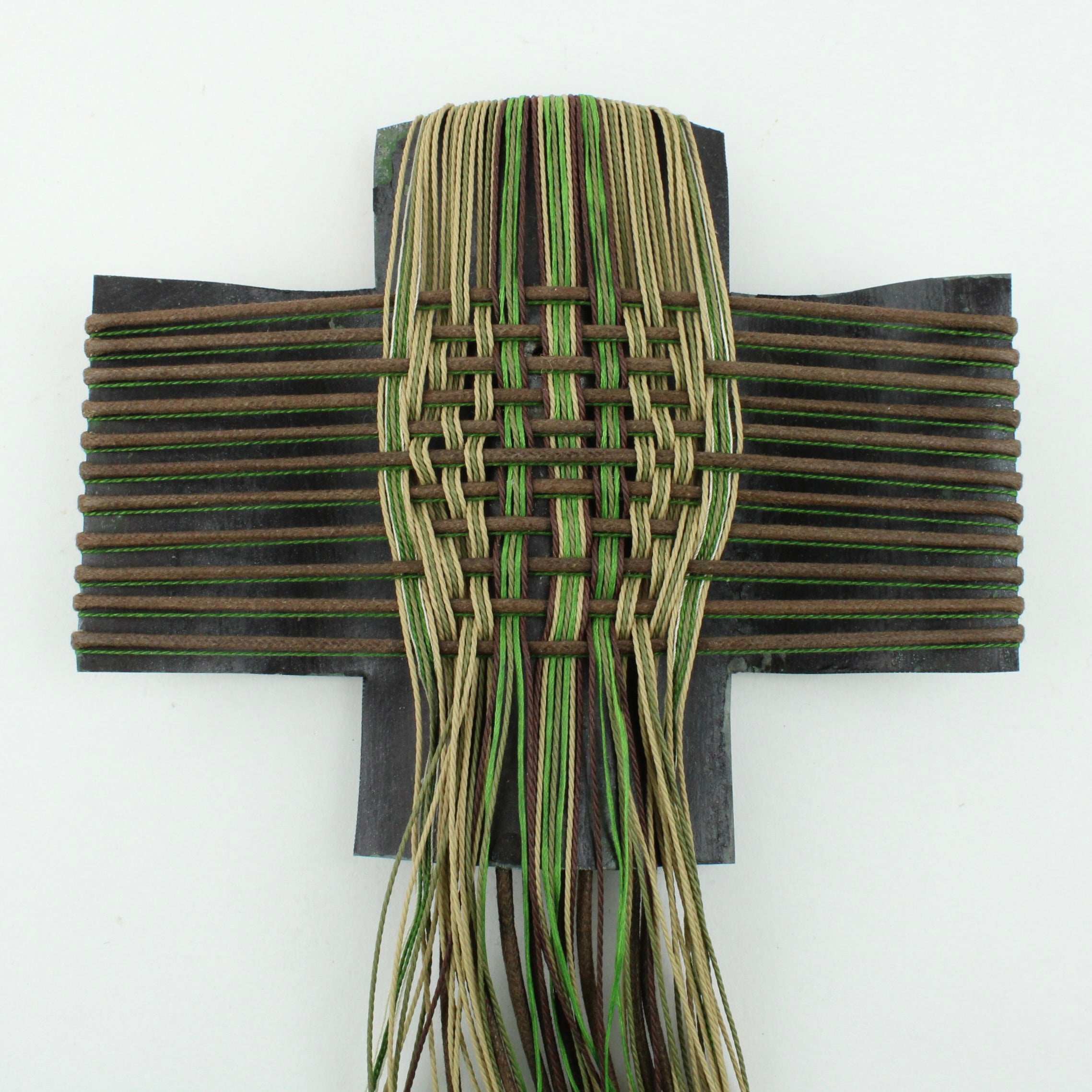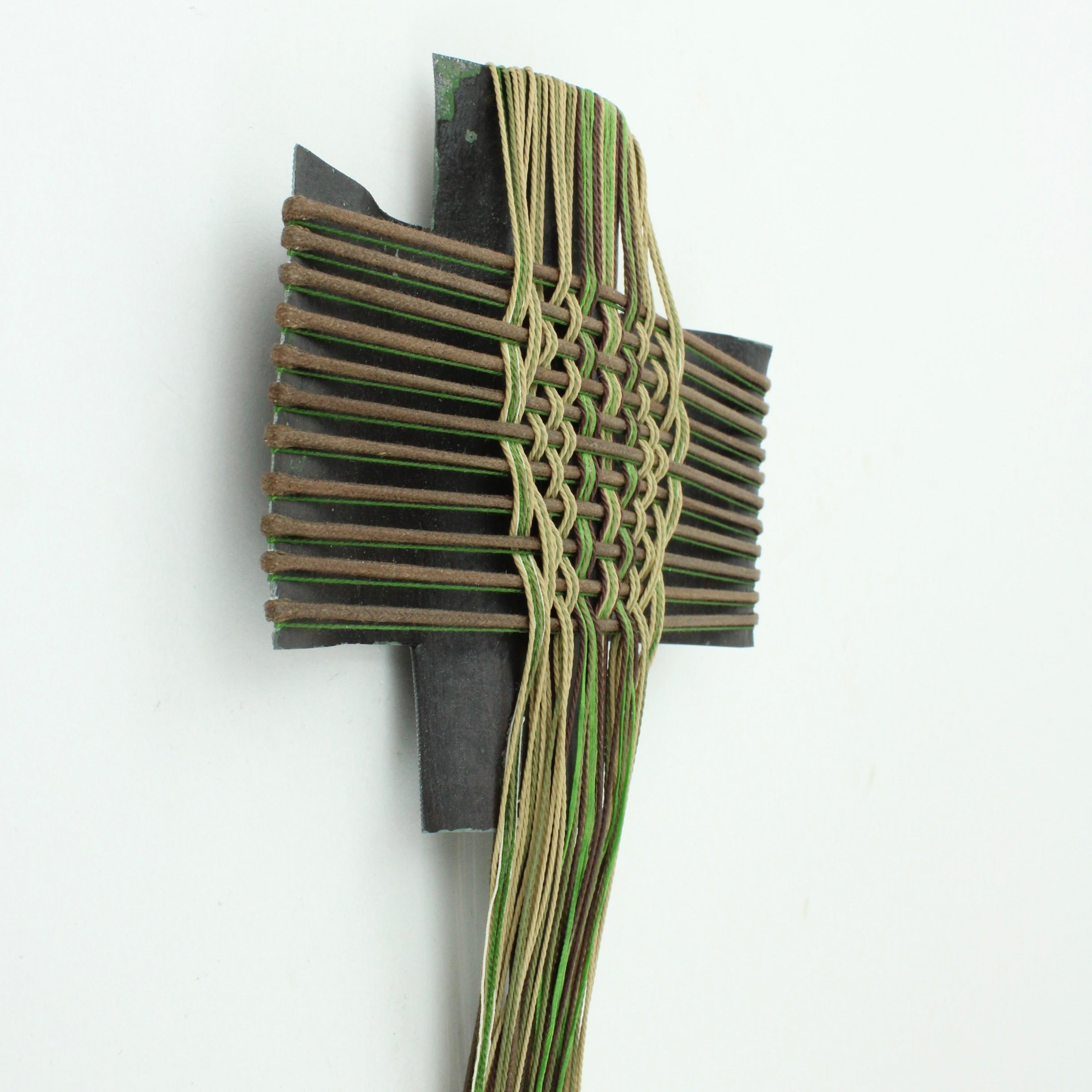 Rescued corrugated iron from Wānaka and woven with mercerised thread, and waxed cord.