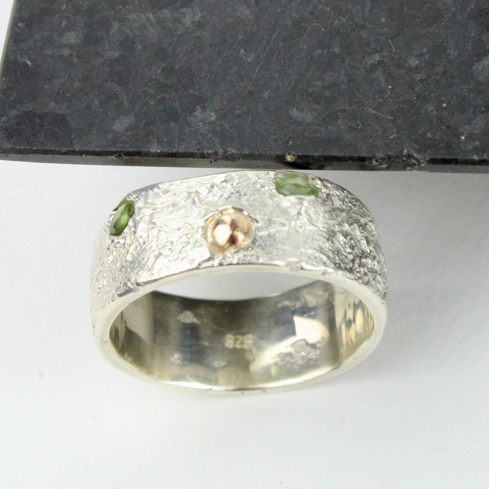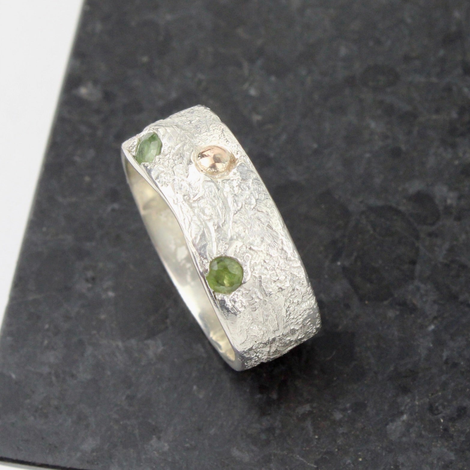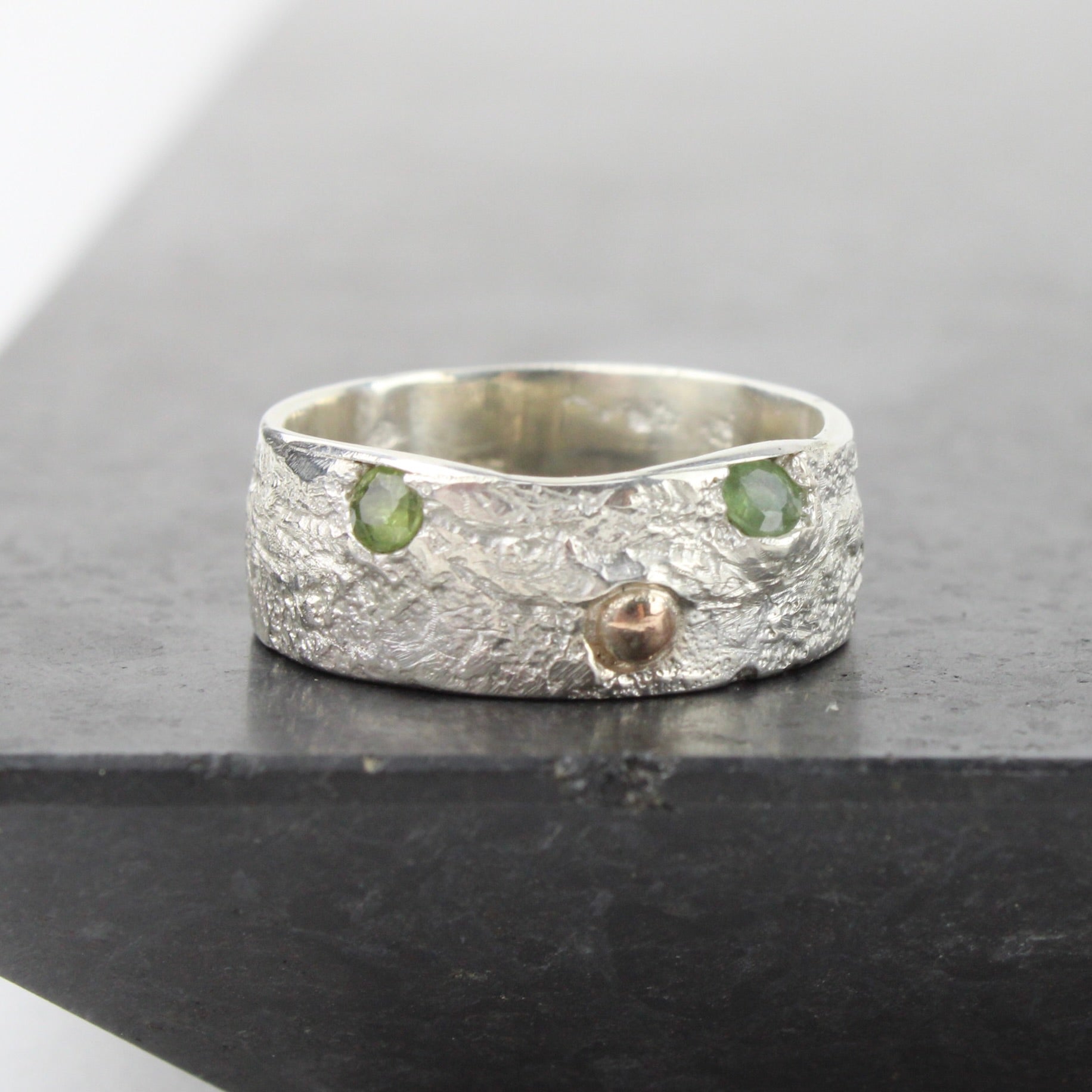 Sandcast sterling silver with 9ct gold ball and two green cast in places sapphires