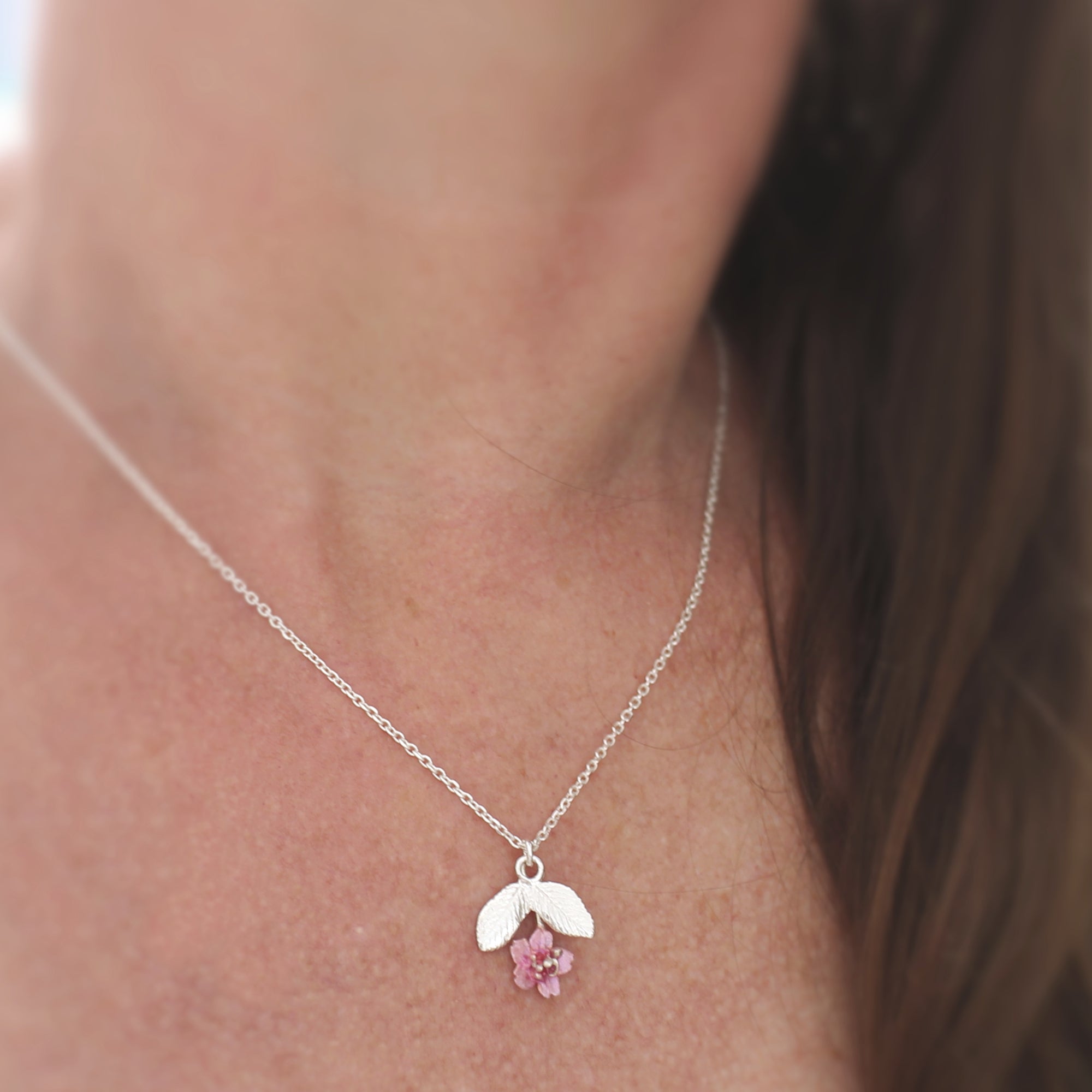 Sterling silver Sakura blossom (9mm x 9mm), hand painted with porcelain paint, and hanging from double leaves (11mm x 16mm). The porcelain paint is water and scratch resistant.