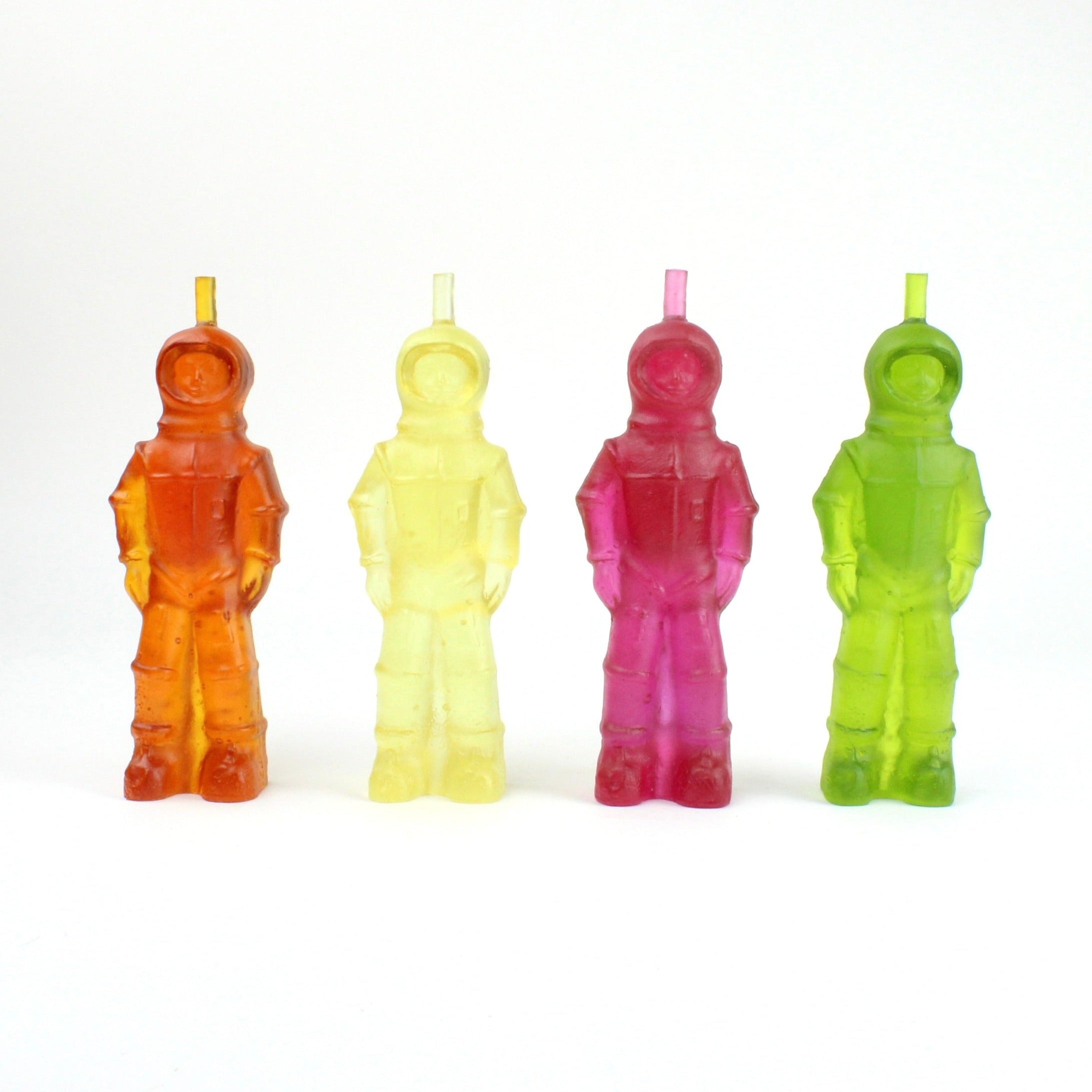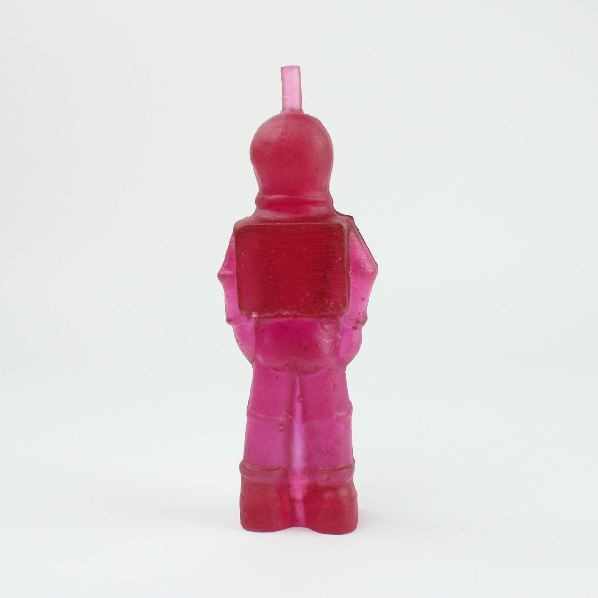 Callum Mitchell Gore found the original retro plastic Spaceman Drink Bottle after searching numerous landfill sites around New Zealand. He made a mould to keep the exact details of the original bottle. Callum then cast them in glass in the favourite 'flavours' of the day. Working out of fellow glass and ceramic artist Simon Lewis Wards's studio, Callum's standing Spaceman Drink Bottle weighs 880grams.