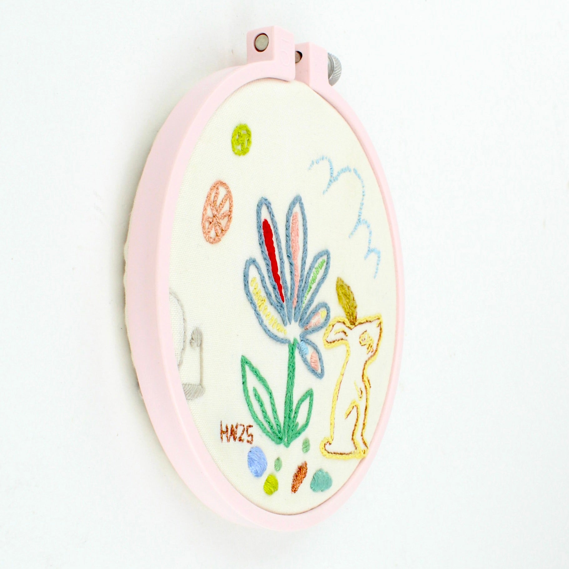 Guided by a commitment to sustainability, Hannah’s creative practice embraces vintage materials, breathing new life into forgotten fabrics and colourful embroidery hoops. Her work reflects a harmonious balance between nature’s impermanence and her dedication to preserving its essence.