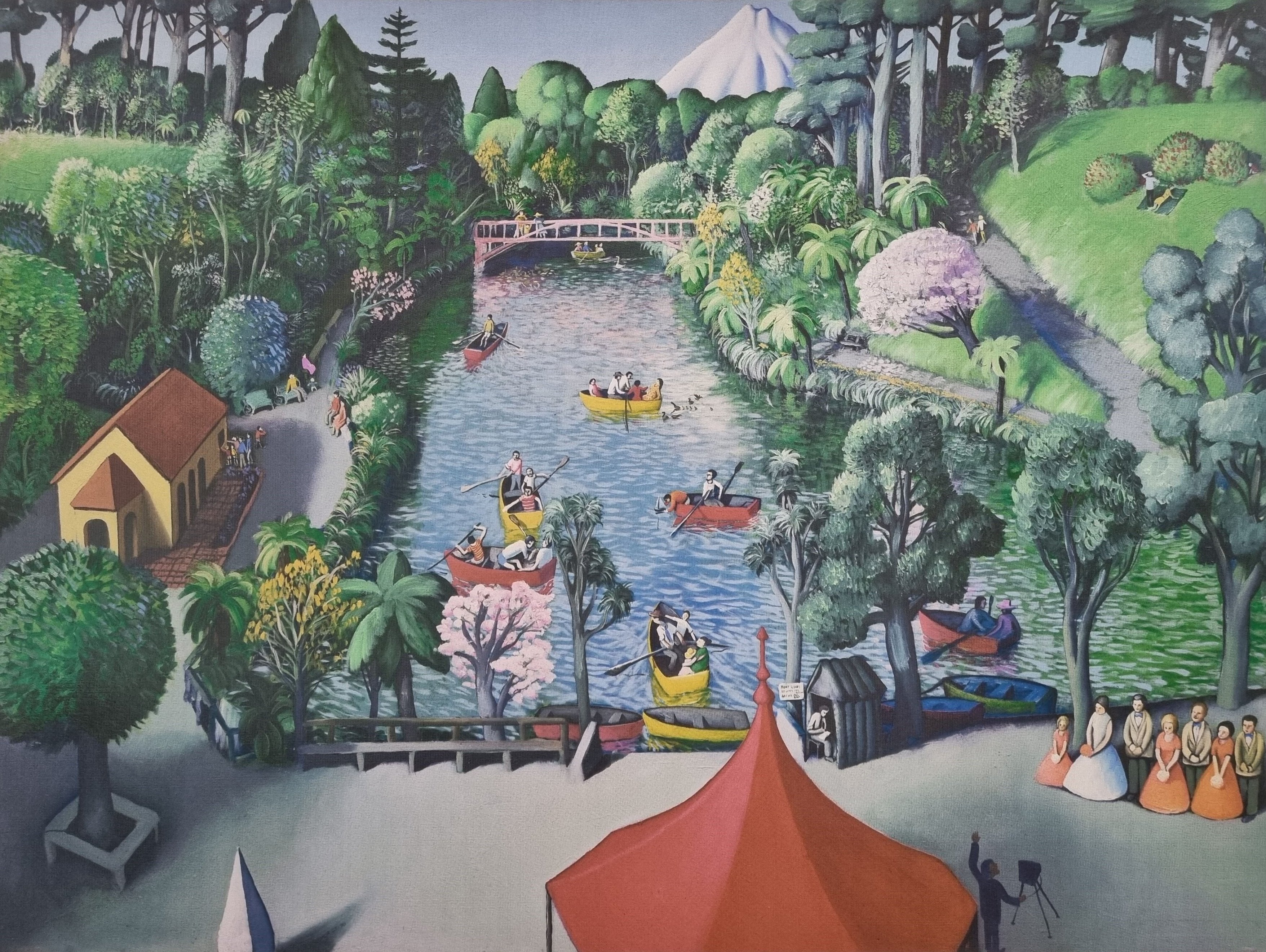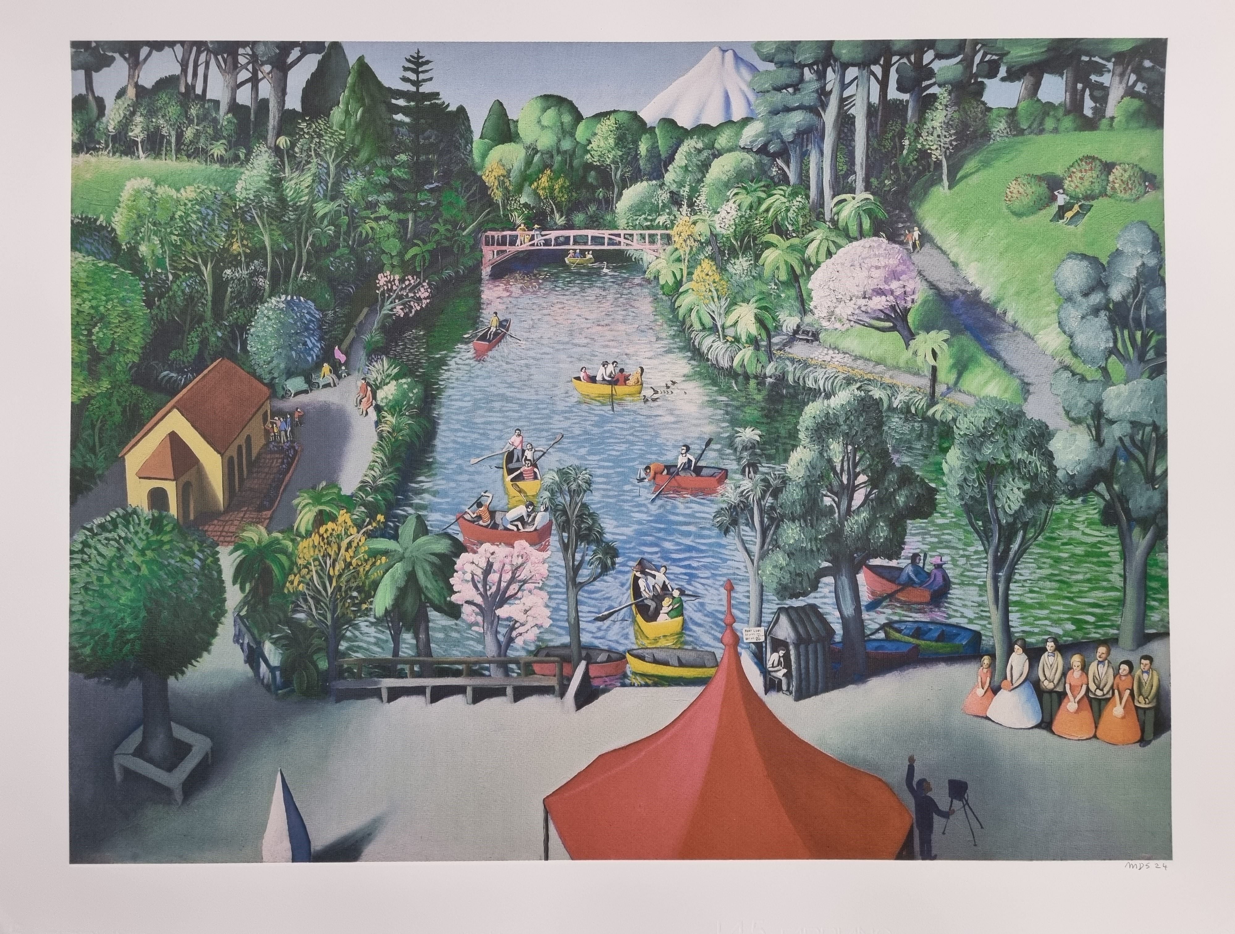 'My Grandfather, Ninian Duncan, took me for pram rides in Pukekura Park to feed the ducks. Big black swans used to reach right into the pram and terrify and delight me all at once. At the Gables I lived right beside Pukekura Park and made many paintings of these lakes.' Michael Smither
