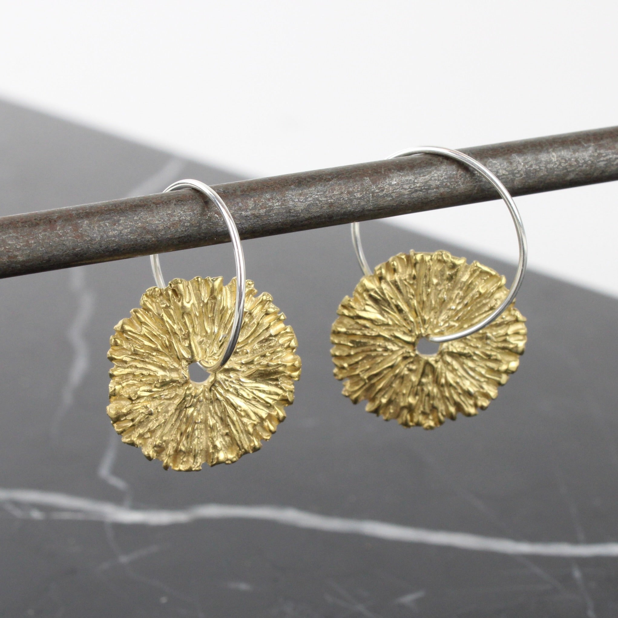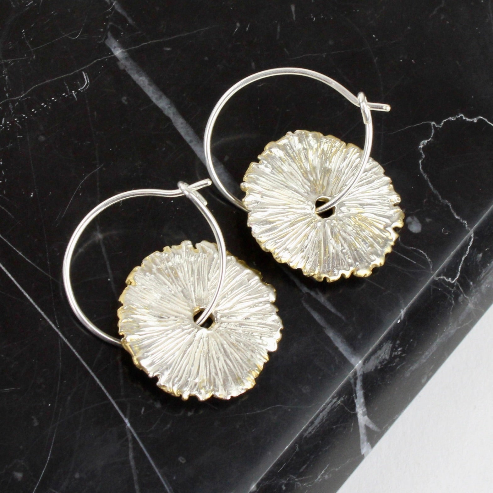 Cast sterling silver earrings with 23ct gold plating on the front and silver on the back. Inspired by sun rays reflected down through sea water