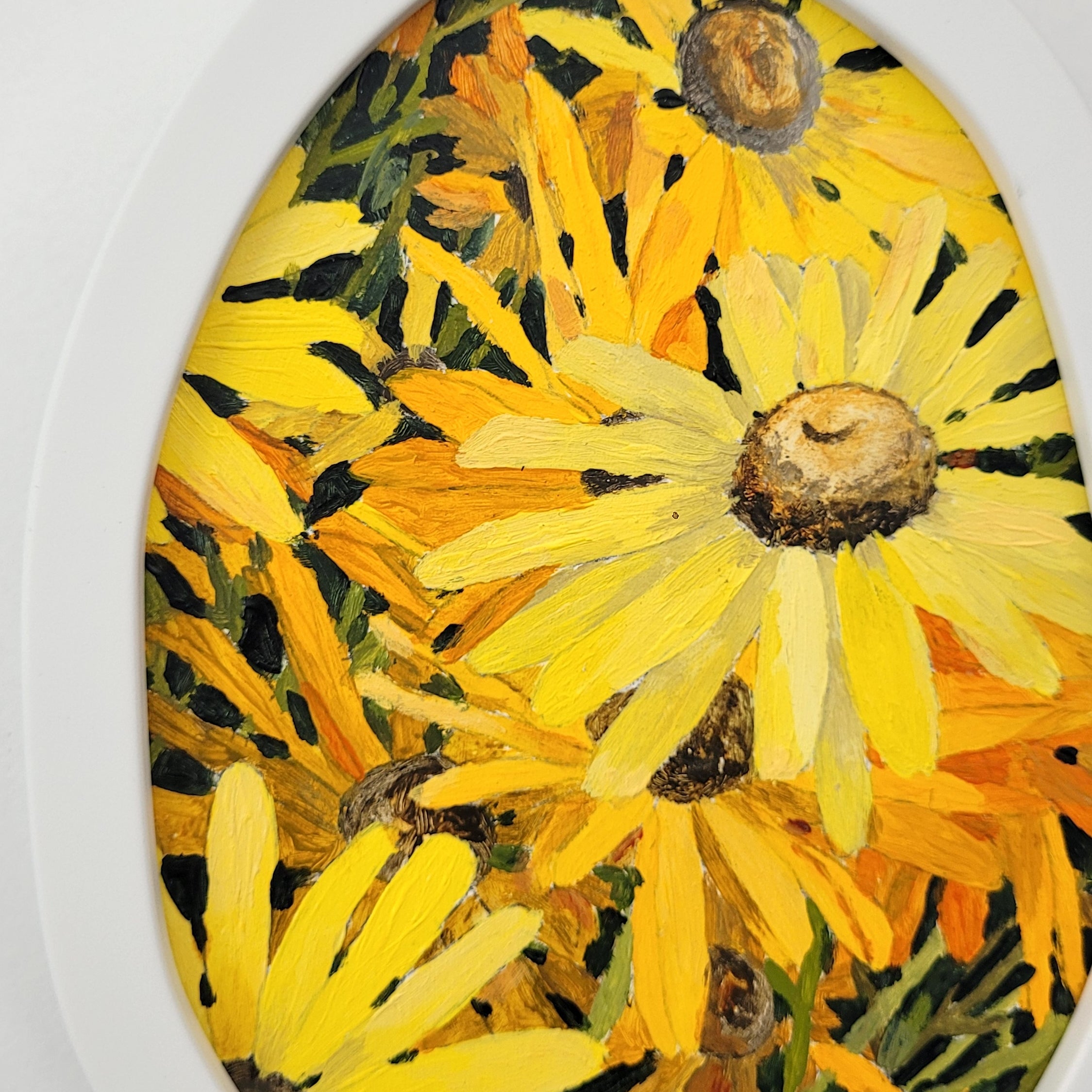 She has a particular interest in the treatment of the backgrounds of her work, with base colours often showing through, and colour blocking between stalks and blooms is always a feature of her work.