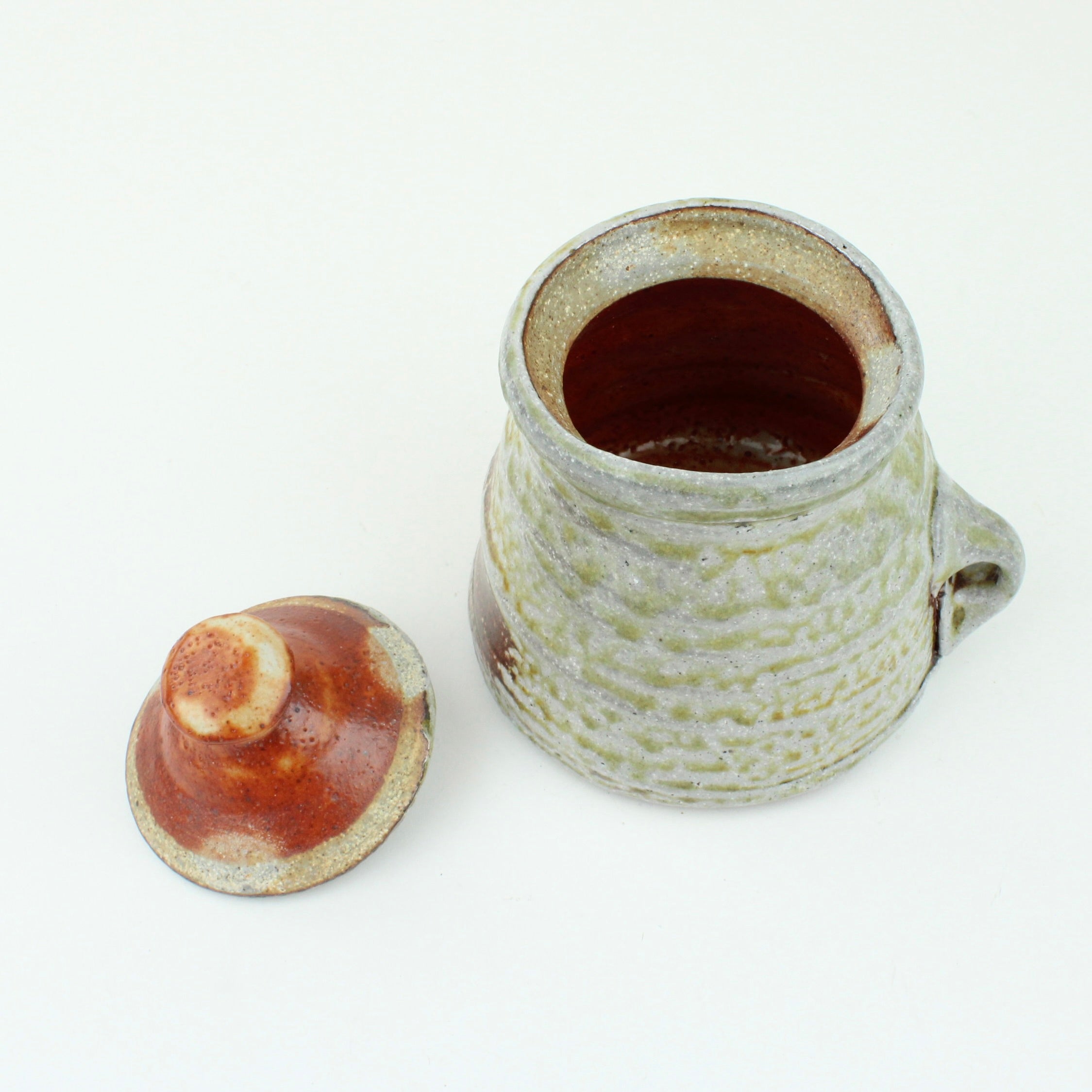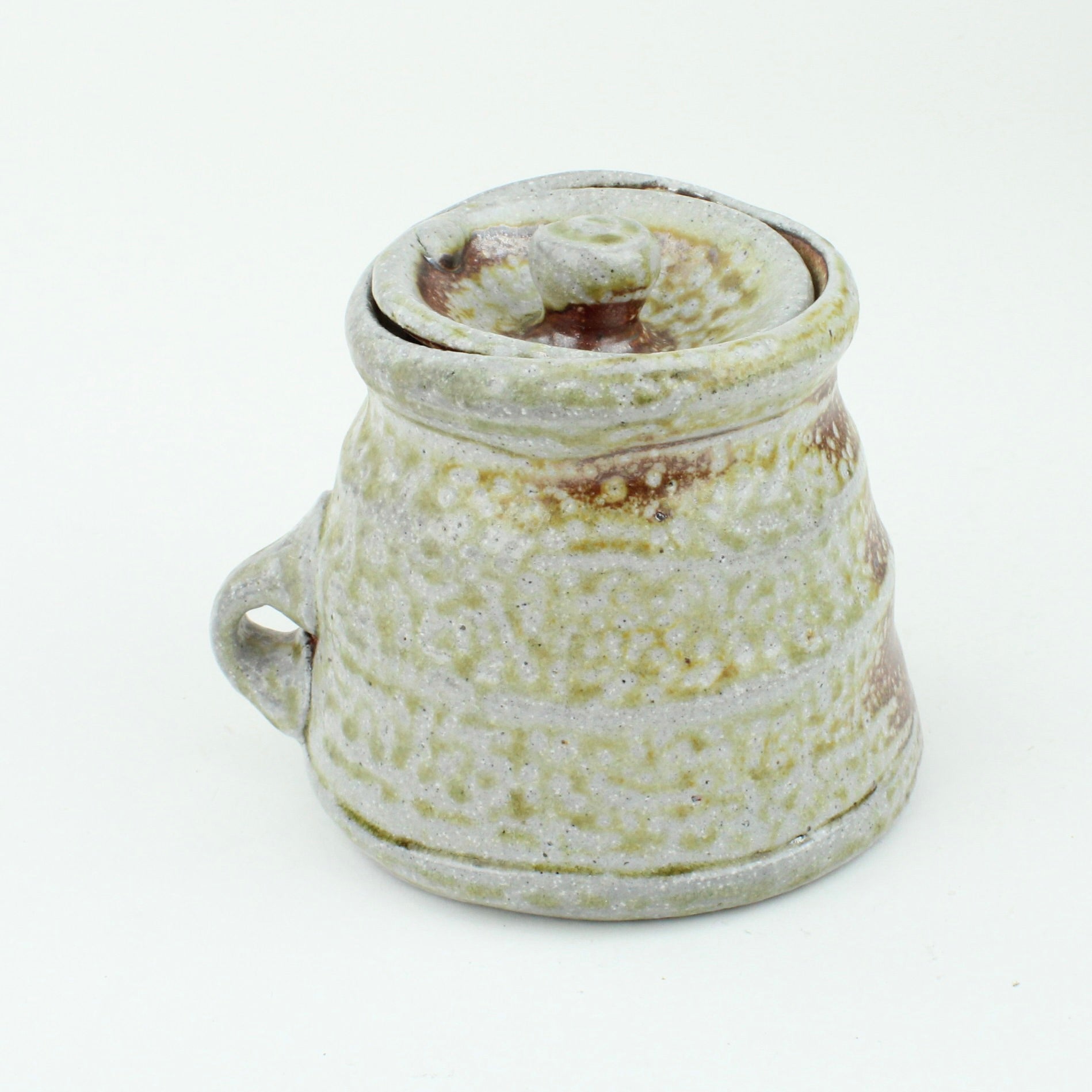 Duncan Shearer throws his pots on a slow-moving treadle wheel, responding intuitively to the differing characteristics of clay. Most of his work begins on the wheel before being added to and subtracted from, altering the initial round forms in search of a liveliness and freshness that carries through the entire making process. His firing method, using a wood kiln and spraying a small quantity of soda ash solution at high temperatures, introduces an inherent unpredictability, creating variegated flashings and speckled glaze patterns that make each piece unique.