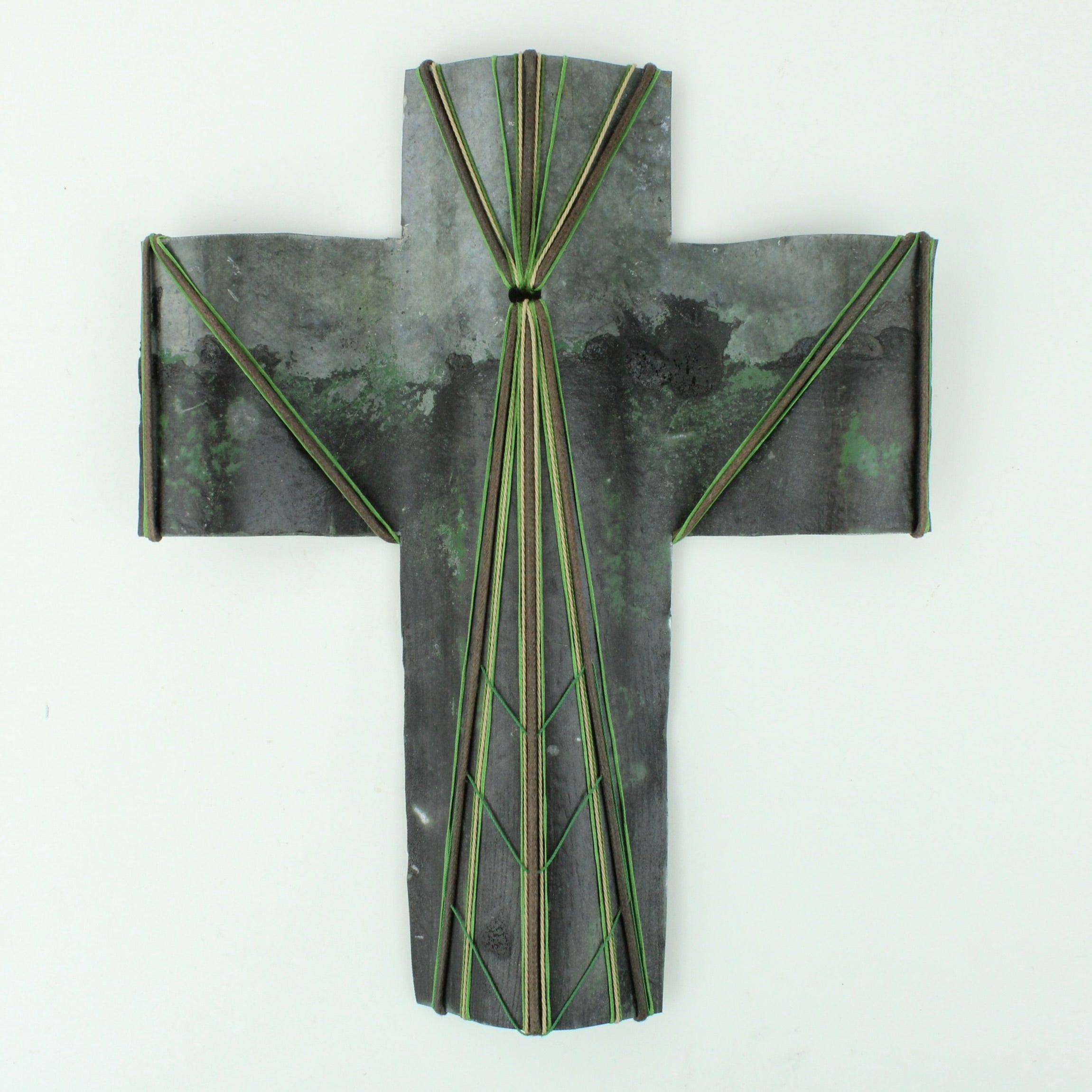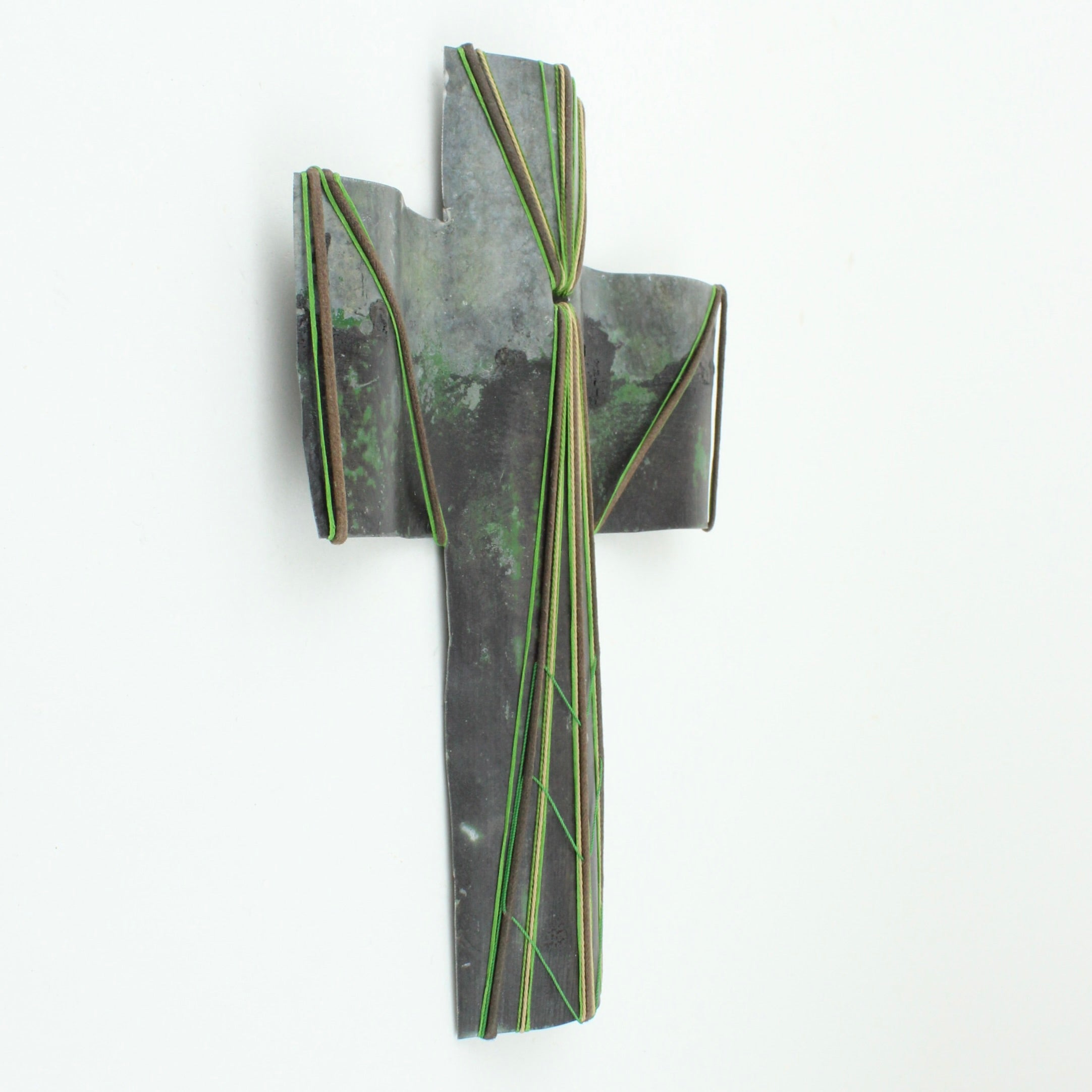 Gilly Sheffield’s corrugated iron crosses explore the interwoven nature of whānau and culture. Using iconic corrugated iron, long associated with sheltering New Zealand homes, and combining it with traditional weaving, she highlights the skills and knowledge passed down through generations across the diverse cultures that shape Aotearoa.