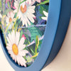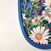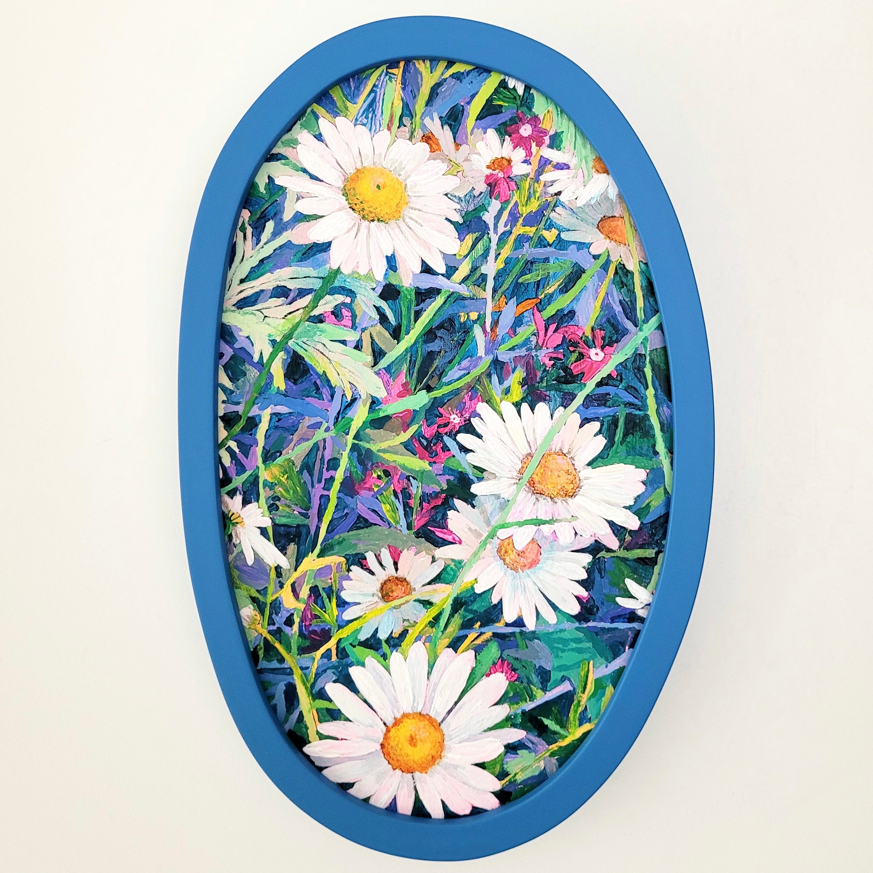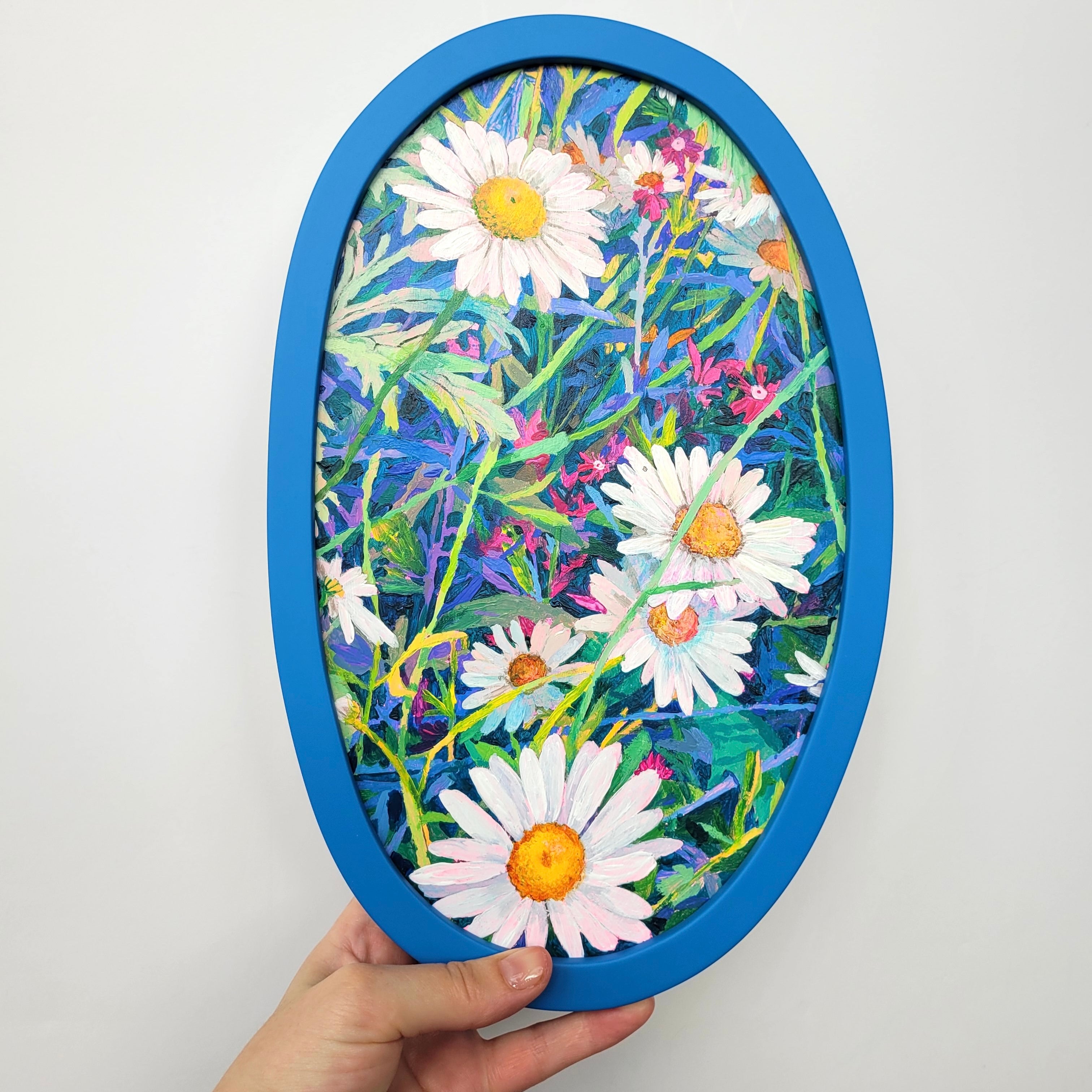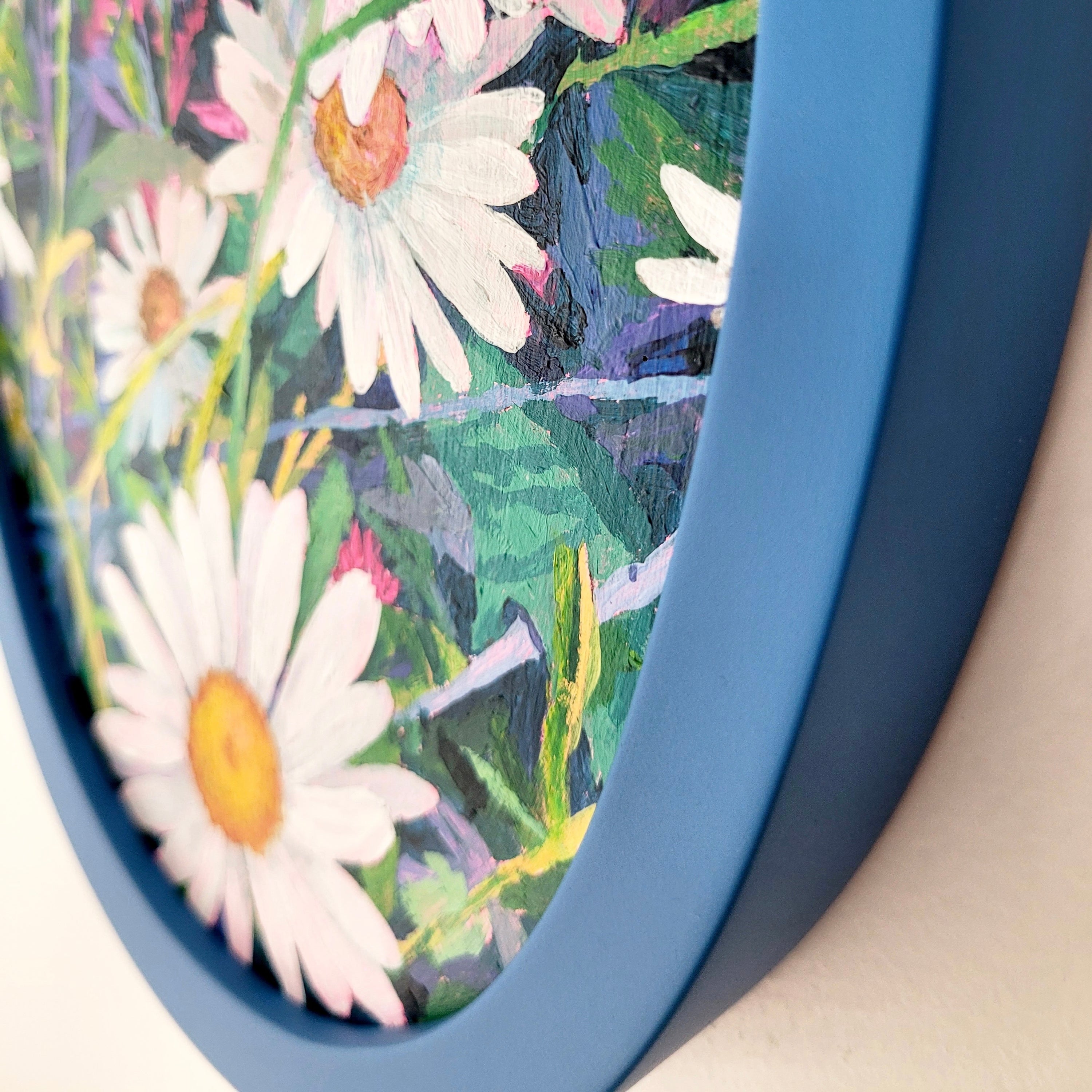 An untamed garden alive with white daisies and pops of pink blooms, its uniquely shaped panel making you feel as though you’re peeking into a moment of untamed beauty. Framed in a custom made ‘wobbly’ frame in sky blue with matt finish.