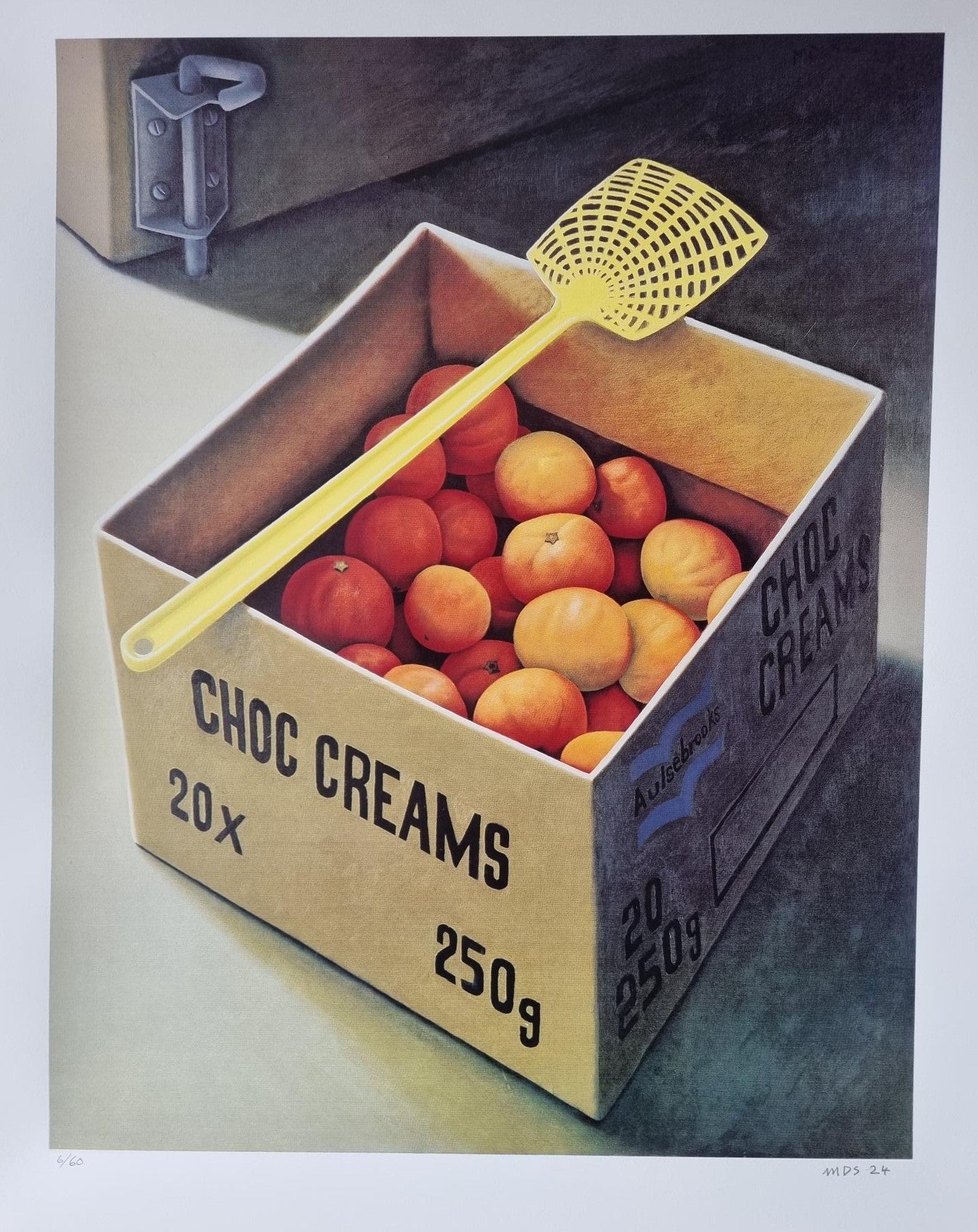 'I did two paintings of these tangelos in a cardboard box. This is the larger version. The fly swat and the door bolt are the touch of reality. On my return from a trip to Auckland, the rats had eaten the oranges and most of the box.' Michael Smither
