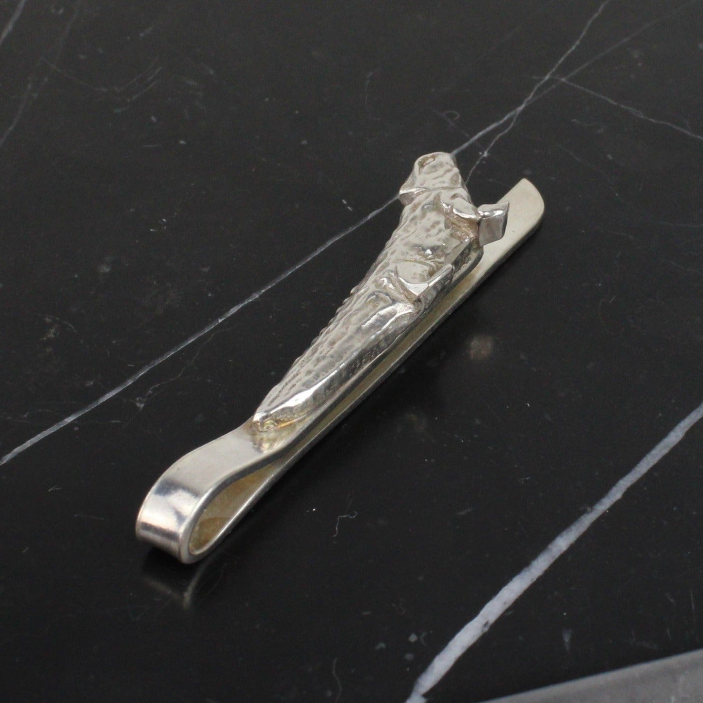 This tie slide is hand crafted in sterling silver, with a hand carved miniature tuatara at the front. The piece comes in a bright polish finish.