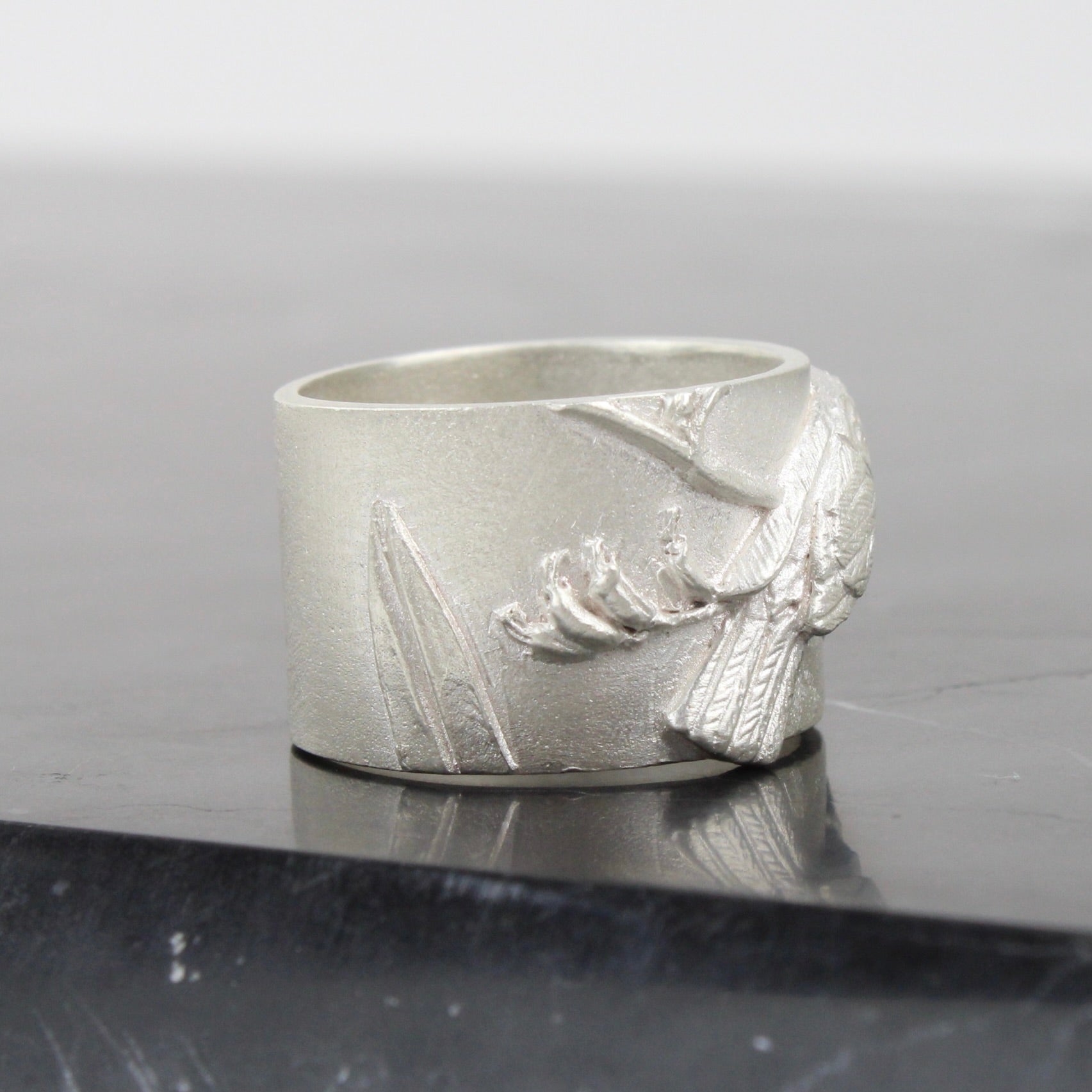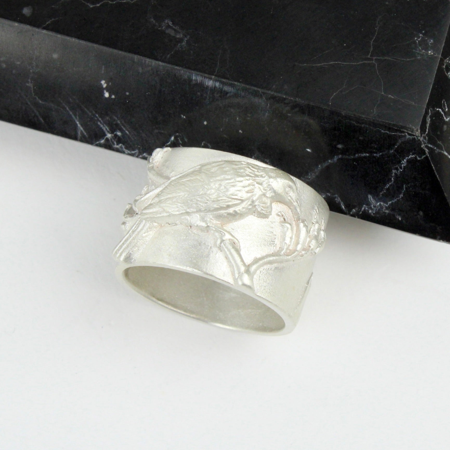 Sterling silver ring crafted with a New Zealand native Tui in Flax.