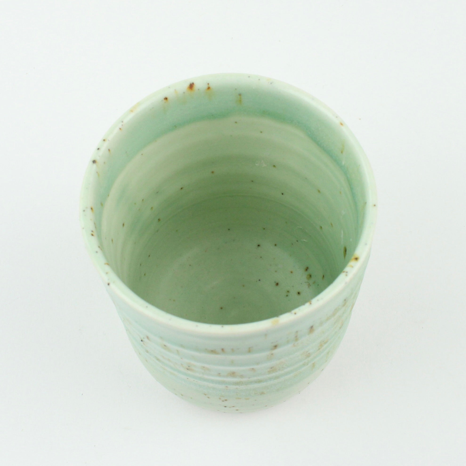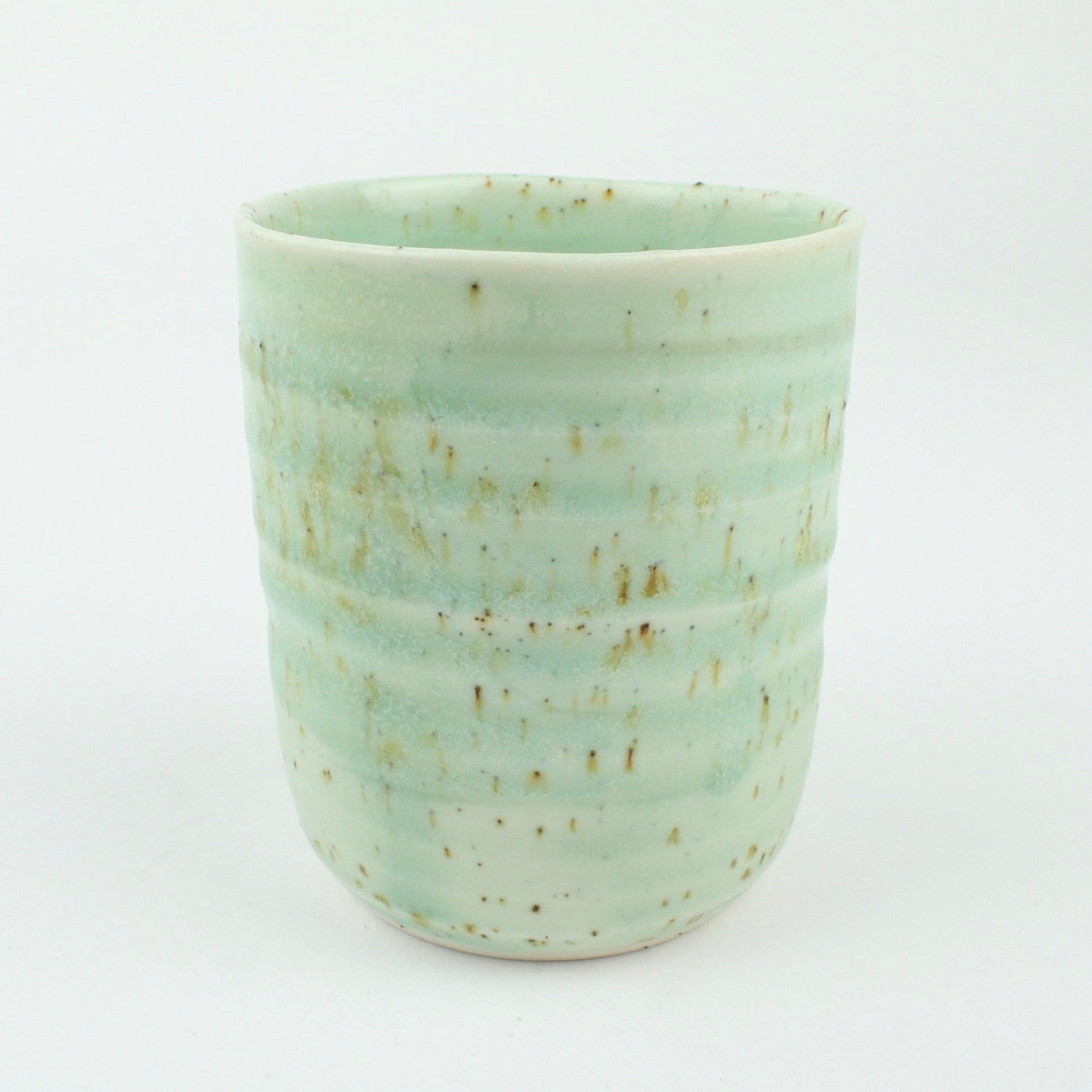 Her cups have been made with clay from Nelson/Whakatu and then covered in slip and combed in some cases and glazed in celadon, celadon/ash or dolomite white glazes.