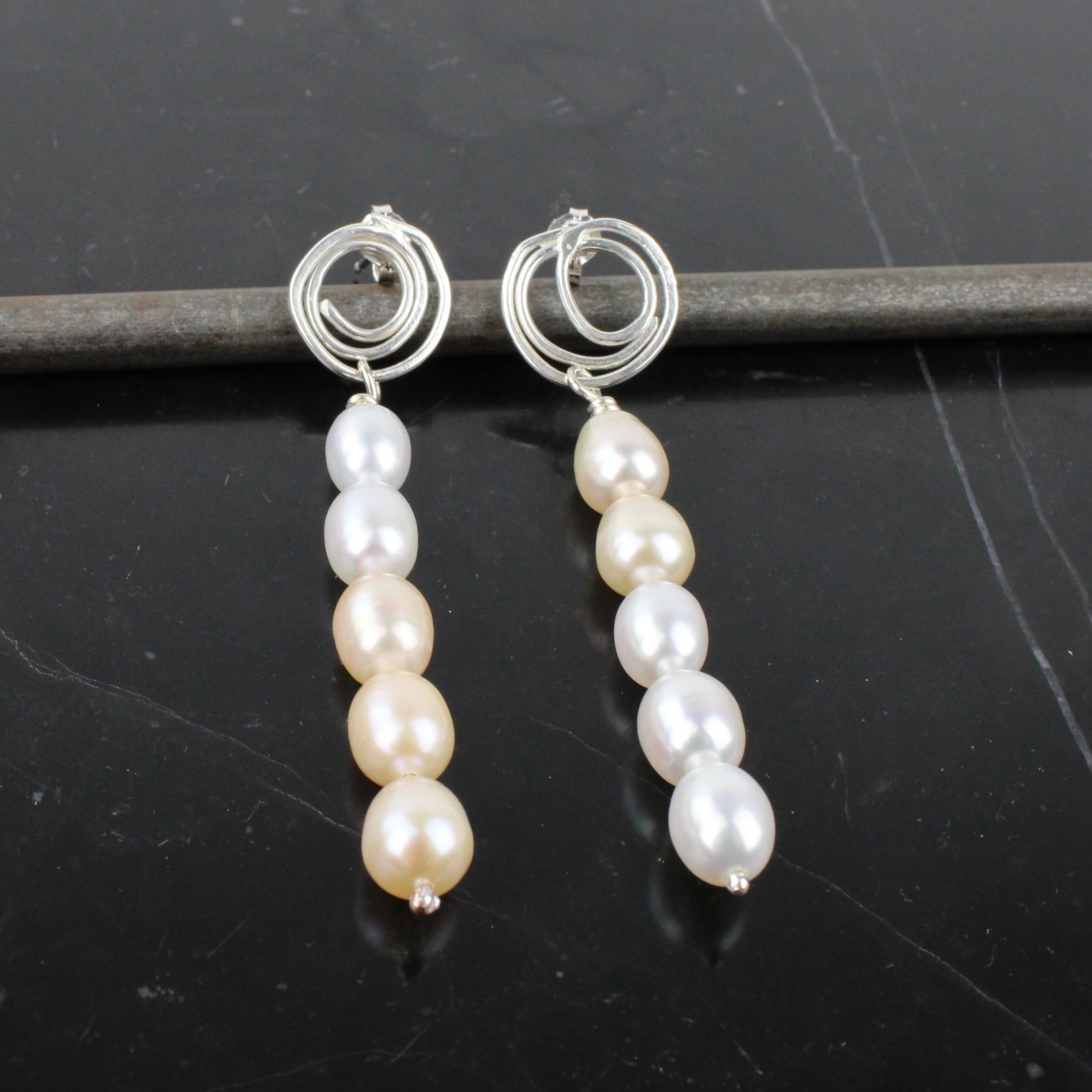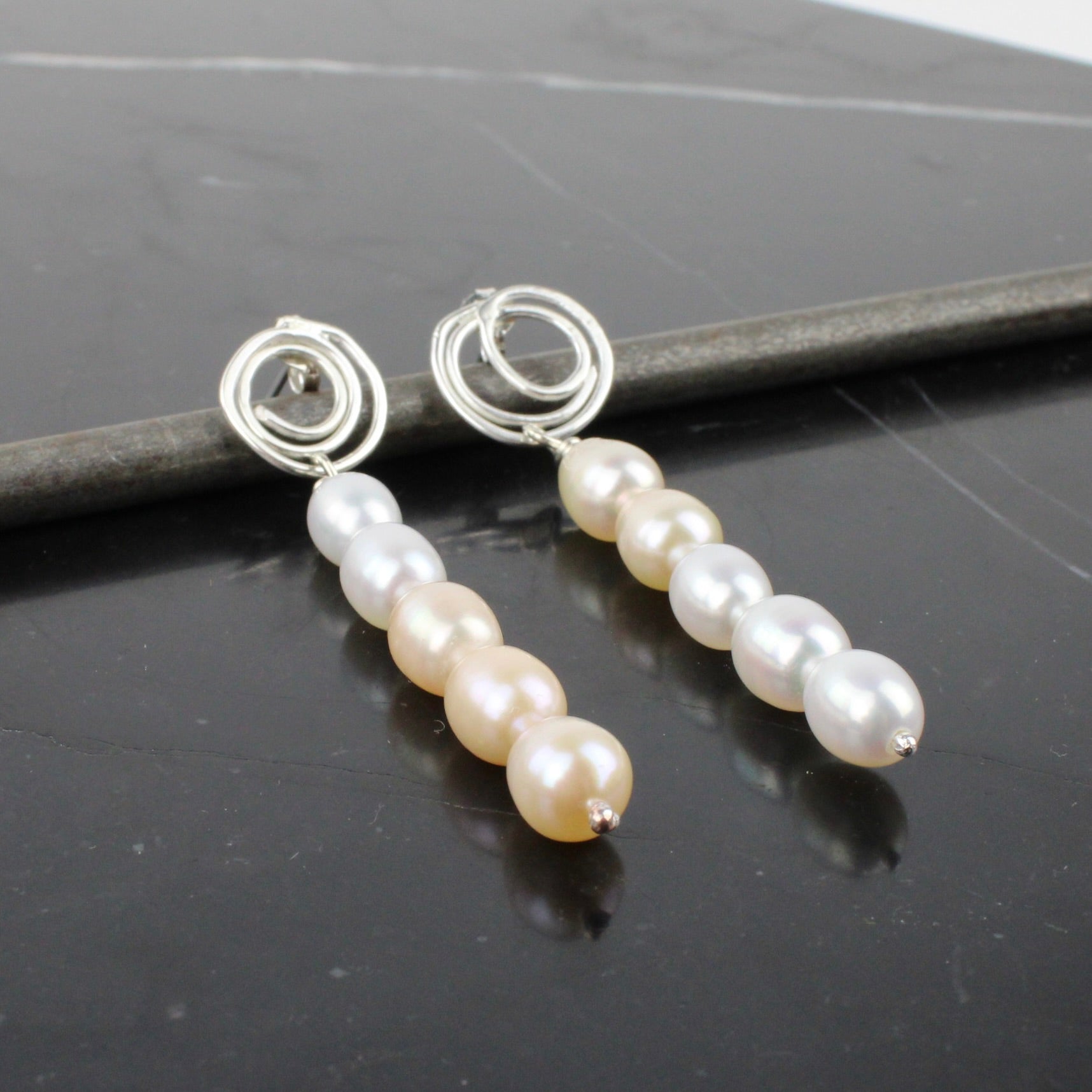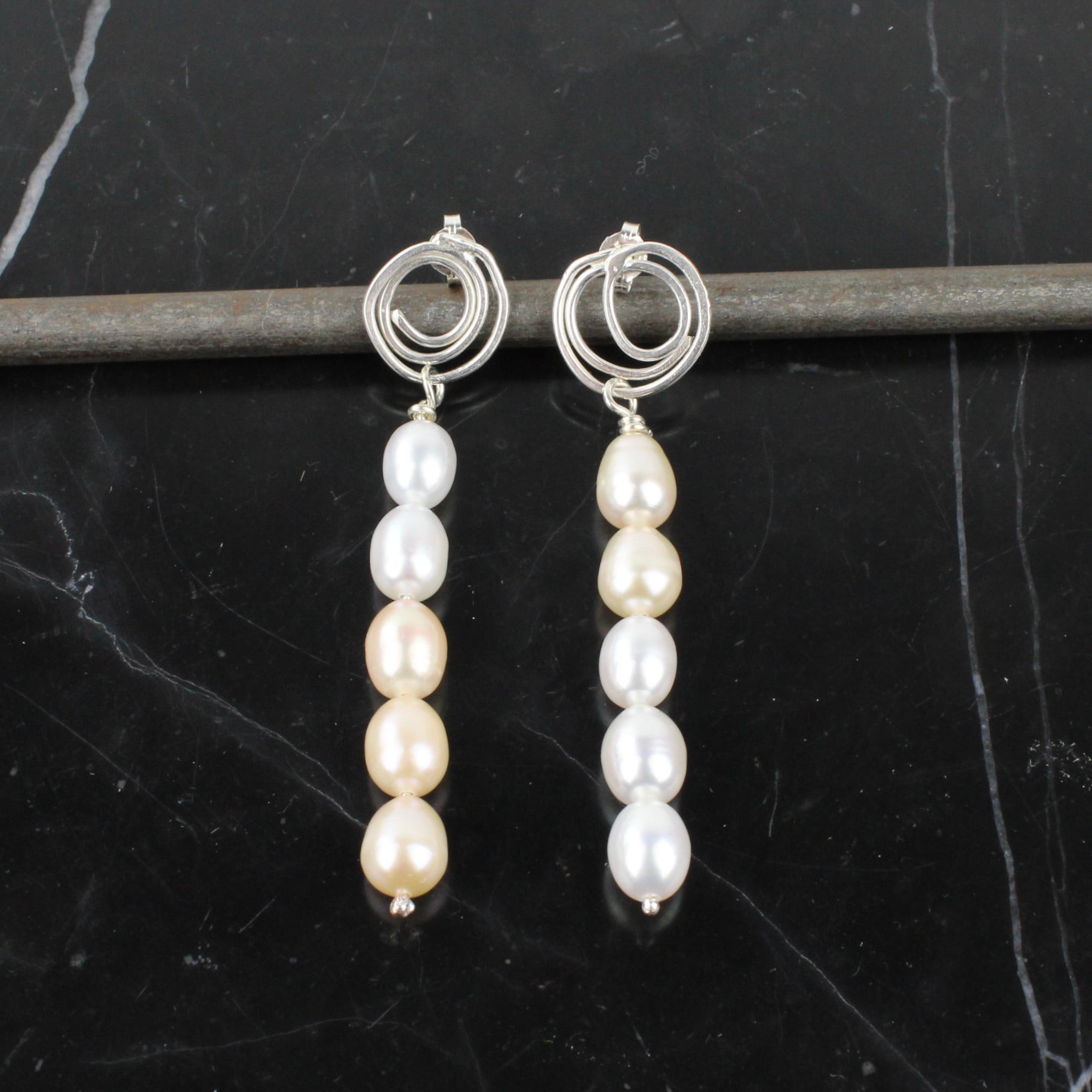 Sterling silver and freshwater white and peach sublte two-tone pearls strung on silk