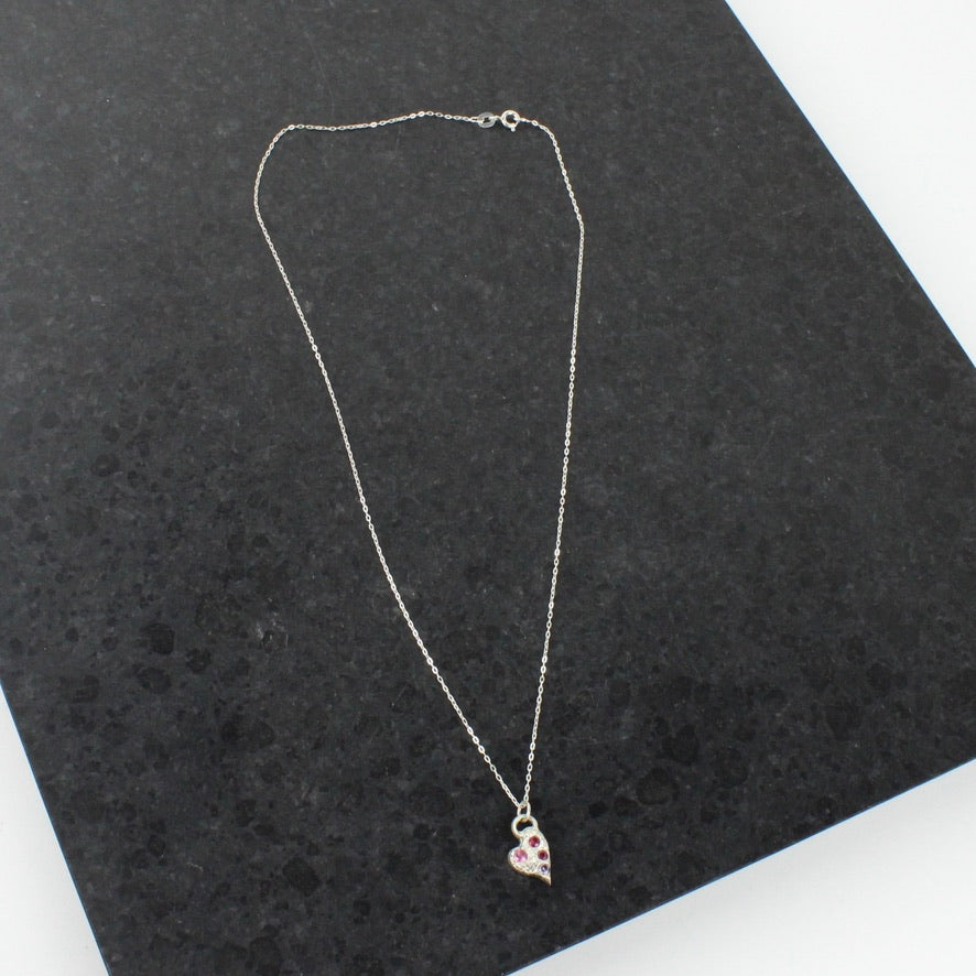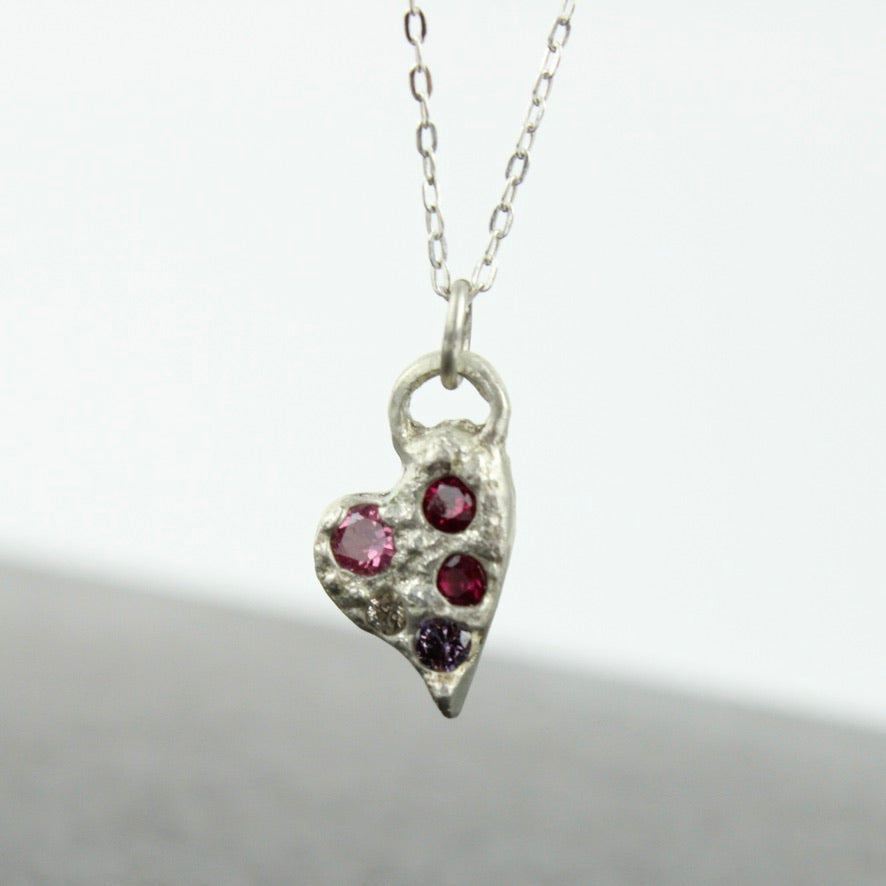 Silver heart pendant with lab grown sapphires on fine silver chain