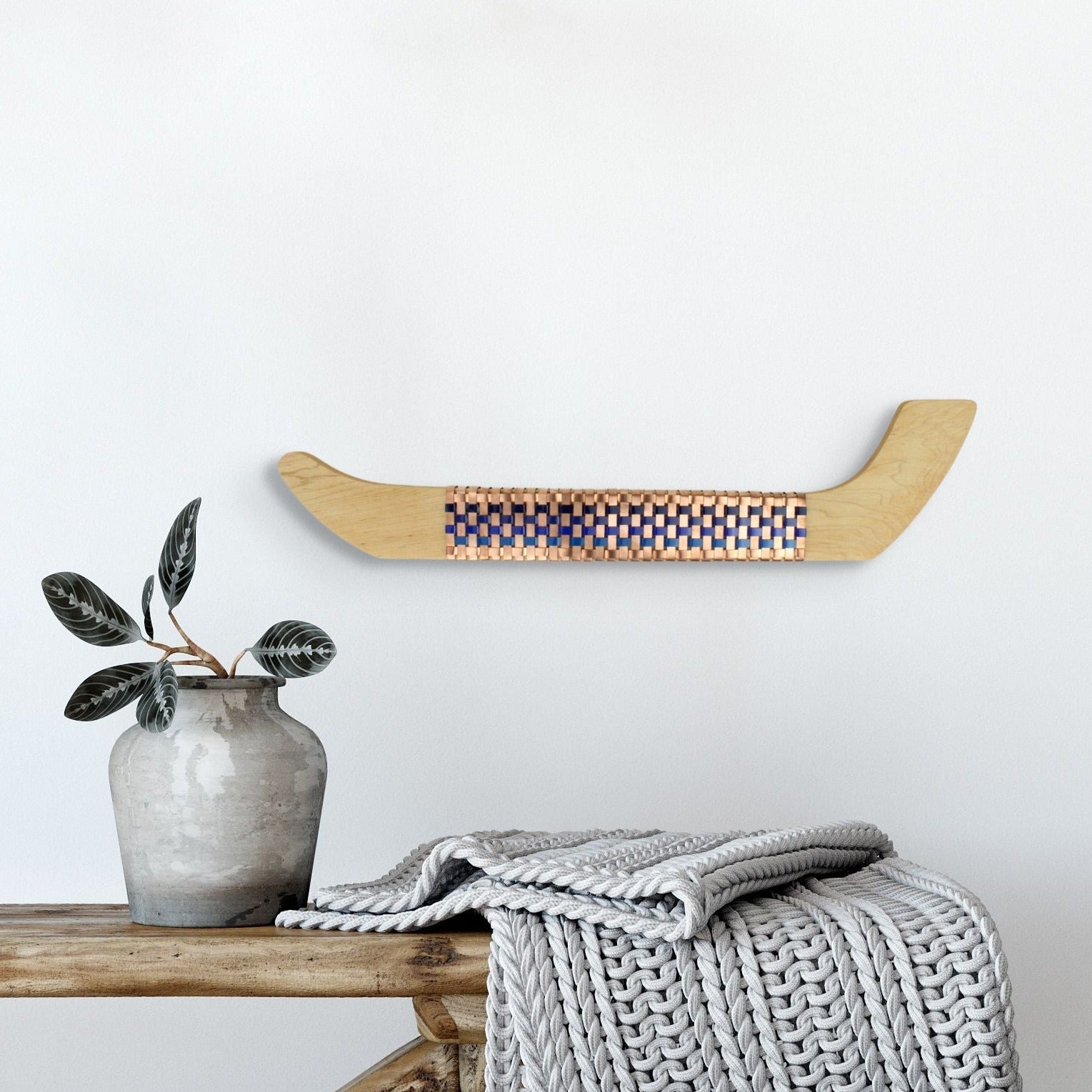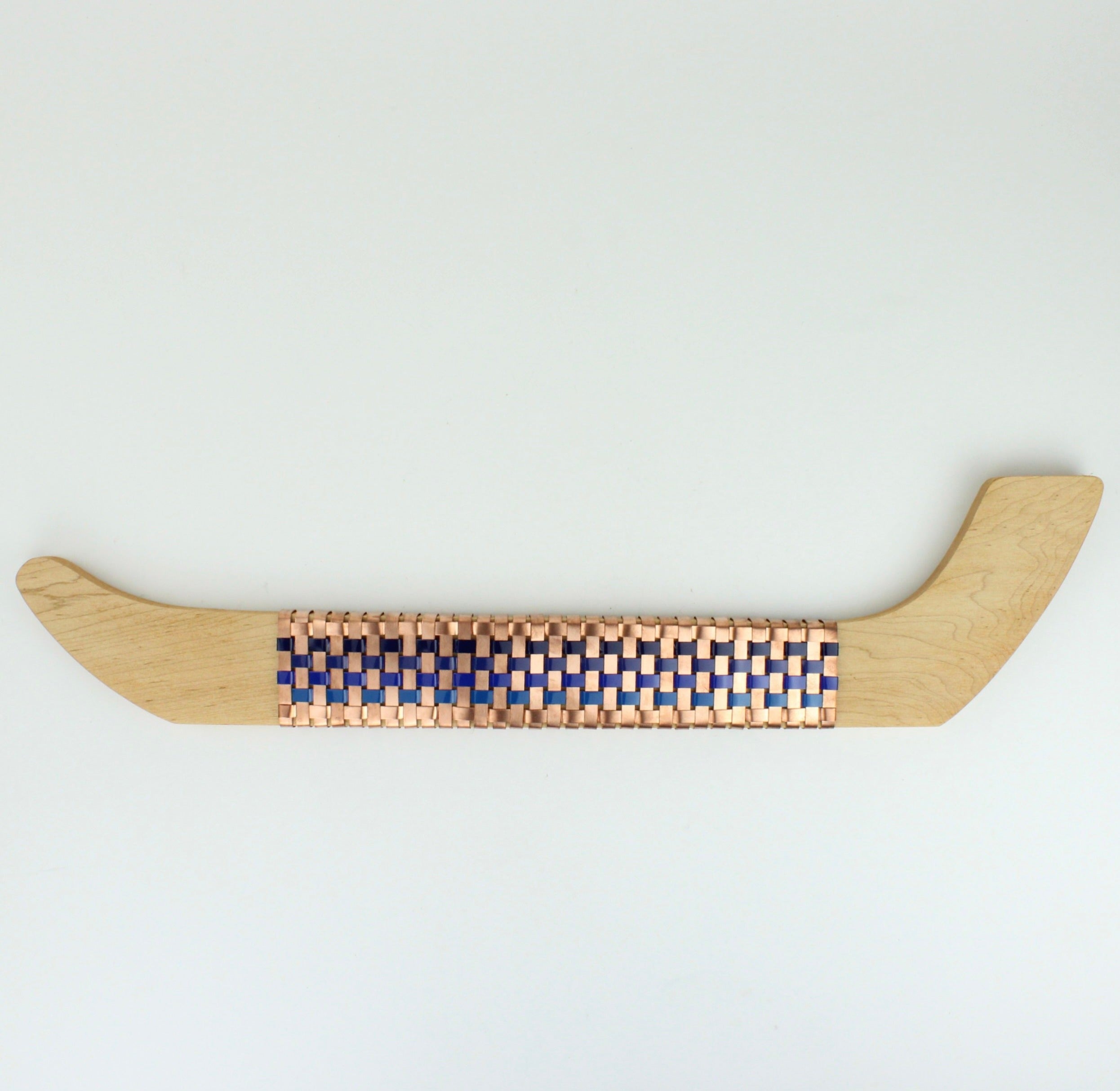 Wall mounted wooden Matai waka with handwoven copper and powder coated aluminium.